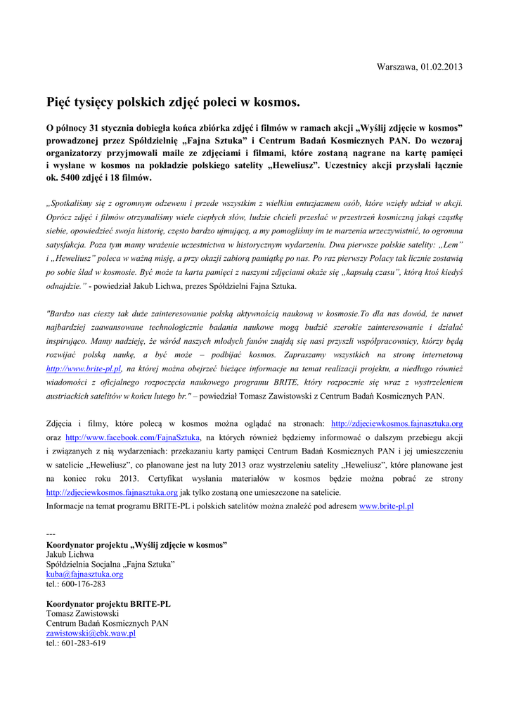 Warszawa, 01.02.2013 Pięć tysięcy polskich zdjęć poleci w kosmos. O północy 31 stycznia dobiegła końca zbiórka zdjęć i filmów w ramach akcji „Wyślij zdjęcie w kosmos” prowadzonej przez Spółdzielnię „Fajna Sztuka” i Centrum Badań Kosmicznych PAN. Do wczoraj organizatorzy przyjmowali maile ze zdjęciami i filmami, które zostaną nagrane na kartę pamięci i wysłane w kosmos na pokładzie polskiego satelity „Heweliusz”. Uczestnicy akcji przysłali łącznie ok. 5400 zdjęć i 18 filmów. „Spotkaliśmy się z ogromnym odzewem i przede wszystkim z wielkim entuzjazmem osób, które wzięły udział w akcji. Oprócz zdjęć i filmów otrzymaliśmy wiele ciepłych słów, ludzie chcieli przesłać w przestrzeń kosmiczną jakąś cząstkę siebie, opowiedzieć swoja historię, często bardzo ujmującą, a my pomogliśmy im te marzenia urzeczywistnić, to ogromna satysfakcja. Poza tym mamy wrażenie uczestnictwa w historycznym wydarzeniu. Dwa pierwsze polskie satelity: „Lem” i „Heweliusz” poleca w ważną misję, a przy okazji zabiorą pamiątkę po nas. Po raz pierwszy Polacy tak licznie zostawią po sobie ślad w kosmosie. Być może ta karta pamięci z naszymi zdjęciami okaże się „kapsułą czasu”, którą ktoś kiedyś odnajdzie.” - powiedział Jakub Lichwa, prezes Spółdzielni Fajna Sztuka. "Bardzo nas cieszy tak duże zainteresowanie polską aktywnością naukową w kosmosie.To dla nas dowód, że nawet najbardziej zaawansowane technologicznie badania naukowe mogą budzić szerokie zainteresowanie i działać inspirująco. Mamy nadzieję, że wśród naszych młodych fanów znajdą się nasi przyszli współpracownicy, którzy będą rozwijać polską naukę, a być może – podbijać kosmos. Zapraszamy wszystkich na stronę internetową http://www.brite-pl.pl, na której można obejrzeć bieżące informacje na temat realizacji projektu, a niedługo również wiadomości z oficjalnego rozpoczęcia naukowego programu BRITE, który rozpocznie się wraz z wystrzeleniem austriackich satelitów w końcu lutego br." – powiedział Tomasz Zawistowski z Centrum Badań Kosmicznych PAN. Zdjęcia i filmy, które polecą w kosmos można oglądać na stronach: http://zdjeciewkosmos.fajnasztuka.org oraz http://www.facebook.com/FajnaSztuka, na których również będziemy informować o dalszym przebiegu akcji i związanych z nią wydarzeniach: przekazaniu karty pamięci Centrum Badań Kosmicznych PAN i jej umieszczeniu w satelicie „Heweliusz”, co planowane jest na luty 2013 oraz wystrzeleniu satelity „Heweliusz”, które planowane jest na koniec roku 2013. Certyfikat wysłania materiałów w kosmos będzie można pobrać http://zdjeciewkosmos.fajnasztuka.org jak tylko zostaną one umieszczone na satelicie. Informacje na temat programu BRITE-PL i polskich satelitów można znaleźć pod adresem www.brite-pl.pl --Koordynator projektu „Wyślij zdjęcie w kosmos” Jakub Lichwa Spółdzielnia Socjalna „Fajna Sztuka” [email protected] tel.: 600-176-283 Koordynator projektu BRITE-PL Tomasz Zawistowski Centrum Badań Kosmicznych PAN [email protected] tel.: 601-283-619 ze strony
