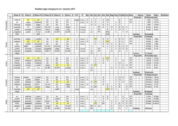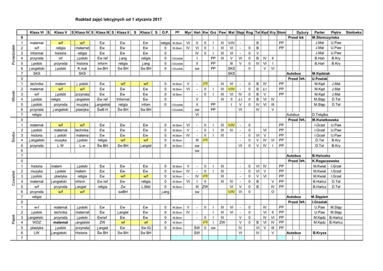 Piątek Czwartek Środra Wtorek Poniedziałek Rozkład zajęć lekcyjnych od 1 stycznia 2017 0 1 2 3 4 5 6 7 0 1 2 3 4 5 6 7 0 1 2 3 4 5 6 7 0 1 2 3 4 5 6 7 0 1 2 3 4 5 6 7 Klasa VI S Klasa V matemat w/f Informat przyroda j.polski j.angielski SKS w/f religia historia inf przyroda j.polski technika matemat w/f j.polski j.polski przyroda religia matem w/f j.polski religia przyroda j.angielski matemat j.polski historia j.angielski przyroda w/f matemat j. polski muzyka LW historia muzyka j.polski matemat w/f przyroda religia matem j.polski plastyka j.angielski przyroda w/f w-f j.polski j.angielski WDZ plastyka LW matemat technika przyroda matemat j.polski j.angielski S Klasa IV S Klasa III S Klasa II w/f matemat religia j.polski historia K.mat SKS Ew Ew Ew Ew /wf inform św.BH j. polski w/f przyroda j.angielski muzyka plastyka Ew Ew Ew Ew /wf j.angielski ŚwB H w/f technika matema j.polski L-w j.polski matem religia inform j.angiel w/f Ew Ew Ew religia Św BH Ew Ew Ew Ew /wf religia Ew Ew Ew j.ang religia Sw BH w/f Ew Ew Informat religia Św BH Ew Ew Ew w/f Sw BH Ew Ew w/f Ew Zw swBH S Klasa I S Ew Ew Ew religia j.ang Sw BH w/f Ew Ew Ew infom Sw BH Ew Ew Ew w/f j.angiel Ew Ew w/f religia L.Bibl O.P. PP religia 0 0 0 0 0 M.Słom 0 0 0 0 0 M.Słom Myr Hań Kw Grz Paw Mal Stęp Rog Tel Kęd Kry Słom VI IV I.Grzelak I.Grzelak I.Grzelak M.Słom M.Słom V VI M.Słom I.Grzelak I.Grzelak 0 0 0 0 0 0 0 0 0 0 j.ang M.Słom M.Słom M.Słom VI V IV M.Słom M.Słom M.Słom M.Słom M.Słom M.Słom V IV VI M.Słom 0 VI IV I II sw II II II V II sw VI I/ II III sw sw II II II I/ II II II I I I PP PP PP I I III III III III III III III III PP PP II II IV I/ II I II III ZW sw I I I I I III III III III III III III V/IV VI VI V III SKS SKS VI V VI V/IV VI II I IV z.r V VI V/IV IV IV VI V/IV 0 0 0 0 0 B B V B IV PP PP IV VI V II I VI Dyżury Parter Piętro Przed lek M.Słomczyńska J.Mal U.Paw J.Mal U.Paw J.Mal U.Paw B.Hań B.Kry B.Hań B.Kry Autobus lek. Przed lek VI V VI 0 0 0 0 0 0 0 0 0 0 0 0 0 0 0 0 B IV B z.r B V B VI IV VI IV VI V V VI VI V B B VI V IV IV PP PP PP IV III V VI I IV V VI V IV O Ew Ew Ew/wf ZW j.angiel Św BH Ew j.angiel Ew wf Ew Sw BH Ew Ew Ew wf Sw IG Sw BH 0 0 0 0 0 M.Słom M.Słom M.Słom M.Słom M.Słom V IV - II I I II I I/ II I SW II sw SW III III III ZW VI VI V V IV VI 0 0 0 0 B VI IV IV VI IV VI V II VI IV III V J.Mal J.Mal J.Mal D.Tel D.Tel Autobus lek. Przed lek D.Telążka M.Kwiatkowska I.Grzel U.Paw I.Grzel U.Paw I.Grzel U.Paw D.Tel B.Kry D.Tel B.Kry Autobus lek. Przed lek B.Hańczka K.Rogaczewska M.Kwiat I.Grzel M.Kwiat I.Grzel M.Kwiat I.Grzel B.Hańcz D.Tel B.Hańcz D.Tel PP PP PP PP PP PP PP PP PP PP Autobus lek. Przed lek j.polski matemat j.polski j.angielski przyroda Historia M.Kędziak U.Pawlak M.Kęd M.Kęd M.Kęd M.Stęp M.Stęp PP PP PP PP PP Autobus M.Stępień I.Grzelak U.Paw U.Paw M.Kędz M.Kędz B.Kryza M.Stęp M.Stęp B.Hańcz B.Hańcz Stołówka
