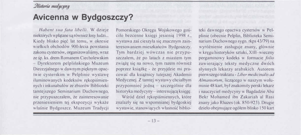 Avicenna w Bydgoszczy? Habent sua fata libelli. W dzieje Pomorskiego Okręgu Wojskowego goś teki dawnego opactwa cystersów w Pel niektórych wplątane są również losy ludzi„. ciło bezcenne księgi jesienią 1998 r„ plinie (obecnie Pelplin, Biblioteka Semi narium Duchownego sygn. rkps 43/79) na Kiedy blisko pięć lat temu, w okresie wystawa zaś cieszyła się znacznym zain wielkich obchodów 900-lecia powstania teresowaniem mieszkańców Bydgoszczy. wyróżnienie zasługuje znany, głównie zakonu cystersów, organizowaliśmy, wraz Tym bardziej wówczas nie przypu w kręgu historyków sztuki, Xlll-wieczny folio ze śp. ks. drem Romanem Ciecholewskim szczałem, że po latach z miastem tym pergaminowy kodeks w formacie - Dyrektorem pelplińskiego Muzeum zwiążę się na nowo, tym razem również zawierający teksty medyczne dwóch Diecezjalnego w dawnym pięknym opac poprzez książkę - że przyjdzie mi pra słynnych lekarzy arabskich. Autorem twie cysterskim w Pelplinie wystawę cować dla książnicy tutejszej Akademii pierwszego traktatu iluminowanych kodeksów rękopiśmien Medycznej. Z tamtej wystawy chciałbym Almansorum, - Liber medicinalis ad liczącego w naszym wolu nych i inkunabułów ze zbiorów Biblioteki przypomnieć jedną - szczególnie dla minie 48 kart, był znakomity perski lekarz tamtejszego Seminarium Duchownego, historyka medycyny- interesującą księgę. i nauczyciel medycyny w Bagdadzie Abu nie przypuszczałem, że zainteresowanie W śród dzieł rękopiśmiennych, które Bekr Mohamed ibn Zakariah al Rasi przeniesieniem tej ekspozycji wykaże znalazły się na wspomnianej bydgoskiej znany jako Rhazes (ok. 850-923). Drugie właśnie Bydgoszcz. Muzeum Tradycji wystawie, stanowiących własność biblio- dzieło obejmujące ogółem blisko150 kart -13- Wiadomości Akademickie to najsłynniejszy arabski traktat Canon medicinae cieszącego się niezwykłą sławą tadżyckiego lekarza i przyrodnika z Bu chary Avicenny (Abu Ali al Husein ibn Księga praw Sina, 980-1037). Canon medycyny oparta głównie na Galenie dzięki całościowemu ujęciu medycyny i jasności wykładu stała się niezwykle poczytna wśród lekarzy arabskich i europejskich, zaś Avicenna zyskał sobie dzięki niej przydomek księcia lekarzy. Omawiany kodeks uznać można za dzieło skopiowane w północnej Francji, z dużym prawdopodobieństwem w jed nym z licznie działających w XllI stuleciu skryptoriów Paryża. Trafił on do zbiorów pelplińskich cystersów najprawdopo dobniej zakupiony przez któregoś z opa tów jak wzmiankuje kronika klasztorna nader często wyjeżdżających do Francji na posiedzenia Kapituły Generalnej. Cechami, które pozwalają włączyć kodeks ten do grupy manuskryptów produkcji paryskiej jest jedwabisty, cienki pergamin, staranne pismo oraz harmonia w zestawianiu poszczególnych elemen tów dekoracji i rozmieszczeniu ich pomię dzy kolumnami tekstu. Powszechna praktyka uzupełniania ksiąg iluminacjami, czyli dekoracją figuratywną bądź roślinną i ornamentalną, wprowadzania ozdobnej pierwszej litery - zwanej inicjałem - rozpoczynającej rozdział, wynikała z potrzeby artykulacji tekstu dla nadania mu przejrzystości, podkreślenia jego treści w celu lepszego zrozumienia, a także dla podniesienia walorów estetycznych dzieła. Zarówno tekst Rhazesa, jak i Avicenny (do karty I 38) otrzymały precyzyjnie wykonaną zróżnicowaną dekorację, na którą złożyło się dziewięć (w tym sześć złoconych) inicjałów roślinno zoomorficznych, jeden figuralny oraz dwie laski margi nalne, zdobiące karty rozpoczynające tekst obu autorów. Na wyróżnienie zasługuje scena wpisana w inicjał „D" (k. 50v, która pięknie zdobi okładkę obec nego numeru Wiadomości) ukazująca najprawdopodobniej Avicennę, twórcę traktatu, zasiadającego na katedrze ze wspartą na niej księgą i nauczającego zgromadzonych wokół i skupionych na lekturze uczniów. Do wykonania wszyst kich inicjałów użyto barw charaktery stycznych dla paryskiego malarstwa książkowego: złota płatkowego, jako tła dla zdobień, ultramaryny, różu i cynobru. Kodeks pelpliński jest o tyle ciekawy, że nie stanowi jednorodnej całości. Od karty 139 zarówno iluminacje, dukt pisma jak i inkaust a także pergamin znacznie odstają od pierwszej części woluminu. Stąd wniosek, iż manuskrypt powstać musiał w dwóch miejscach: pierwsza część w jednym ze skryptoriów paryskich, • -----��-----� Avicenna „ Canon medicinae ·· rkps. 43179 str 170 a druga słabsza pod względem warszta towym, ozdobiona wyłącznie skromnymi inicjałami filigranowymi najprawdopo dobniej na miejscu w Pelplinie. Trudno ustalić co zmusiło zakonników do pracy nad dokończeniem dzieła Avicenny. Czy pelplińscy opaci zakupili kodeks nie w pełni gotowy? A może uległ on zni szczeniu i wówczas skrupulatni cystersi przystąpili do uzupełnienia brakującej części? I wreszcie skąd pochodziło źródło, na podstawie którego przepisano braku jący fragment traktatu? Dziś już tajemnice te pozostaną pewnie bez wyjaśnienia. Fakt zaś starannego - choć może mniej wpraw nego od francuskich kopistów - prze pisania rękopisu świadczy zarówno o wielkiej kulturze książki w zakonie cysterskim, jak i o popularności dzieła Avicenny w pelplińskim opactwie. Na powszechne użytkowanie kodeksu w mu- 14 1•. rach klasztoru wskazuje również oprawa w białą świńską skórę na deskach bez zdobień posiadająca wyraźne ślady inkatenacji pulpitowej. Wiadomo bo wiem, że stałe przytwierdzanie ksiąg łańcuchami do pulpitów wynikało nie tylko z wielkiej wartości woluminu, ale również z potrzeby jego ciągłej ekspozycji dla czytelników. Wolumin zawierający wspomniane dwa dzieła Rhazesa i Avicenny należy bez wątpienia do najpiękniejszych i najccn n iejszych średniowiecznych manu skryptów medycznych przechowywanych w zbiorach Polski. Tym bardziej więc cieszy, iż ekspo