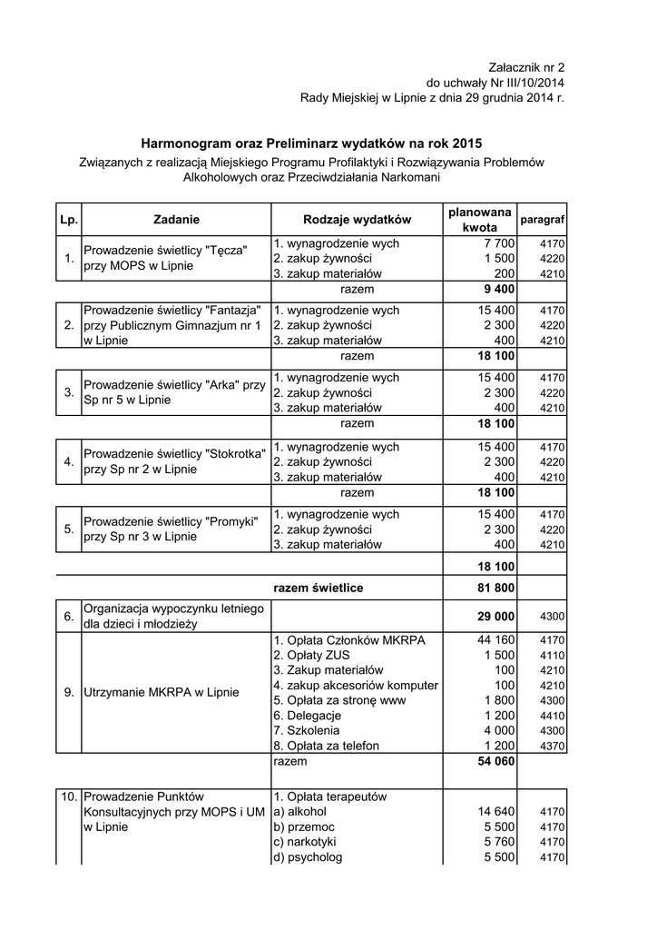 Załacznik nr 2 do uchwały Nr III/10/2014 Rady Miejskiej w Lipnie z dnia 29 grudnia 2014 r. Harmonogram oraz Preliminarz wydatków na rok 2015 Związanych z realizacją Miejskiego Programu Profilaktyki i Rozwiązywania Problemów Alkoholowych oraz Przeciwdziałania Narkomani Lp. 1. Zadanie Prowadzenie świetlicy "Tęcza" przy MOPS w Lipnie 4. 5. 1. wynagrodzenie wych 2. zakup żywności 3. zakup materiałów razem planowana paragraf kwota 4170 7 700 1 500 4220 200 4210 9 400 1. wynagrodzenie wych 2. zakup żywności 3. zakup materiałów razem 15 400 2 300 400 18 100 4170 4220 4210 1. wynagrodzenie wych Prowadzenie świetlicy "Arka" przy 2. zakup żywności Sp nr 5 w Lipnie 3. zakup materiałów razem 15 400 2 300 400 18 100 4170 4220 4210 1. wynagrodzenie wych Prowadzenie świetlicy "Stokrotka" 2. zakup żywności przy Sp nr 2 w Lipnie 3. zakup materiałów razem 15 400 2 300 400 18 100 4170 4220 4210 1. wynagrodzenie wych 2. zakup żywności 3. zakup materiałów 15 400 2 300 400 4170 4220 4210 Prowadzenie świetlicy "Fantazja" 2. przy Publicznym Gimnazjum nr 1 w Lipnie 3. Rodzaje wydatków Prowadzenie świetlicy "Promyki" przy Sp nr 3 w Lipnie 18 100 razem świetlice 6. Organizacja wypoczynku letniego dla dzieci i młodzieży 9. Utrzymanie MKRPA w Lipnie 1. Opłata Członków MKRPA 2. Opłaty ZUS 3. Zakup materiałów 4. zakup akcesoriów komputer 5. Opłata za stronę www 6. Delegacje 7. Szkolenia 8. Opłata za telefon razem 1. Opłata terapeutów 10. Prowadzenie Punktów Konsultacyjnych przy MOPS i UM a) alkohol b) przemoc w Lipnie c) narkotyki d) psycholog 81 800 29 000 4300 44 160 1 500 100 100 1 800 1 200 4 000 1 200 54 060 4170 4110 4210 4210 4300 4410 4300 4370 14 640 5 500 5 760 5 500 4170 4170 4170 4170 1. Opłata za pomieszczenie w MOPS 2. energia MOPS razem Usuwanie skutków zdrowotnych członków rodzin z problemem 11. alkoholowym i narkomania w Lipnie 1. Konsultacje i opinie biegłych sądowych, zakup środków wspomagających leczenie odwykowe 2. Terapia dla uzależnionych i DDA od alkoholu 3. Grupa wsparcia dla uzależnionych 4. prowadzenie Grupy rodzinnej 5.Prowadzenie poradni ulicznej a) opłaty ZUS 6.Prowadzenie młodzieżowego klubu profilaktycznego przy Parafii Bł.M.Kozala w Lipnie a) wynagrodzenia b) zakup materiałów c) zakup usług pozostałych d) zakup żywności razem Działania profilaktyczne 12. adresowane do mieszkańców Lipna 1. Kampania "Zachowaj Trzeźwy Umysł" 2. zakup materiałów i wyposażenia m.in. zakup architektury zabawowej na place zabaw z których korzystają dzieci ze świetlic 2. Spektakle i koncerty profilaktyczne 3. Dofinansowanie innych działań profilaktycznych 4. prowadzenie zajęć z prof. Z narkomanii 5. Dofinansowanie wyjazdów na dni skupienia modlitewnego do Częstochowy i Lichenia 6. Dofinansowanie "Biesiady bezalkoholowej) razem razem wydatki 10 000 2 000 43 400 4210 4260 13 800 4300 14 000 4170 14 940 4170 5 200 4170 5 800 4170 1 000 4110 8 100 170 1 000 850 64 860 4170 4210 4300 4220 8000 4210 10 300 4210 5 000 4300 6 680 4300 2 000 4170 2 400 4300 2 500 4300 36 880 310 000 85153 4110 4170 4210 4220 4300 2015 1 000 21 660 170 850 1 000 24 680 85154 4110 4170 4210 4220 4260 4300 4370 4410 razem 1 500,00 173 240,00 30 300,00 10 700,00 2 000,00 65 180,00 1 200,00 1 200,00 285 320,00 310 000,00