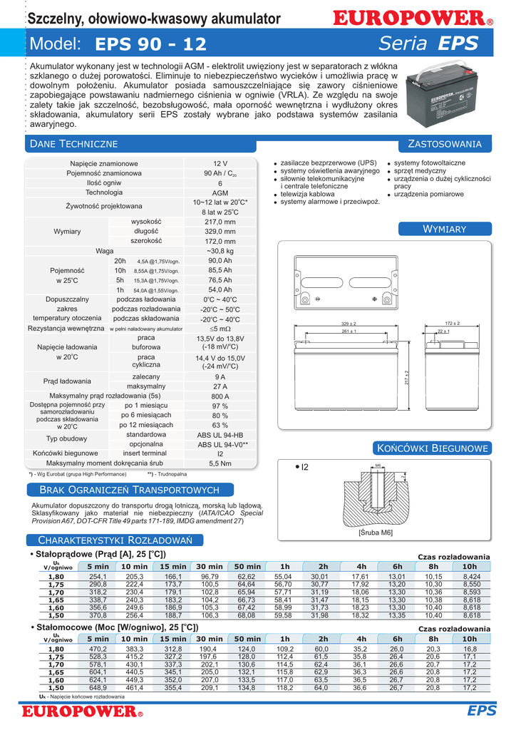 EUROPOWER Szczelny, o³owiowo-kwasowy akumulator Model: EPS 90 - 12 R Seria EPS Akumulator wykonany jest w technologii AGM - elektrolit uwiêziony jest w separatorach z w³ókna szklanego o du¿ej porowatoœci. Eliminuje to niebezpieczeñstwo wycieków i umo¿liwia pracê w dowolnym po³o¿eniu. Akumulator posiada samouszczelniaj¹ce siê zawory ciœnieniowe zapobiegaj¹ce powstawaniu nadmiernego ciœnienia w ogniwie (VRLA). Ze wzglêdu na swoje zalety takie jak szczelnoœæ, bezobs³ugowoœæ, ma³a opornoœæ wewnêtrzna i wyd³u¿ony okres sk³adowania, akumulatory serii EPS zosta³y wybrane jako podstawa systemów zasilania awaryjnego. DANE TECHNICZNE ZASTOSOWANIA 12 V 90 Ah / C20 6 AGM o 10~12 lat w 20 C* o 8 lat w 25 C 217,0 mm 329,0 mm 172,0 mm ~30,8 kg 90,0 Ah 85,5 Ah 76,5 Ah 54,0 Ah o o 0 C ~ 40 C o o -20 C ~ 50 C o o -20 C ~ 40 C £5 mW 13,5V do 13,8V o (-18 mV/ C) Napiêcie znamionowe Pojemnoœæ znamionowa Iloœæ ogniw Technologia ¯ywotnoœæ projektowana wysokoœæ d³ugoœæ szerokoœæ Waga Dopuszczalny zakres temperatury otoczenia Rezystancja wewnêtrzna 20h 4,5A @1,75V/ogn. 10h 8,55A @1,75V/ogn. 5h 15,3A @1,75V/ogn. 1h 54,0A @1,55V/ogn. podczas ³adowania podczas roz³adowania podczas sk³adowania w pe³ni na³adowany akumulator praca buforowa praca cykliczna Napiêcie ³adowania o w 20 C 172 ± 2 329 ± 2 261 ± 1 22 ± 1 14,4 V do 15,0V o (-24 mV/ C) zalecany maksymalny Maksymalny pr¹d roz³adowania (5s) Dostêpna pojemnoœæ przy po 1 miesi¹cu samoroz³adowaniu po 6 miesi¹cach podczas sk³adowania po 12 miesi¹cach w 20oC standardowa Typ obudowy opcjonalna Koñcówki biegunowe insert terminal Maksymalny moment dokrêcania œrub 9A 27 A 800 A 97 % 80 % 63 % ABS UL 94-HB ABS UL 94-V0** I2 5,5 Nm Pr¹d ³adowania *) - Wg Eurobat (grupa High Performance) WYMIARY 217 ± 2 Pojemnoœæ o w 25 C ! systemy fotowoltaiczne ! sprzêt medyczny ! urz¹dzenia o du¿ej cyklicznoœci pracy ! urz¹dzenia pomiarowe KOÑCÓWKI BIEGUNOWE I2 **) - Trudnopalna M6 2 Wymiary ! zasilacze bezprzerwowe (UPS) ! systemy oœwietlenia awaryjnego ! si³ownie telekomunikacyjne i centrale telefoniczne ! telewizja kablowa ! systemy alarmowe i przeciwpo¿. BRAK OGRANICZEÑ TRANSPORTOWYCH Akumulator dopuszczony do transportu drog¹ lotnicz¹, morsk¹ lub l¹dow¹. Sklasyfikowany jako materia³ nie niebezpieczny (IATA/ICAO Special Provision A67, DOT-CFR Title 49 parts 171-189, IMDG amendment 27) [Œruba M6] CHARAKTERYSTYKI ROZ£ADOWAÑ o • Sta³opr¹dowe (Pr¹d [A], 25 [ C]) Uk V/ogniwo 1,80 1,75 1,70 1,65 1,60 1,50 5 min 254,1 290,8 318,2 338,7 356,6 370,8 10 min 205,3 222,4 230,4 240,3 249,6 256,4 15 min 166,1 173,7 179,1 183,2 186,9 188,7 30 min 96,79 100,5 102,8 104,2 105,3 106,3 50 min 62,62 64,64 65,94 66,73 67,42 68,08 1h 55,04 56,70 57,71 58,41 58,99 59,58 2h 30,01 30,77 31,19 31,47 31,73 31,98 4h 17,61 17,92 18,06 18,15 18,23 18,32 6h 13,01 13,20 13,30 13,30 13,30 13,35 Czas roz³adowania 8h 10h 10,15 8,424 10,30 8,550 10,36 8,593 10,38 8,618 10,40 8,618 10,40 8,618 50 min 124,0 128,0 130,6 132,1 133,5 134,8 1h 109,2 112,4 114,5 115,8 117,0 118,2 2h 60,0 61,5 62,4 62,9 63,5 64,0 4h 35,2 35,8 36,1 36,3 36,5 36,6 6h 26,0 26,4 26,6 26,6 26,7 26,7 Czas roz³adowania 8h 10h 20,3 16,8 20,6 17,1 20,7 17,2 20,8 17,2 20,8 17,2 20,8 17,2 o • Sta³omocowe (Moc [W/ogniwo], 25 [ C]) Uk V/ogniwo 1,80 1,75 1,70 1,65 1,60 1,50 5 min 470,2 528,3 578,1 604,1 624,1 648,9 10 min 383,3 415,2 430,1 440,5 449,3 461,4 15 min 312,8 327,2 337,3 345,1 352,0 355,4 30 min 190,4 197,6 202,1 205,0 207,0 209,1 Uk - Napiêcie koñcowe roz³adowania EUROPOWER R EPS EPS 90 - 12 ¯ywotnoœæ akumulatora przy pracy buforowej ¯ywotnoœæ akumulatora przy pracy cyklicznej 14 Temperatura: 20[oC] Projektowana ¿ywotnoœæ [lata] 12 Napiêcie ³adowania 2.275 V/ogniwo 10 120 100 8 Pojemnoœæ [%] 6 4 80 60 g³êbokoœæ roz³adowania 100[%] 40 2 g³êbokoœæ roz³adowania 80[%] g³êbokoœæ roz³adowania 50[%] g³êbokoœæ roz³adowania 30[%] 20 0 20 30 40 0 50 0 200 400 600 o Temperatura pracy [ C] 800 1000 1200 Liczba cykli Charakterystyki roz³adowania akumulatora Charakterystyki samoroz³adowania akumulatora 100 13.0 Temperatura: 25[oC] Zachowana pojemnoœæ [%] 12.0 Napiêcie [V] 11.0 22.5[A] 8.55[A] 4.5[A] 10.0 0.25[A] 54[A] 9.0 8.0 270[A] 180[A] 7.0 1 2 3 5 10 5[oC] 60 40[oC] 30[oC] 20[oC] 40 90[A] 20 30 80 60 2 3 [min] 5 10 20 30 0 2 4 6 8 10 12 14 16 18 20 Okres sk³adowania [miesi¹ce] [h] Czas roz³adowania 0.15 0.12 0.09 0.06 Napiêcie ³adowania 13.0 Poziom na ³adowania 12.0 15.0 120 0.18 14.0 100 80 Roz³adowanie 100% (0.05C[A] x 20[h]) 50% (0.05C[A] x 10[h]) £adowanie sta³onapiêciowe: 2.275[V/ogniwo] sta³opr¹dowe: 0.1C[A] o Temperatura: 20[ C] 11.0 10.0 0.03 60 40 20 Napiêcie ³adowania 120 Poziom na³ad 0.15 0.12 0.09 0.06 0 0 5 10 15 20 Czas ³adowania [h] 25 owania 13.0 100 12.0 80 Roz³adowanie 100% (0.05C[A] x 20[h]) 50% (0.05C[A] x 10[h]) £adowanie sta³onapiêciowe: 2.45[V/ogniwo] sta³opr¹dowe: 0.1C[A] o Temperatura: 20[ C] 11.0 10.0 60 40 0.03 20 Pr¹d ³adowania Pr¹d ³adowania 0 140 Poziom na³adowania akumulatora [%] 14.0 0.21 Napiêcie ³adowania [V] 0.18 140 Pr¹d ³adowania [CxA] 15.0 Charakterystyki ³adowania przy pracy cyklicznej Poziom na³adowania akumulatora [%] 0.21 Napiêcie ³adowania [V] Pr¹d ³adowania [CxA] Charakterystyki ³adowania przy pracy buforowej 0 0 0 0 5 10 15 20 Czas ³adowania [h] 25 0 Dopuszczalne koñcowe napiêcia roz³adowania akumulatora Pr¹d roz³adowania [A] 18 > I 18 £ I < 45 45 £ I < 90 90 £ I Koñcowe napiêcie roz³adowania [V/ogniwo] 1.75 1.70 1.55 1.30 Pb *) C - pojemnoœæ akumulatora data wydania: 31.10.2009; numer zmiany: 0; data zmiany: 30.11.2009 EUROPOWER R EPS