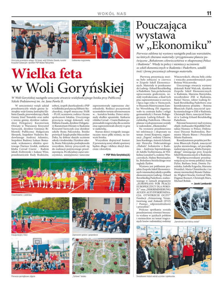 11 WOKÓŁ NAS Pouczająca wystawa w ,,Ekonomiku” Uroczyste przecięcie wstęgi. Od lewej: wójt Elżbieta Zasada, kurator Krzysztof Szewczyk i dyrektor PSP Beata Pałczyńska Siatkarska rozgrzewka Wielka feta w Woli Goryńskiej W Woli Goryńskiej nastąpiło uroczyste otwarcie wielofunkcyjnego boiska przy Publicznej Szkole Podstawowej im. św. Jana Pawła II. W uroczystości wzięli udział przedstawiciele władz gminy Jastrzębia: wójt Gminy Jastrzębia Elżbieta Zasada, przewodniczący Rady Gminy Józef Tomalski oraz radni z terenu gminy, dyrektor radomskiej Delegatury Kuratorium Oświaty w Warszawie Krzysztof Szewczyk, dyrektor Gminnej Biblioteki Publicznej Małgorzata Skwarek, Inspektor Nadzoru Budowlanego Andrzej Adamiec, Inspektor Budowy Łukasz Romaniuk, wykonawca obiektu sportowego Dariusz Godek, siatkarze klubu Cerrad Czarni – Radom Jakub Ziobrowski i Łukasz Wize, przedstawiciele Rady Rodziców, sołtysi, zespół cheerleaderek z PSP w Jedlińsku pod pieczą Elżbiety Stachurskiej, zespół muzyczny FAIR – PLAY, uczniowie, rodzice i liczna społeczność lokalna. Uroczystego przecięcia wstęgi dokonali: wójt Elżbieta Zasada, dyrektor Delegatury Kuratorium Oświaty w Radomiu Krzysztof Szewczyk oraz dyrektor szkoły Beata Pałczyńska. Boisko poświęcił ksiądz prałat Mieczysław Deka, by dobrze służyło uczniom szkoły i środowisku. Dyrektor szkoły, Beata Pałczyńska podziękowała wszystkim, którzy przyczynili się do realizacji pożytecznego przedsięwzięcia. Po oficjalnej części uroczystości, umiejętności taneczne zaprezentowały zaproszone cheerleaderki. Rodzice poczęstowali uczestników tortem uformowanym w… kształcie boiska. Dzieci otrzymały słodkie upominki. Siatkarze z klubu Cerrad – Czarni Radom poprowadzili rozgrzewkę dla uczniów oraz zaprezentowali chwyty w grze w siatkówkę.. Starsze dzieci rozegrały inauguracyjny mecz piłki nożnej, na nowym boisku. Wszystkim dopisywał humor. Z pewnością nowy obiekt sportowy będzie długo i dobrze służył dzieciom i dorosłym. Cheerlinderki z Jedlińska Inauguracyjny mecz Zaproszeni goście i gospodarze Pierwsze pamiątkowe zdjęcie „Tortowe” boisko PSP Wola Goryńska(JL) Pierwsza odsłona tej wystawy nastąpiła podczas warsztatów, na których zbierano materiały i przygotowano plansze poświęcone „Bohaterom człowieczeństwa w okupowanej Polsce i Radomiu”. Wtedy to polscy i niemieccy uczniowie ze szkół ekonomicznych w Radomiu i Paderborn, ustalili treść i formę prezentacji zebranego materiału. Pierwszą prezentację można było zobaczyć w czerwcu w Zespole Szkół Ekonomicznych. Materiały te przekazano do Ludwig– Erhard Berufskolleg w Paderborn. Tam, po fachowym opracowaniu graficznym, zostały wydrukowane, a finał tych prac zaprezentowano w czerwcu i lipcu tego roku w Niemczech, w Muzeum Historycznym Zamku Wewelsburg (SS organizowało tu centrum kultu i religii germańskich) i Forum Pedagogicznym Ludwig-Erhard– Berufskolleg Paderborn. Obecnie plansze wyeksponowane zostały w radomskim „Ekonomiku”. Na wystawie przedstawiono też informacje i eksponaty na temat: Armii Krajowej, organizacji „Żegota”, rodziny Ulmów, Jana Karskiego, Anton’a Schmid, mjr Henryka Dobrzańskiego „Hubala”, bohaterów z Radomia – Andrzeja Szpotańskiego, dr Adolfa Tochtermana, dr Wilhelma Lonsdorf ’a, rodziny Winczewskich, Haliny Bretsznajder, ks. Bolesława Strzeleckiego oraz zagłady Żydów. Wystawa jest pokłosiem projektu Zespołu Szkół Ekonomicznych i niemieckiej szkoły o profilu ekonomicznym Ludwig– Erhard Berufskolleg Paderborn, realizowanego w ramach programów „EUROPEANS FOR PEACE/ EUROPEJCZYCY DLA POKOJU” oraz „DISKRIMINIERUNG: AUGEN AUF!/DYSKRYMINACJA: OTWÓRZCIE OCZY!” Fundacji „Erinnerung, Verantwortung und Zukunft (EVZ) / Pamięć, odpowiedzialność i przyszłość”. Podczas spotkania została przedstawiona również broszura wydana w językach polskim i niemieckim na temat tragicznych losów radomskiej rodziny Winczewskich, obecna była córka i wnuczka pomordowanych pani Bożena Winczewska. Uroczystego otwarcia wystawy dokonali Rafał Walczak, dyrektor Zespołu Szkół Ekonomicznych w Radomiu, Marzena Burzyńska, wicedyrektor ZSE w Radomiu, Rainer Neewe, rektor Ludwig-Erhard-Berufskolleg Paderborn oraz koordynatorzy projektu – Bożena Błaszczyk-Ziętek, nauczyciel języka niemieckiego w ZSE w Radomiu, Christoph Marx, nauczyciel historii w Ludwig-Erhard-Berufskolleg Paderborn. Patronat honorowy nad wystawą objęli: Ambasador Republiki Federalnej Niemiec w Polsce, Ordynariusz Diecezji Radomskiej, Burmistrz Miasta Büren i Prezydent Miasta Radomia. Koordynatorem projektu jest Bożena Błaszczyk-Ziętek, nauczyciel języka niemieckiego, od początku nadzorująca pracę „Klubu Europejskiego” istniejącego przy Zespole Szkół Ekonomicznych w Radomiu. Współpracownikami przedsięwzięcia są (ze strony polskiej) Anna Dylor, Barbara Swat, Dorota Dymińska, Izabella Ścigocka, Marzena Drużdżel, Maria Chmielnicka i (ze strony niemieckiej) Renate Diekneite, Wigbert Stracke, Gertrud Tölle, Dagmar Boenert, Christoph Marx, Michael Rohde. Jacek Lombarski „Samotność tych którzy zostali” Świadkowie historii wśród uczniów i opiekunów