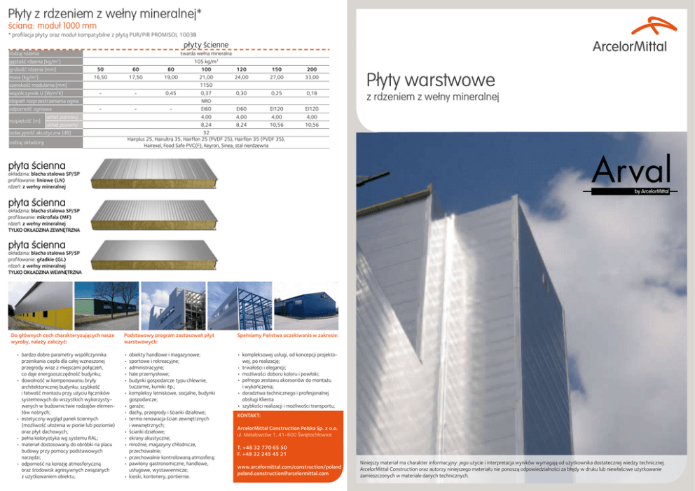 Płyty z rdzeniem z wełny mineralnej* ściana: moduł 1000 mm * profilacja płyty oraz moduł kompatybilne z płytą PUR/PIR PROMISOL 1003B płyty ścienne rodzaj rdzenia twarda wełna mineralna gęstość rdzenia [kg/m2] grubość rdzenia [mm] masa [kg/m2] 105 kg/m3 50 60 80 100 120 150 200 16,50 17,50 19,00 21,00 24,00 27,00 33,00 - - 0,45 0,30 0,25 0,18 EI60 EI60 EI120 EI120 4,00 4,00 4,00 4,00 szerokość modularna [mm] współczynnik U [W/m2K] 1150 stopień rozprzestrzeniania ognia odporność ogniowa rozpiętość [m] 0,37 NRO - układ pionowy układ poziomy izolacyjność akustyczna [dB] rodzaj okładziny - - 8,24 8,24 10,56 32 Hairplus 25, Hairultra 35, Hairflon 25 (PVDF 25), Hairflon 35 (PVDF 35), Hairexel, Food Safe PVC(F), Keyron, Sinea, stal nierdzewna Płyty warstwowe z rdzeniem z wełny mineralnej 10,56 płyta ścienna okładzina: blacha stalowa SP/SP profilowanie: liniowe (LN) rdzeń: z wełny mineralnej płyta ścienna okładzina: blacha stalowa SP/SP profilowanie: mikrofala (MF) rdzeń: z wełny mineralnej TYLKO OKŁADZINA ZEWNĘTRZNA płyta ścienna okładzina: blacha stalowa SP/SP profilowanie: gładkie (GL) rdzeń: z wełny mineralnej TYLKO OKŁADZINA WEWNĘTRZNA Do głównych cech charakteryzujących nasze wyroby, należy zaliczyć: Podstawowy program zastosowań płyt warstwowych: Spełniamy Państwa oczekiwania w zakresie: • bardzo dobre parametry współczynnika przenikania ciepła dla całej wznoszonej przegrody wraz z miejscami połączeń, co daje energooszczędność budynku; • dowolność w komponowaniu bryły architektonicznej budynku; szybkość i łatwość montażu przy użyciu łączników systemowych do wszystkich wykorzystywanych w budownictwie rodzajów elementów nośnych; • estetyczny wygląd paneli ściennych (możliwość ułożenia w pionie lub poziomie) oraz płyt dachowych; • pełna kolorystyka wg systemu RAL; • materiał dostosowany do obróbki na placu budowy przy pomocy podstawowych narzędzi; • odporność na korozję atmosferyczną oraz środowisk agresywnych związanych z użytkowaniem obiektu; • obiekty handlowe i magazynowe; • sportowe i rekreacyjne; • administracyjne; • hale przemysłowe; • budynki gospodarcze typu chlewnie, tuczarnie, kurniki itp.; • kompleksy letniskowe, socjalne, budynki gospodarcze; • garaże; • dachy, przegrody i ścianki działowe; • termo renowacja ścian zewnętrznych i wewnętrznych; • ścianki działowe; • ekrany akustyczne; • mroźnie, magazyny chłodnicze, przechowalnie; • przechowalnie kontrolowaną atmosferą; • pawilony gastronomiczne, handlowe, usługowe, wystawiennicze; • kioski, kontenery, portiernie. • kompleksowej usługi, od koncepcji projektowej, po realizację; • trwałości i elegancji; • możliwości doboru koloru i powłoki; • pełnego zestawu akcesoriów do montażu i wykończenia; • doradztwa technicznego i profesjonalnej obsługi Klienta • szybkości realizacji i możliwości transportu; KONTAKT: ArcelorMittal Construction Polska Sp. z o.o. ul. Metalowców 1, 41-600 Świętochłowice T. +48 32 770 65 50 F. +48 32 245 45 21 www.arcelormittal.com/construction/poland [email protected] Niniejszy materiał ma charakter informacyjny: jego użycie i interpretacja wyników wymagają od użytkownika dostatecznej wiedzy technicznej. ArcelorMittal Construction oraz autorzy niniejszego materiału nie ponoszą odpowiedzialności za błędy w druku lub niewłaściwe użytkowanie zamieszczonych w materiale danych technicznych. Płyty z rdzeniem z wełny mineralnej Płyty z rdzeniem z wełny mineralnej ściana: moduł 1200, dach: moduł 1000 mm 1 | Rdzeń – twarda wełna mineralna o gęstości 105 kg/m3 2 | Wkręt mocujący samo-wiercący 3 | Okładzina zewnętrzna – blacha stalowa powlekana gr. 0,50 mm 4 | Okładzina wewnętrzna – blacha stalowa powlekana gr. 0,50 mm rodzaj rdzenia gęstość rdzenia [kg/m2] grubość rdzenia [mm] masa [kg/m ] 2 płyty ścienne płyty dachowe twarda wełna mineralna twarda wełna mineralna 105 kg/m3 105 kg/m3 60 80 100 120 150 100 120 150 16,50 17,50 19,00 21,00 24,00 27,00 22,70 25,60 28,45 - - 0,45 0,37 0,30 0,25 0,35 1200 stopień rozprzestrzeniania ognia klasyfikacja ogniowa rozpiętość [m] 1000 NRO EI120 EI120 układ pionowy 4,00 4,00 4,00 układ poziomy 4,00 4,00 4,00 rodzaj okładziny - EI45 1 | Rdzeń – twarda wełna mineralna o gęstości 105 kg/m3 2 | Wkręt mocujący samo-wiercący 3 | Okładzina zewnętrzna – blacha stalowa powlekana gr. 0,50 mm 4 | Okładzina wewnętrzna – blacha stalowa powlekana gr. 0,50 mm REI 90 32 32 Hairplus 25, Hairultra 35, Hairflon 25 (PVDF 25), Hairflon 35 (PVDF 35), Hairexel, Food Safe PVC(F), Keyron, Sinea, stal nierdzewna płyta dachowa okładzina: blacha stalowa SP/SP profilowanie: trapezowe (TR) rdzeń: z wełny mineralnej płyta ścienna okładzina: blacha stalowa SP/SP profilowanie: rowkowe (RO) rdzeń: z wełny mineralnej płyta ścienna okładzina: blacha stalowa SP/SP profilowanie: liniowe (LN) rdzeń: z wełny mineralnej płyta ścienna okładzina: blacha stalowa SP/SP profilowanie: mikrofala (MF) rdzeń: z wełny mineralnej płyta ścienna okładzina: blacha stalowa SP/SP profilowanie: gładkie (GL) rdzeń: z wełny mineralnej płyta ścienna okładzina: blacha stalowa SP/SP profilowanie: niski profil (SN) rdzeń: z wełny mineralnej płyta ścienna okładzina: blacha stalowa SP/SP profilowanie: rowkowe (SPRF) rdzeń: z wełny mineralnej Wykonujemy również płyty do zabudowy jako ścianki działowe (STG). Panel zbudowany jest z okładzin z płyt gipsowo - kartonowych oraz rdzenia z twardej wełny mineralnej. W naszej ofercie znajdują się także płyty z okładzinami perforowanymi o znakomitych właściwościach izolacyjności akustycznej. To rodzina płyt warstwowych wykonanych standardowo, z okładzin z blachy stalowej, obustronnie ocynkowanej i pokrytej powłoką organiczną z poliestru (SP) oraz rdzeniem wykonanym z twardej wełny mineralnej. Pł