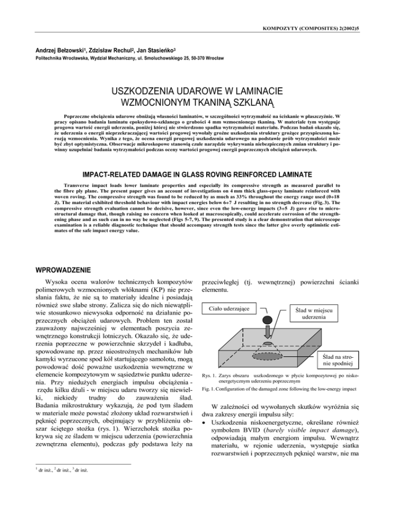 KOMPOZYTY (COMPOSITES) 2(2002)5 Andrzej Bełzowski1, Zdzisław Rechul2, Jan Stasieńko3 Politechnika Wrocławska, Wydział Mechaniczny, ul. Smoluchowskiego 25, 50-370 Wrocław USZKODZENIA UDAROWE W LAMINACIE WZMOCNIONYM TKANINĄ SZKLANĄ Poprzeczne obciążenia udarowe obniżają własności laminatów, w szczególności wytrzymałość na ściskanie w płaszczyźnie. W pracy opisano badania laminatu epoksydowo-szklanego o grubości 4 mm wzmocnionego tkaniną. W materiale tym występuje progowa wartość energii uderzenia, poniżej której nie stwierdzono spadku wytrzymałości materiału. Podczas badań okazało się, że uderzenia o energii nieprzekraczającej wartości progowej wywołały groźne uszkodzenia struktury grożące przyspieszoną korozją wzmocnienia. Wynika z tego, że ocena energii progowej uszkodzenia udarowego na podstawie prób wytrzymałości może być zbyt optymistyczna. Obserwacje mikroskopowe stanowią czułe narzędzie wykrywania niebezpiecznych zmian struktury i powinny uzupełniać badania wytrzymałości podczas oceny wartości progowej energii poprzecznych obciążeń udarowych. IMPACT-RELATED DAMAGE IN GLASS ROVING REINFORCED LAMINATE Transverse impact loads lower laminate properties and especially its compressive strength as measured parallel to the fibre ply plane. The present paper gives an account of investigations on 4 mm thick glass-epoxy laminate reinforced with woven roving. The compressive strength was found to be reduced by as much as 33% throughout the energy range used (0÷18 J). The material exhibited threshold behaviour with impact energies below 6÷7 J resulting in no strength decrease (Fig. 3). The compressive strength evaluation cannot be decisive, however, since even the low-energy impacts (3÷5 J) gave rise to microstructural damage that, though raising no concern when looked at macroscopically, could accelerate corrosion of the strengthening phase and as such can in no way be neglected (Figs 5-7, 9). The presented study is a clear demonstration that microscope examination is a reliable diagnostic technique that should accompany strength tests since the latter give overly optimistic estimates of the safe impact energy value. WPROWADZENIE Wysoka ocena walorów technicznych kompozytów polimerowych wzmocnionych włóknami (KP) nie przesłania faktu, że nie są to materiały idealne i posiadają również swe słabe strony. Zalicza się do nich niewątpliwie stosunkowo niewysoka odporność na działanie poprzecznych obciążeń udarowych. Problem ten został zauważony najwcześniej w elementach poszycia zewnętrznego konstrukcji lotniczych. Okazało się, że uderzenia poprzeczne w powierzchnie skrzydeł i kadłuba, spowodowane np. przez nieostrożnych mechaników lub kamyki wyrzucone spod kół startującego samolotu, mogą powodować dość poważne uszkodzenia wewnętrzne w elemencie kompozytowym w sąsiedztwie punktu uderzenia. Przy niedużych energiach impulsu obciążenia rzędu kilku dżuli - w miejscu udaru tworzy się niewielki, niekiedy trudny do zauważenia ślad. Badania mikrostruktury wykazują, że pod tym śladem w materiale może powstać złożony układ rozwarstwień i pęknięć poprzecznych, obejmujący w przybliżeniu obszar ściętego stożka (rys. 1). Wierzchołek stożka pokrywa się ze śladem w miejscu uderzenia (powierzchnia zewnętrzna elementu), podczas gdy podstawa leży na 1 dr inż., 2 dr inż., 3 dr inż. przeciwległej (tj. wewnętrznej) powierzchni ścianki elementu. Ciało uderzające Ślad w miejscu uderzenia Ślad na stronie spodniej Rys. 1. Zarys obszaru uszkodzonego w płycie kompozytowej po niskoenergetycznym uderzeniu poprzecznym Fig. 1. Configuration of the damaged zone following the low-energy impact W zależności od wywołanych skutków wyróżnia się dwa zakresy energii impulsu siły: • Uszkodzenia niskoenergetyczne, określane również symbolem BVID (barely visible impact damage), odpowiadają małym energiom impulsu. Wewnątrz materiału, w rejonie uderzenia, występuje siatka rozwarstwień i poprzecznych pęknięć warstw, nie ma 395 Uszkodzenia udarowe w laminacie wzmocnionym tkaniną szklaną rwotna przyczyna zniszczenia natomiast miejsca masowe pękanie włókien. Na powierzchni w miejscu uszkodzenia powstaje niewielki ślad, na powierzchni przeciwległej uszkodzenie jest wyraźnie bardziej rozległe [1]. • W zakresie dużych energii występują pęknięcia włókien oraz co najmniej zaczątki perforacji, w przypadku rur i zbiorników ma miejsce wyraźny przeciek. Ocena podatności polimerowych kompozytów konstrukcyjnych na powstawanie uszkodzeń udarowych stanowi ważny problem praktyczny. Klasyczne próby udarności Charpy’ego, Izoda itp. stosowane w badaniach metali i tworzyw sztucznych okazały się mało przydatne do oceny KP o strukturze warstwowej (tzw. laminatów). Specyficzne cechy laminatów sprawiają, że materiały te wymagają opracowania nowych metod oceny ich przydatności do pracy w warunkach stwarzających zagrożenie wystąpienia uszkodzeń udarowych. Uszkodzenia BVID powodują spadek wartości wskaźników wytrzymałości. W największym stopniu zmniejsza się doraźna wytrzymałość laminatu na ściskanie w płaszczyźnie (Rc), której spadek może wynosić nawet 30÷60% [1, 2]. W przypadku energii uderzeń powodujących małe spadki wytrzymałości doraźnej, główne niebezpieczeństwo może być związane z wystąpieniem takich zjawisk destrukcyjnych, jak: • propagacja powstałych rozwarstwień do rozmiarów powodujących zniszczenie elementu wskutek utraty stateczności (dotyczy to np. konstrukcji lotniczych), • korozja naprężeniowa spowodowana przez pęknięcia lub odpryski po stronie przeciwległej do miejsca uderzenia (może dotyczyć rurociągów i zbiorników). Garg [3] ocenia, że gdyby elementy poszycia samolotów wykonane z laminatów epoksydowo-węglowych nie były narażone na powstawanie uszkodzeń BVID, pozwoliłoby to na podniesieni