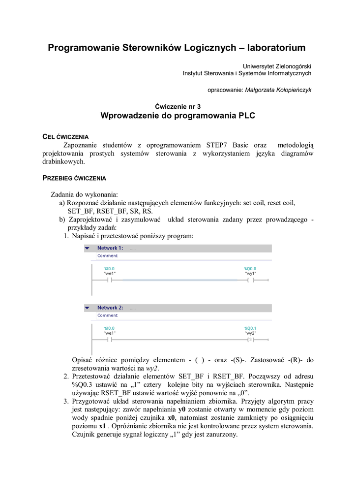 Programowanie Sterowników Logicznych – laboratorium Uniwersytet Zielonogórski Instytut Sterowania i Systemów Informatycznych opracowanie: Małgorzata Kołopieńczyk Ćwiczenie nr 3 Wprowadzenie do programowania PLC CEL ĆWICZENIA Zapoznanie studentów z oprogramowaniem STEP7 Basic oraz metodologią projektowania prostych systemów sterowania z wykorzystaniem języka diagramów drabinkowych. PRZEBIEG ĆWICZENIA Zadania do wykonania: a) Rozpoznać działanie następujących elementów funkcyjnych: set coil, reset coil, SET_BF, RSET_BF, SR, RS. b) Zaprojektować i zasymulować układ sterowania zadany przez prowadzącego przykłady zadań: 1. Napisać i przetestować poniższy program: Opisać różnice pomiędzy elementem - ( ) - oraz -(S)-. Zastosować -(R)- do zresetowania wartości na wy2. 2. Przetestować działanie elementów SET_BF i RSET_BF. Począwszy od adresu %Q0.3 ustawić na „1” cztery kolejne bity na wyjściach sterownika. Następnie używając RSET_BF ustawić wartość wyjść ponownie na „0”. 3. Przygotować układ sterowania napełnianiem zbiornika. Przyjęty algorytm pracy jest następujący: zawór napełniania y0 zostanie otwarty w momencie gdy poziom wody spadnie poniżej czujnika x0, natomiast zostanie zamknięty po osiągnięciu poziomu x1 . Opróżnianie zbiornika nie jest kontrolowane przez system sterowania. Czujnik generuje sygnał logiczny „1” gdy jest zanurzony. y0 x1 x0 4. Przygotować układ sterowania ruchem wózka: układ posiada dwa wejścia położenia p_pocz, p_końcowe, wejście inicjujące start, a także dwa wyjścia sterujące ruchem wózka jedzie_w_prawo oraz jedzie_w_lewo. W chwili początkowej wózek znajduje się nad czujnikiem p_pocz. Po zainicjowaniu procesu przyciskiem start, wózek jedzie w prawo (jedzie_w_prawo), aż do osiągnięcia położenia wskazywanego czujnikiem p_końcowe. Następnie wózek zmienia kierunek ruchu (jedzie_w_lewo), aż do osiągnięcia czujnika p_pocz. Kolejny cykl wyzwalany jest ponownie przyciskiem start. • zmodyfikować powyższy przykład o wprowadzenie sygnału alarmowego, aktywowanego w momencie jednoczesnego zwarcia obydwóch czujników Start jedzie_w_lewo p_pocz jedzie_w_prawo p_końcowe 5. Przetestować działanie instrukcji SR oraz RS w sposób zadany przez prowadzącego. SPRAWOZDANIE 1. Opis obiektu sterowania. 2. Projekt zadanego zadania. 3. Interpretacja wyników symulacji. 4. Uwagi do ćwiczenia. Literatura 1. J. Kwaśniewski: Programowalne sterowniki przemysłowe w systemach sterowania, ZP Roma-Pol, Kraków, 1999. 2. T. Legierski, J. Wyrwał, J. Kasprzyk, J. Hajda: Programowanie sterowników PLC, Wydawnictwo Pracowni Komputerowej Jacka Skalmierskiego, Gliwice, 1998. 3. T. Mikulczyński, Z. Samsonowicz: Metody modelowania procesów dyskretnych i programowania PLC, WNT, Warszawa, 1997. 4. R. Sałat, K. Korpysz, P. Obstawski: Wstęp do programowania sterowników PLC, WKŁ 2010.