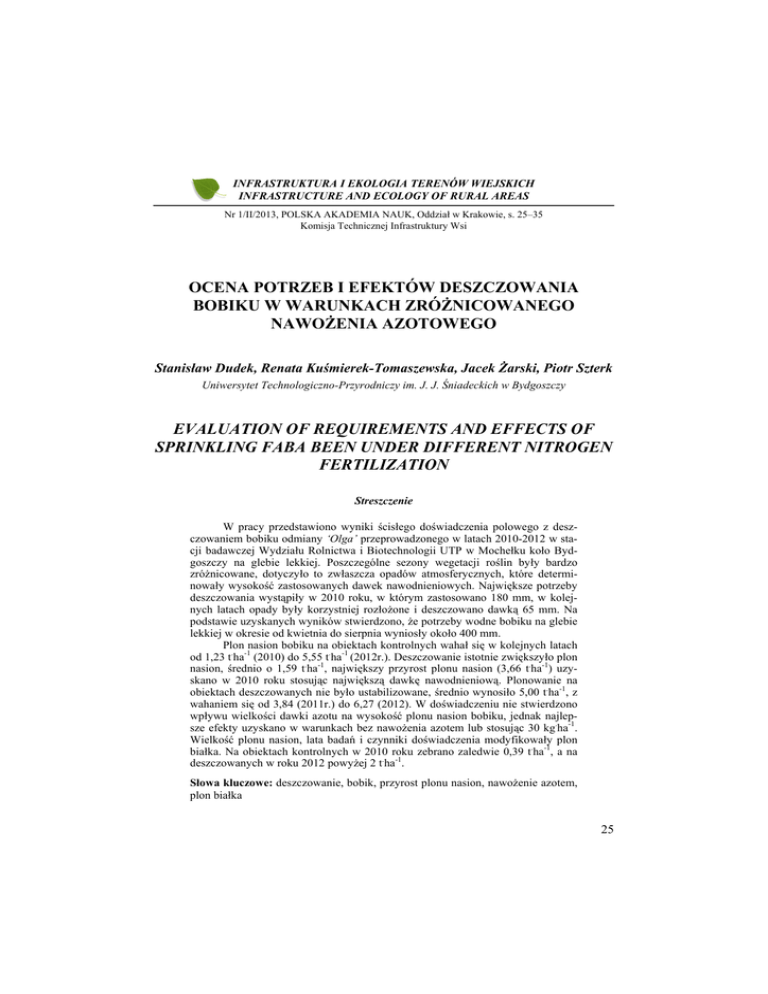 Ocena potrzeb i efektów... INFRASTRUKTURA I EKOLOGIA TERENÓW WIEJSKICH INFRASTRUCTURE AND ECOLOGY OF RURAL AREAS Nr 1/II/2013, POLSKA AKADEMIA NAUK, Oddział w Krakowie, s. 25–35 Komisja Technicznej Infrastruktury Wsi OCENA POTRZEB I EFEKTÓW DESZCZOWANIA BOBIKU W WARUNKACH ZRÓŻNICOWANEGO NAWOŻENIA AZOTOWEGO Stanisław Dudek, Renata Kuśmierek-Tomaszewska, Jacek Żarski, Piotr Szterk Uniwersytet Technologiczno-Przyrodniczy im. J. J. Śniadeckich w Bydgoszczy EVALUATION OF REQUIREMENTS AND EFFECTS OF SPRINKLING FABA BEEN UNDER DIFFERENT NITROGEN FERTILIZATION Streszczenie W pracy przedstawiono wyniki ścisłego doświadczenia polowego z deszczowaniem bobiku odmiany ‘Olga’ przeprowadzonego w latach 2010-2012 w stacji badawczej Wydziału Rolnictwa i Biotechnologii UTP w Mochełku koło Bydgoszczy na glebie lekkiej. Poszczególne sezony wegetacji roślin były bardzo zróżnicowane, dotyczyło to zwłaszcza opadów atmosferycznych, które determinowały wysokość zastosowanych dawek nawodnieniowych. Największe potrzeby deszczowania wystąpiły w 2010 roku, w którym zastosowano 180 mm, w kolejnych latach opady były korzystniej rozłożone i deszczowano dawką 65 mm. Na podstawie uzyskanych wyników stwierdzono, że potrzeby wodne bobiku na glebie lekkiej w okresie od kwietnia do sierpnia wyniosły około 400 mm. Plon nasion bobiku na obiektach kontrolnych wahał się w kolejnych latach od 1,23 t.ha-1 (2010) do 5,55 t.ha-1 (2012r.). Deszczowanie istotnie zwiększyło plon nasion, średnio o 1,59 t.ha-1, największy przyrost plonu nasion (3,66 t.ha-1) uzyskano w 2010 roku stosując największą dawkę nawodnieniową. Plonowanie na obiektach deszczowanych nie było ustabilizowane, średnio wynosiło 5,00 t.ha-1, z wahaniem się od 3,84 (2011r.) do 6,27 (2012). W doświadczeniu nie stwierdzono wpływu wielkości dawki azotu na wysokość plonu nasion bobiku, jednak najlepsze efekty uzyskano w warunkach bez nawożenia azotem lub stosując 30 kg.ha-1. Wielkość plonu nasion, lata badań i czynniki doświadczenia modyfikowały plon białka. Na obiektach kontrolnych w 2010 roku zebrano zaledwie 0,39 t.ha-1, a na deszczowanych w roku 2012 powyżej 2 t.ha-1. Słowa kluczowe: deszczowanie, bobik, przyrost plonu nasion, nawożenie azotem, plon białka 25 Stanisław Dudek, Renata Kuśmierek-Tomaszewska, Jacek Żarski, Piotr Szterk Summary The paper presents the results of a field experiments with irrigation faba bean cultivar 'Olga' which were carried out on sandy soil in the years 2010-2012 nearby Bydgoszcz in the Research Centre of University of Technology and Life Science – Mochełek. Particular vegetation seasons were different, especially related to rainfall, which determined the amount of applied irrigation doses. The highest-level need for irrigation occurred in 2010, when 180 mm of irrigated water was used; while in subsequent years rainfalls were distributed more preferably thus for irrigation were used 65 mm. Based on the results, it was found that the water needs of faba bean cultivated on sandy soil in the period from April to August amounted to about 400 mm. Seed yield of faba bean collected from control plots ranged in successive years from 1.23 t.ha-1 (2010) to 5.55 t.ha-1 (2012). Irrigation increased the yield significantly by an average of 1.59 t.ha-1, the highest increase in crop (3.66 t.ha-1) was obtained in 2010 by using the highest dose of irrigation. Yield collected from irrigated plots were not stable in the subsequent years, they averaged 5.00 t.ha-1, varying between 3.84 t.ha-1 (2011), and 6.27 t.ha-1 (2012). Based on the results of the experiments, it was not found an influence of nitrogen fertilizer on the amount of yield of seed, the best results were obtained in conditions without nitrogen or with the dose of 30 kg.ha-1. The yield of seed, the subsequent years of research and factors used in the experiment affected the yield of protein. In 2010 from the control plots were collected only 0,39 t.ha-1 of protein, and in 2012 from the irrigated plots were received more than 2 tons. Key words: sprinkler irrigation, faba bean, increase of yield, nitrogen fertilization, the yield of protein WSTĘP Bobik należy do roślin strączkowych uprawianych w celu pokrycia potrzeb paszowych zwierząt gospodarskich, wykorzystywanych głównie w formie suchych nasion przeznaczonych do bezpośredniego spasania lub jako komponent w produkcji pasz. Najważniejszą cechą tej grupy roślin jest wysoka zawartość ekologicznego i taniego białka, poprzez wiązanie wolnego azotu atmosferycznego w procesie symbiozy z bakteriami korzeniowymi. W związku z tym bobik jest cenionym przedplonem, szczególnie w sytuacji dominacji zbóż w zmianowaniu [Fordoński 2003, Kulig i Zając 2007]. Powyższe argumenty stoją jednak w sprzeczności z areałem jego uprawy nie przekraczającym 100 tys. ha i nie pokrywają zapotrzebowania na białko paszowe, oceniane na około 1 mln ton [Kulig i Zając 2007; Święcicki i in. 2007]. W Polsce, podobnie jak w Unii Europejskiej, około 75% białka roślinnego pochodzi z importu, co jest zjawiskiem niekorzystnym, któremu należy przeciwdziałać, zgodnie z założeniami „Ustawy o paszach” [Pahl 2002, Święcicki i in. 2007]. Spełnienie tego zadania jest możliwe przy pięciokrotnym wzroście powierzchni uprawy bobiku i 2-3 krotnym areału roślin strączkowych. Takie zmia26 Ocena potrzeb i efektów... ny ograniczyłyby import białka. Kraje Unii Europejskiej już w tym kierunku zmierzają – powierzchnia uprawy roślin strączkowych zajmuje tam 2-3% areału, a w Ameryce Północnej aż 15-25% (razem z soją) – skutkiem tego jest odwrotnie proporcjonalny udział zbóż wynoszący w Polsce ponad 70%, w UE 50%, a w Kanadzie i USA 35% [Gawłowska i Święcicki 2007, Podleśny 2004, 2005]. Mała powierzchnia uprawy bobiku wynika z jego bardzo dużych wymagań glebowych i klimatycznych, rzadko w warunkach naszego kraju spełnianych, co w konsekwencji pro