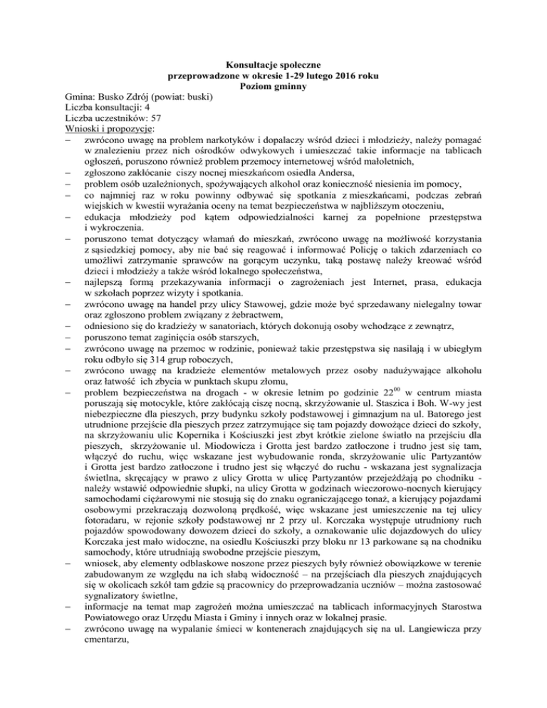 Konsultacje społeczne przeprowadzone w okresie 1-29 lutego 2016 roku Poziom gminny Gmina: Busko Zdrój (powiat: buski) Liczba konsultacji: 4 Liczba uczestników: 57 Wnioski i propozycje: zwrócono uwagę na problem narkotyków i dopalaczy wśród dzieci i młodzieży, należy pomagać w znalezieniu przez nich ośrodków odwykowych i umieszczać takie informacje na tablicach ogłoszeń, poruszono również problem przemocy internetowej wśród małoletnich, zgłoszono zakłócanie ciszy nocnej mieszkańcom osiedla Andersa, problem osób uzależnionych, spożywających alkohol oraz konieczność niesienia im pomocy, co najmniej raz w roku powinny odbywać się spotkania z mieszkańcami, podczas zebrań wiejskich w kwestii wyrażania oceny na temat bezpieczeństwa w najbliższym otoczeniu, edukacja młodzieży pod kątem odpowiedzialności karnej za popełnione przestępstwa i wykroczenia. poruszono temat dotyczący włamań do mieszkań, zwrócono uwagę na możliwość korzystania z sąsiedzkiej pomocy, aby nie bać się reagować i informować Policję o takich zdarzeniach co umożliwi zatrzymanie sprawców na gorącym uczynku, taką postawę należy kreować wśród dzieci i młodzieży a także wśród lokalnego społeczeństwa, najlepszą formą przekazywania informacji o zagrożeniach jest Internet, prasa, edukacja w szkołach poprzez wizyty i spotkania. zwrócono uwagę na handel przy ulicy Stawowej, gdzie może być sprzedawany nielegalny towar oraz zgłoszono problem związany z żebractwem, odniesiono się do kradzieży w sanatoriach, których dokonują osoby wchodzące z zewnątrz, poruszono temat zaginięcia osób starszych, zwrócono uwagę na przemoc w rodzinie, ponieważ takie przestępstwa się nasilają i w ubiegłym roku odbyło się 314 grup roboczych, zwrócono uwagę na kradzieże elementów metalowych przez osoby nadużywające alkoholu oraz łatwość ich zbycia w punktach skupu złomu, problem bezpieczeństwa na drogach - w okresie letnim po godzinie 2200 w centrum miasta poruszają się motocykle, które zakłócają ciszę nocną, skrzyżowanie ul. Staszica i Boh. W-wy jest niebezpieczne dla pieszych, przy budynku szkoły podstawowej i gimnazjum na ul. Batorego jest utrudnione przejście dla pieszych przez zatrzymujące się tam pojazdy dowożące dzieci do szkoły, na skrzyżowaniu ulic Kopernika i Kościuszki jest zbyt krótkie zielone światło na przejściu dla pieszych, skrzyżowanie ul. Miodowicza i Grotta jest bardzo zatłoczone i trudno jest się tam, włączyć do ruchu, więc wskazane jest wybudowanie ronda, skrzyżowanie ulic Partyzantów i Grotta jest bardzo zatłoczone i trudno jest się włączyć do ruchu - wskazana jest sygnalizacja świetlna, skręcający w prawo z ulicy Grotta w ulicę Partyzantów przejeżdżają po chodniku należy wstawić odpowiednie słupki, na ulicy Grotta w godzinach wieczorowo-nocnych kierujący samochodami ciężarowymi nie stosują się do znaku ograniczającego tonaż, a kierujący pojazdami osobowymi przekraczają dozwoloną prędkość, więc wskazane jest umieszczenie na tej ulicy fotoradaru, w rejonie szkoły podstawowej nr 2 przy ul. Korczaka występuje utrudniony ruch pojazdów spowodowany dowozem dzieci do szkoły, a oznakowanie ulic dojazdowych do ulicy Korczaka jest mało widoczne, na osiedlu Kościuszki przy bloku nr 13 parkowane są na chodniku samochody, które utrudniają swobodne przejście pieszym, wniosek, aby elementy odblaskowe noszone przez pieszych były również obowiązkowe w terenie zabudowanym ze względu na ich słabą widoczność – na przejściach dla pieszych znajdujących się w okolicach szkół tam gdzie są pracownicy do przeprowadzania uczniów – można zastosować sygnalizatory świetlne, informacje na temat map zagrożeń można umieszczać na tablicach informacyjnych Starostwa Powiatowego oraz Urzędu Miasta i Gminy i innych oraz w lokalnej prasie. zwrócono uwagę na wypalanie śmieci w kontenerach znajdujących się na ul. Langiewicza przy cmentarzu, zwrócono uwagę na problem umieszczania napisów na elewacjach bloków osiedlowych, problem gromadzenia się młodzieży w okresie letnim i spożywanie alkoholu na terenie placu szkolnego w Szańcu, ponadto na ul. Mickiewicza przed sklepem „Biedronka” i na tzw. „Bycoku”, zakłócanie porządku publicznego (bójki) w rejonie sklepów w m. Szaniec i Młyny przez osoby nietrzeźwe co prowadzi do demoralizacji przebywających tam nieletnich, niebezpieczne wyścigi motocyklowe organizowane na drodze relacji Szaniec - Młyny, zakłócenia ładu i porządku publicznego przez osoby nietrzeźwe oraz brawurowa jazda samochodami i motocyklami w rejonie budynku OSP w Galowie, zwrócono uwagę na problem osób bezdomnych przebywających na terenie ogródków działkowych w okresie zimowym, a także na włamania i kradzieże do altan i domków w tym rejonie, problem kłusownictwa i kradzieży ryb na rzece Nida i na stawach w miejscowości Mikułowice, w godzinach wieczorowych w rejonie parku miejskiego powinno być więcej patroli z psem służbowym, kierować na wsie w weekendy patrole nieumundurowane, dokonywać kontroli sklepów, gdzie jest sprzedawany alkohol osobom małoletnim.
