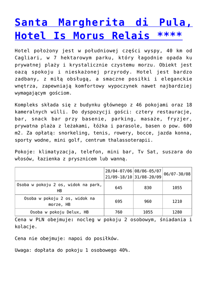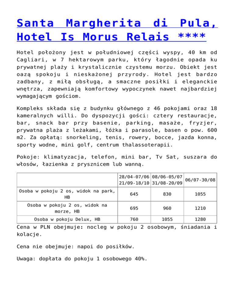 Santa Margherita di Pula, Hotel Is Morus Relais **** Hotel położony jest w południowej części wyspy, 40 km od Cagliari, w 7 hektarowym parku, który łagodnie opada ku prywatnej plaży i krystalicznie czystemu morzu. Obiekt jest oazą spokoju i nieskażonej przyrody. Hotel jest bardzo zadbany, z miłą obsługą, a smaczne posiłki i eleganckie wnętrza, zapewniają komfortowy wypoczynek nawet najbardziej wymagającym gościom. Kompleks składa się z budynku głównego z 46 pokojami oraz 18 kameralnych willi. Do dyspozycji gości: cztery restauracje, bar, snack bar przy basenie, parking, masaże, fryzjer, prywatna plaża z leżakami, łóżka i parasole, basen o pow. 600 m2. Za opłatą: snorkeling, tenis, rowery, bocce, jazda konna, sporty wodne, mini golf, centrum thalassoterapii. Pokoje: klimatyzacja, telefon, mini bar, Tv Sat, suszara do włosów, łazienka z prysznicem lub wanną. 28/04-07/06 08/06-05/07 06/07-30/08 21/09-18/10 31/08-20/09 Osoba w pokoju 2 os, widok na park, HB 645 830 1055 Osoba w pokoju 2 os, widok na morze, HB 695 960 1210 Osoba w pokoju Delux, HB 760 1055 1280 Cena w PLN obejmuje: nocleg w pokoju 2 osobowym, śniadania i kolacje. Cena nie obejmuje: napoi do posiłków. Uwaga: dopłata do pokoju 1 osobowego 40%. Alghero, Resort Vista Blu Ośrodek położony jest zaledwie 3 km od centrum miasta, jego nazwa związana jest z pięknym widokiem na Zatokę Alghero. Kompleks został wybudowany w stylu śródziemnomorskim, z miejscowego kamienia, w pastelowych kolorach, które współgrają z ogrodem i gajami oliwnymi. W tym rejonie Sardynii znajduje się wiele ciekawych miejsc do zwiedzania, jak: Nuraghe Palmavera, Necropolis Anghelu Ruju, Naturalny Park Porto Conte oraz Jaskinie Neptuna. W centrum starego miasta jest wiele restauracji, które serwują znakomite dania lokalnej kuchni oraz wyborne wina. Na obrzeżach Alghero znajdują się kluby nocne i dyskoteki. Najbliższa plaża oddalona jest ok 3,5 km, a inne znane plaże jak „Le Bombarde”, „Lazzaretto”, Mugoni” , oddalone są kilka minut jazdy od kompleksu. Hotel posiada recepcję, bar, ogród, solarium, basen, strefę Wi Fi, wypożyczalnię rowerów, parking. Wille są gustownie i komfortowo urządzone, z aneksami kuchennym z pełnym wyposażeniem, z klimatyzacją /ogrzewaniem, Tv, pralką, piekarnikiem, tosterem, suszarką do włosów, żelazkiem i deską do prasowania, wszystkie z prywatnym ogrodem, grillem, tarasem ze stołem i krzesłami, prywatnym parkingiem. Wille dostępne są w następujących kategoriach: Willa 4 os (80 m2): 2 sypialnie 2 łazienki pokój dzienny z kanapą aneks kuchenny taras z meblami ogrodowymi Willa 6 os (100 m2): 2 sypialnie 2 łazienki pokój dzienny z rozkładaną sofą 2-os aneks kuchenny taras z meblami ogrodowymi Willa 8 os (115 m2): 3 sypialnie 2 łazienki pokój dzienny z rozkładaną kanapą 2-os aneks kuchenny taras z meblami ogrodowymi 05/04-31/05 31/05-07/06 07/06-28/06 28/06-12/07 02/08-09/08 12/07-26/07 26/07-02/08 09/08-16/08 13/09-25/10 06/09-13/09 30/08-06/09 23/08-30/08 16/08-23/08 Willa 4 2230 2892 3800 4535 4955 5495 6485 7227 Willa 6 2890 3510 4625 5287 5825 6277 7270 8055 Willa 8 3965 4545 5617 6485 6857 7352 8632 9417 Cena w PLN obejmuje: wynajęcie willi na tydzień, opłatę za wodę, prąd i gaz, końcowe sprzątanie (kuchnie sprzątają goście, lub opłata 50 Euro), pościel, ręczniki, korzystanie z basenu. Cena nie obejmuje: kaucji zwrotnej 200 Euro Program wyjazdu do Chin 1 dzień (środa) 01/10/2014 Warszawa-Pekin Godz. 07.35 – Spotkanie z pilotem dr Tadeuszem Jędrysiakiem (tel. 605 654 347) na lotnisku Warszawa-Okęcie przy stanowisku odpraw SWISS Godz. 09.35 – odlot do Zurychu Godz. 11.40 – Przylot do Zurychu, tranzyt Godz. 13.20 – Odlot do Pekinu, kolacja i noc na pokładzie. 2 dzień (czwartek) 02/10/2014 Pekin Godz. 05.15 – Przylot do Pekinu, transfer do hotelu RAINBOW 4*, zakwaterowanie w pokojach, odpoczynek. Zwiedzanie miasta z przewodnikiem: Plac Tiananmen – Plac Niebiańskiego Spokoju, największy plac na świecie, centralne miejsce w Pekinie, od wieków świadek najważniejszych wydarzeń w historii; Zakazane Miasto – jednego z najlepszych przykładów architektury cesarskich Chin, będącego rezydencją 24 cesarzy z dynastii Ming i Qing. Ten potężny kompleks budynków, którego budowę zakończono w 1420 roku, przez pięć wieków był symbolem władzy i potęgi urzędujących w nim cesarzy. Kolacja powitalna w restauracji serwującej słynną, pekińską kaczkę. 3 dzień (piątek) 03/10/2014 Pekin Śniadanie w hotelu. Zwiedzanie z przewodnikiem Świątyni Nieba, uważanej za szczytowe osiągnięcie tradycyjnej chińskiej architektury i jeden z najwspanialszych i największych obiektów sakralnych Państwa Środka. Oddawano w niej cześć niebiosom i modlono się o dobry urodzaj w czasach dynastii Ming i Qing. Do budowy świątyni nie użyto ani jednego gwoździa. Obecnie w Świątyni Nieba mieści się muzeum. Następnie Pałac Letni – wspaniały przykład chińskiej architektury ogrodowo – parkowej, mieszczący się na Wzgórzu Długowieczności nad jeziorem Kunming. Przejażdżka łodzią po jeziorze. Czas wolny na zakupy. Wieczorem kolacja oraz pokaz Kung Fu. Nocleg w hotelu RAINBOW 4* 4 dzień (sobota) 04/10/2014 Pekin Śniadanie w hotelu. Wycieczka do Wielkiego Muru – największej fortyfikacji świata. Zwiedzanie wytwórni Cloisonne (wyroby miedziane). Zwiedzanie Świątyni Lamy, której największą atrakcją jest siedemnastometrowy posąg Buddy Przyszłości, wyrzeźbiony z jednego bloku drzewa sandałowego. Kolacja w lokalnej restauracji w Pekinie. Nocleg w hotelu RAINBOW 4* 5 dzień (niedziela) 05/10/2014 Pekin-Xian Śniadanie w hotelu. Transfer na lotnisko, odlot do Xian . w hotelu. Zwiedzanie Przylot, zakwaterowanie miasta: mury miejskie, Wielki Meczet. Kolacja w lokalnej restauracji – przedstawienie Tang Dynasty Show. słynne pierożki oraz Nocleg w hotelu SKYTEL 4* 6 dzień (poniedział