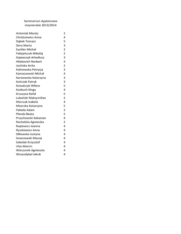 Seminarium dyplomowe inżynierskie 2013/2014 Antoniak Maciej Chróściewicz Anna Dąbek Tomasz Dera Marta Eychler Michał Fabijańczuk Mikołaj Gajewczyk Arkadiusz Hliabovich Norbert Jasińska Anita Kalinowska Patrycja Kamaszewski Michał Karwowska Katarzyna Kończak Patryk Kowalczyk Wiktor Kozbuch Kinga Kruszyna Rafał Lubański Maksymilian Marczak Izabela Mizerska Katarzyna Pakieła Adam Płanda Beata Przychowski Sebastan Rochalska Agnieszka Rupiewicz Joanna Ryszkiewicz Anna Siłkowska Justyna Smarzewski Maciej Sobolak Krzysztof Ulas Marcin Wieczorek Agnieszka Wszyndybył Jakub 2 4 5 3 2 2 3 4 2 3 4 3 3 5 4 5 2 4 5 2 5 4 2 4 4 4 4 4 4 4 4