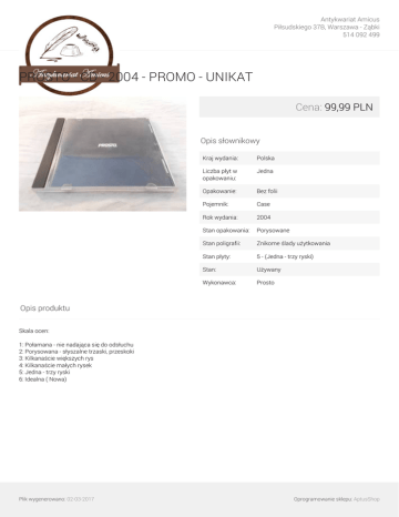 Antykwariat Amicus Piłsudskiego 37B, Warszawa - Ząbki 514 092 499 PROSTO - CD - 2004 - PROMO - UNIKAT Cena: 99,99 PLN Opis słownikowy Kraj wydania: Polska Liczba płyt w opakowaniu: Jedna Opakowanie: Bez folii Pojemnik: Case Rok wydania: 2004 Stan opakowania: Porysowane Stan poligrafii: Znikome ślady użytkowania Stan płyty: 5 - (Jedna - trzy ryski) Stan: Używany Wykonawca: Prosto Opis produktu Skala ocen: 1: Połamana - nie nadająca się do odsłuchu 2: Porysowana - słyszalne trzaski, przeskoki 3: Kilkanaście większych rys 4: Kilkanaście małych rysek 5: Jedna - trzy ryski 6: Idealna ( Nowa) Plik wygenerowano: 02-03-2017 Oprogramowanie sklepu: AptusShop Antykwariat Amicus Piłsudskiego 37B, Warszawa - Ząbki 514 092 499 Galeria Plik wygenerowano: 02-03-2017 Powered by TCPDF (www.tcpdf.org) Oprogramowanie sklepu: AptusShop