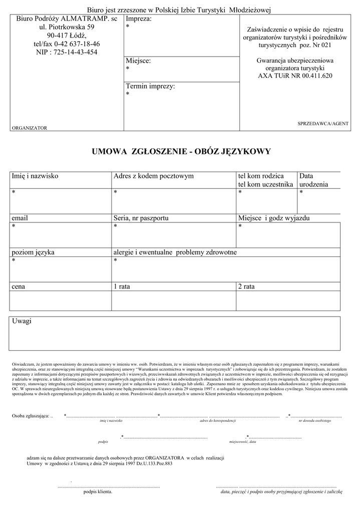 Biuro jest zrzeszone w Polskiej Izbie Turystyki Młodzieżowej Biuro Podróży ALMATRAMP. sc Impreza: ul. Piotrkowska 59 * Zaświadczenie o wpisie do rejestru 90-417 Łódź, organizatorów turystyki i pośredników tel/fax 0-42 637-18-46 turystycznych poz. Nr 021 NIP : 725-14-43-454 Gwarancja ubezpieczeniowa Miejsce: organizatora turystyki * AXA TUiR NR 00.411.620 Termin imprezy: * SPRZEDAWCA/AGENT ORGANIZATOR UMOWA ZGŁOSZENIE - OBÓZ JĘZYKOWY Imię i nazwisko Adres z kodem pocztowym * * tel kom rodzica Data tel kom uczestnika urodzenia * * email * Seria, nr paszportu * Miejsce i godz wyjazdu * poziom języka * alergie i ewentualne problemy zdrowotne * cena 1 rata 2 rata Uwagi Oświadczam, że jestem upoważniony do zawarcia umowy w imieniu ww. osób. Potwierdzam, że w imieniu własnym oraz osób zgłaszanych zapoznałem się z programem imprezy, warunkami ubezpieczenia, oraz ze stanowiącymi integralną część niniejszej umowy “Warunkami uczestnictwa w imprezach turystycznych” i zobowiązuje się do ich przestrzegania. Potwierdzam, że zostałem zapoznany z informacjami dotyczącymi przepisów paszportowych i wizowych, przeciwwskazań zdrowotnych związanych z uczestnictwem w imprezie, możliwości ubezpieczenia się od rezygnacji z udziału w imprezie, a także informacjami na temat szczegółowych zagrożeń życia i zdrowia na odwiedzanych obszarach i możliwości ubezpieczeń z tym związanych. Szczegółowy program imprezy, stanowiący integralną część niniejszej umowy zawarty jest w załączniku w postaci: katalogu lub ulotki. .Zapoznano mnie ze sposobem uzyskania odszkodowania z tytułu ubezpieczenia OC. W sprawach nieuregulowanych niniejszą umową stosowane będą postanowienia Ustawy z dnia 29 sierpnia 1997 r. o usługach turystycznych oraz kodeksu cywilnego. Niniejsza umowa została sporządzona w dwóch egzemplarzach po jednym dla każdej ze stron. Prawdziwość danych zawartych w umowie Klient potwierdza własnoręcznym podpisem. Osoba zgłaszająca: .. *........................................ ..................................*....................................... .......................................................... imię i nazwisko adres do korespondencji .*..................................................................... ..*.......................................... nr dowodu osobistego .*........................................... miejscowość, data podpis adzam się na dalsze przetwarzanie danych osobowych przez ORGANIZATORA w celach realizacji Umowy w zgodności z Ustawą z dnia 29 sierpnia 1997 Dz.U.133.Poz.883 . .................................................................................... podpis klienta. .................. ................................................................................ data, pieczęć i podpis osoby przyjmującej zgłoszenie i zaliczkę