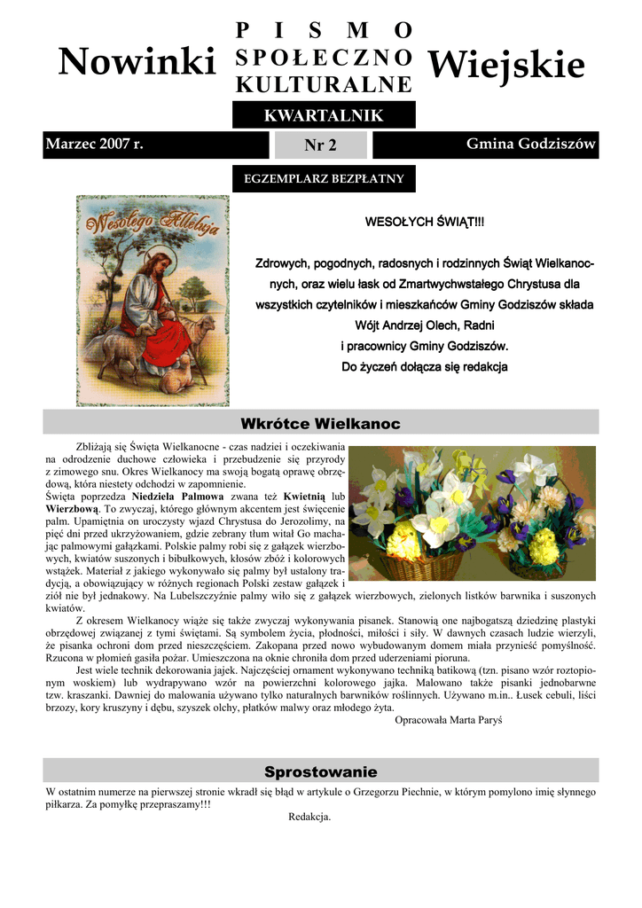 Nowinki P I S M O SPOŁECZNO KULTURALNE Wiejskie KWARTALNIK Marzec 2007 r. Gmina Godziszów Nr 2 EGZEMPLARZ BEZPŁATNY WESOŁYCH ŚWIĄT!!! Zdrowych, pogodnych, radosnych i rodzinnych Świąt WielkanocWielkanocnych, oraz wielu łask od Zmartwychwstałego Chrystusa dla wszystkich czytelników i mieszkańców Gminy Godziszów składa Wójt Andrzej Andrzej Olech, Radni i pracownicy Gminy Godziszów. Do życzeń dołącza się redakcja Wkrótce Wielkanoc ZbliŜają się Święta Wielkanocne - czas nadziei i oczekiwania na odrodzenie duchowe człowieka i przebudzenie się przyrody z zimowego snu. Okres Wielkanocy ma swoją bogatą oprawę obrzędową, która niestety odchodzi w zapomnienie. Święta poprzedza Niedziela Palmowa zwana teŜ Kwietnią lub Wierzbową. To zwyczaj, którego głównym akcentem jest święcenie palm. Upamiętnia on uroczysty wjazd Chrystusa do Jerozolimy, na pięć dni przed ukrzyŜowaniem, gdzie zebrany tłum witał Go machając palmowymi gałązkami. Polskie palmy robi się z gałązek wierzbowych, kwiatów suszonych i bibułkowych, kłosów zbóŜ i kolorowych wstąŜek. Materiał z jakiego wykonywało się palmy był ustalony tradycją, a obowiązujący w róŜnych regionach Polski zestaw gałązek i ziół nie był jednakowy. Na Lubelszczyźnie palmy wiło się z gałązek wierzbowych, zielonych listków barwnika i suszonych kwiatów. Z okresem Wielkanocy wiąŜe się takŜe zwyczaj wykonywania pisanek. Stanowią one najbogatszą dziedzinę plastyki obrzędowej związanej z tymi świętami. Są symbolem Ŝycia, płodności, miłości i siły. W dawnych czasach ludzie wierzyli, Ŝe pisanka ochroni dom przed nieszczęściem. Zakopana przed nowo wybudowanym domem miała przynieść pomyślność. Rzucona w płomień gasiła poŜar. Umieszczona na oknie chroniła dom przed uderzeniami pioruna. Jest wiele technik dekorowania jajek. Najczęściej ornament wykonywano techniką batikową (tzn. pisano wzór roztopionym woskiem) lub wydrapywano wzór na powierzchni kolorowego jajka. Malowano takŜe pisanki jednobarwne tzw. kraszanki. Dawniej do malowania uŜywano tylko naturalnych barwników roślinnych. UŜywano m.in.. Łusek cebuli, liści brzozy, kory kruszyny i dębu, szyszek olchy, płatków malwy oraz młodego Ŝyta. Opracowała Marta Paryś Sprostowanie W ostatnim numerze na pierwszej stronie wkradł się błąd w artykule o Grzegorzu Piechnie, w którym pomylono imię słynnego piłkarza. Za pomyłkę przepraszamy!!! Redakcja. Czy wiesz, Ŝe… Wielkanoc (Pascha) - to najstarsze i najwaŜniejsze święto chrześcijańskie (obok BoŜego Narodzenia) upamiętniające śmierć oraz zmartwychwstanie Jezusa Chrystusa. Poprzedzający ją tydzień, stanowiący okres wspominania najwaŜniejszych dla wiary chrześcijańskiej wydarzeń, nazwany jest Wielkim Tygodniem. Poprzez wieki spierano się, kiedy powinna być obchodzona. Podczas soboru nicejskiego w 325 r. ustalono, Ŝe będzie się ją obchodzić w pierwszą niedzielę po pierwszej wiosennej pełni KsięŜyca. Wielkanoc jest więc świętem ruchomym: moŜe wypaść najwcześniej 22 marca, a najpóźniej 25 kwietnia. Z dniem Wielkanocy powiązany jest termin większości ruchomych świąt chrześcijańskich, m.in..: Środa Popielcowa, Wielki Post, Triduum Paschalne, Wniebowstąpienie Pańskie, Zesłanie Ducha Świętego i inne. Po wprowadzeniu kalendarza gregoriańskiego znów pojawiły się odmienności: w prawosławiu Wielkanoc obchodzi się bowiem zgodnie z kalendarzem juliańskim. Niedziela Wielkanocna (nazywana teŜ Wielką Niedzielą , Niedzielą Zmartwychwstania Pańskiego) to pierwszy dzień świąt wielkanocnych. Niedziela Wielkanocna nie miała początkowo własnej liturgii, gdyŜ wigilia paschalna przeciągała się do wczesnych godzin porannych. Dopiero kiedy przesunięto obrzędy wigilijne na sobotę rano, Msza Niedzieli Zmartwychwstania stała się w świadomości wiernych główną Mszą Świąteczną. W Polsce w godzinach porannych odprawiana jest uroczysta rezurekcja (resurrectio łac. oznacza zmartwychwstanie), która swymi tradycjami sięga średniowiecza –mówią o niej księgi liturgiczne z tych czasów. Obrzędy rezurekcji bardzo rozwinięto, by dać obraz wydarzeń związanych ze zmartwychwstaniem Pana. Zostały one w połowie XVI wieku ujednolicone i tak przetrwały do naszych czasów. Kapłan udaje się do grobu Pańskiego, skąd wyrusza uroczysta procesja ze śpiewem „Wesoły nam dzień dziś nastał” oraz obchodzi trzykrotnie świątynię, obwieszczając światu zwycięstwo Chrystusa. Po procesji odprawiana jest uroczysta Msza Święta. Na początku mszy wznoszony jest okrzyk radości Alleluja (Chwalcie Boga), będący przyśpiewem w pieśniach wielkanocnych. Po powrocie do domu w gronie rodzinnym zasiada się do uroczystego śniadania wielkanocnego, które rozpoczyna się składaniem Ŝyczeń i dzieleniem się święconką z koszyczka. Na stołach znajdują się jajka, wędliny, wielkanocne baby i mazurki. Stoły zdobione są bukietami z bazi i pierwszych wiosennych kwiatów. Poniedziałek Wielkanocny (zwany teŜ Lanym Poniedziałkiem, Śmigusem-dyngusem) to drugi dzień świąt Wielkiej nocy. W polskiej tradycji tego dnia polewa się dla Ŝartów wodą inne osoby, nawet nieznajome. Polewanie wodą nawiązuje do dawnych praktyk pogańskich, łączących się z symbolicznym budzeniem się przyrody do Ŝycia i co rok odnawialnej zdolności ziemi do rodzenia. Do dziś zwyczaj kropienia wodą święconą pól w poniedziałkowy ranek przez gospodarzy jest spotykany we wsiach na południu polski. Obyczaj wielkanocnego malowania jajek wywodzi się z mitycznej staroŜytności, a Słowianom znany był od X wieku. Ciekawe, Ŝe początkowo jaja zdobiły wyłącznie kobiety (obecność męŜczyzn niwelowała magiczne właściwości pisanek), sama zaś czynność była jednym z warunków zachowania ciągłości świata. Dziś wszystkie kolorowe jaja wielkanocne nazywamy pisankami, kiedyś sporządza