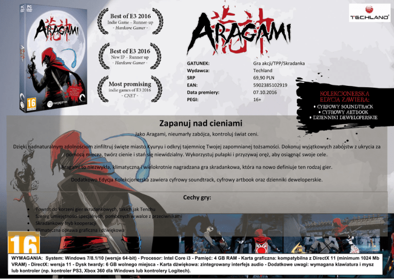 Merge Games GATUNEK: Wydawca: SRP EAN: Data premiery: PEGI: Gra akcji/TPP/Skradanka Techland 69,90 PLN 5902385102919 07.10.2016 16+ Zapanuj nad cieniami Jako Aragami, nieumarły zabójca, kontroluj świat ceni. Dzięki nadnaturalnym zdolnościom zinfiltruj święte miasto Kyuryu i odkryj tajemnicę Twojej zapomnianej tożsamości. Dokonuj wyjątkowych zabójstw z ukrycia za pomocą miecza, twórz cienie i stań się niewidzialny. Wykorzystuj pułapki i przyzywaj oręż, aby osiągnąć swoje cele. Aragami to niezwykła, klimatyczna i wielokrotnie nagradzana gra skradankowa, która na nowo definiuje ten rodzaj gier. Dodatkowo Edycja Kolekcjonerska zawiera cyfrowy soundtrack, cyfrowy artbook oraz dzienniki deweloperskie. Cechy gry: Powrót do korzeni gier skradankowych, takich jak Tenchu Szereg umiejętności specjalnych, pomocnych w walce z przeciwnikami Skradankowy tryb kooperacji Klimatyczna oprawa graficzna i dźwiękowa WYMAGANIA: System: Windows 7/8.1/10 (wersje 64-bit) - Procesor: Intel Core i3 - Pamięć: 4 GB RAM - Karta graficzna: kompatybilna z DirectX 11 (minimum 1024 Mb VRAM) - DirectX: wersja 11 - Dysk twardy: 6 GB wolnego miejsca - Karta dźwiękowa: zintegrowany interfejs audio - Dodatkowe uwagi: wymagana klawiatura i mysz lub kontroler (np. kontroler PS3, Xbox 360 dla Windows lub kontrolery Logitech).