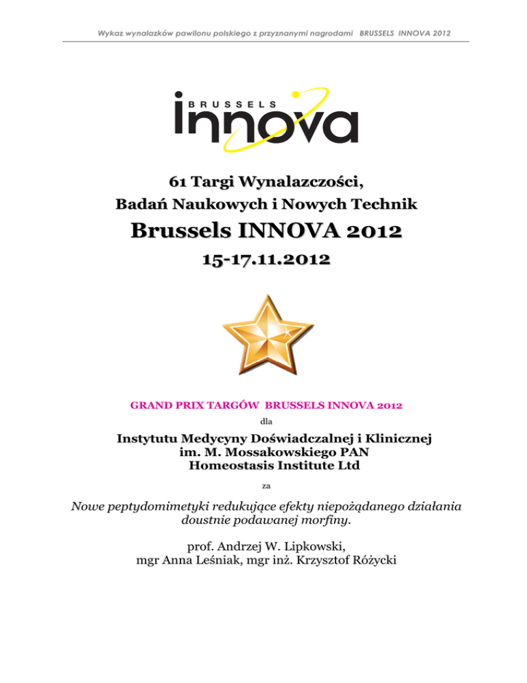 Wykaz wynalazków pawilonu polskiego z przyznanymi nagrodami BRUSSELS INNOVA 2012 61 Targi Wynalazczości, Badań Naukowych i Nowych Technik Brussels INNOVA 2012 15-17.11.2012 GRAND PRIX TARGÓW BRUSSELS INNOVA 2012 dla Instytutu Medycyny Doświadczalnej i Klinicznej im. M. Mossakowskiego PAN Homeostasis Institute Ltd za Nowe peptydomimetyki redukujące efekty niepożądanego działania doustnie podawanej morfiny. prof. Andrzej W. Lipkowski, mgr Anna Leśniak, mgr inż. Krzysztof Różycki Wykaz wynalazków pawilonu polskiego z przyznanymi nagrodami BRUSSELS INNOVA 2012 ZŁOTY MEDAL Z WYRÓŻNIENIEM 1. Instytut Medycyny Doświadczalnej i Klinicznej im. M. Mossakowskiego PAN, Homeostasis Institute Ltd Nowe peptydomimetyki redukujące efekty niepożądanego działania doustnie podawanej morfiny. prof. Andrzej W. Lipkowski, mgr Anna Leśniak, mgr inż. Krzysztof Różycki Nagroda specjalna : Grand Prix 2012 Nagroda specjalna : Stowarzyszenia AGEPI ( Mołdawia) 2. Instytut Matematyki i Kryptologii Wydziału Cybernetyki Wojskowej Akademii Technicznej,; firma KenBIT Sp. J. Uniwersalny System Ochrony Kryptograficznej Łączności Radiowej. prof. dr hab. n. mat. inż. Jerzy Gawinecki z zespołem kryptologów Instytutu Matematyki i Kryptologii Wydziału Cybernetyki Wojskowej Akademii Technicznej oraz inżynierowie firmy KenBIT Sp. J. 3. Przemysłowy Instytut Motoryzacji Urządzenie zmniejszające obciążenia dynamiczne działające na dzieci przewożone w pojazdach samochodowych podczas zderzenia czołowego pojazdu. dr inż. Andrzej Muszyński , mgr inż. Artur Muszyński, mgr inż. Paweł Skoniecki, mgr inż. Karol Zielonka, mgr inż. Paweł Trzaska 4. Politechnika Poznańska, Instytut Technologii Materiałów; Laboratorium Tomografii EPR Sposób lokalizacji zmian nowotworowych i miażdżycowych metodą obrazowania EPRI oraz układ do stosowania tego sposobu. dr hab. Jan Jurga prof. nadzw. PP, dr Tomasz Czechowski, prof. dr hab. Kazimierz Jurga Nagroda specjalna : Ministra Gospodarki Waldemara Pawlaka (Polska) 5. Instytut Metali Nieżelaznych w Gliwicach, Oddział w Legnicy Technologia odzysku wolframu i miedzi z odpadowych złomów wolframowo – miedziowych WCu Wykaz wynalazków pawilonu polskiego z przyznanymi nagrodami BRUSSELS INNOVA 2012 prof. dr inż. Ryszard Chamer, prof. dr. inż. Zbigniew Śmieszek, Ewa Szydłowska – Braszak, Zygmunt Kurek, Arkadiusz Szpakowski, Ryszard Kalinowski, Jan Kopeć, Franciszek Czechowski Nagroda specjalna : Ministra Gospodarki Waldemara Pawlaka (Polska) 6. Małopolskie Centrum Odnawialnych Źródeł Energii „BioEnergia” Bio-Hydrogen urządzenie do produkcji energii elektrycznej z paliw i biopaliw dr inż. Grzegorz Wcisło Nagroda specjalna : Światowej Organizacji Własności Intelektualnej za najlepszy wynalazek 7. Instytut Badawczy Dróg i Mostów Aktywna Inteligentna Bariera Drogowa i Mostowa – AIBDiM mgr inż. Tomasz Kula, mgr inż. Tadeusz Dzienis, mgr inż. Michał Karkowski, mgr inż. Ewa Wicher, mgr Dawid Kucharski Nagroda specjalna : Joelle Milquet, Ministra Zatrudnienia I Równych Szans (Belgia) Nagroda specjalna : Organizacji Europejskich i Francuskich Wynalazców (Francja) 8. Akademia Górniczo-Hutnicza im. Stanisława Staszica w Krakowie (AGH University of Science and Technology Faculty of Computer Science, Electronics and Telecommunication) Zintegrowany moduł reaktancyjny dr inż. Cezary Worek, mgr inż. Robert Maślanka Nagroda specjalna : Tajwańskiego Stowarzyszenia Wynalazców Nagroda specjalna : Organizacji Europejskich i Francuskich Wynalazców (Francja) 9. Instytut Tele- i Radiotechniczny Programowalny sterownik polowy do inteligentnych sieci elektroenergetycznych Smart GridMUPASZ710plus Zespół Naukowo-Badawczy, Centrum Systemów i Aplikacji Sprzętowych, Instytutu Tele- i Radiotechnicznego 10. Przemysłowy Instytut Maszyn Rolniczych w Poznaniu Maszyny nowej generacji do pozyskiwania biomasy z wierzby krzewiastej dr inż. Florian Adamczyk, mgr inż. Paweł Frąckowiak, mgr inż. Stanisław Jankowiak, mgr inż. Wojciech Spychała, mgr inż. Grzegorz Wąchalski, dr hab. inż. Zbyszek Zbytek, prof. nadzw. 11. Politechnika Wrocławska, Wydział Mechaniczny; Instytut Konstrukcji i Eksploatacji Maszyn Połączenie koła czerpakowego z przekładnią mechanizmu urabiania Wykaz wynalazków pawilonu polskiego z przyznanymi nagrodami BRUSSELS INNOVA 2012 prof. dr hab. inż. Eugeniusz Rusiński, dr inż. Marcin Kowalczyk 12. Wydział Nauk Medycznych Uniwersytetu Warmińsko- Mazurskiego w Olsztynie; Uniwersytecki Szpital Kliniczny w Olsztynie System NMFlowMetaAnalyser prof. dr hab. n. med. Andrzej Kukwa, inż. Andrzej Dymek, dr n. med. Wojciech Kukwa 13. Politechnika Wrocławska: Wydział Inżynierii Środowiska, Instytut Inżynierii Ochrony Środowiska I Wydział Chemiczny Technologie bioremediacji środowisk gruntowo-wodnych skażonych węglowodorami dr hab. inż. Kazimierz Grabas prof. PWr, dr hab. Barbara Kołwzan prof. PWr, dr inż. Adam Pawełczyk, dr inż. Mieczysław Steininger 14. Instytut Chemii Przemysłowej im. prof. Ignacego Mościckiego Nowa odmiana polioksymetylenu o poprawionych właściwościach mgr Janusz Stasiński, mgr inż. Lidia Tokarz, mgr Sławomir Pawłowski, dr hab. inż. Regina Jeziórska prof. IChP, dr Maria Zielecka, Ewa Pogorzelska, Jacek Dzierżawski, Alecsandru Florea, Krystyna Cyruchin Nagroda specjalna : W dziedzinie Inżynierii Chemicznej (Belgia) ZŁOTY MEDAL Z WYRÓŻNIENIEM w kategorii MŁODY WYNALAZCA 15. Zespól Szkół Nr 6 im. Króla Jana III Sobieskiego w Jastrzębiu Zdroju, Centrum Kształcenia Praktycznego w Jastrzębiu Zdroju ESKONzO – Elektroniczny System Komunikacji Osób Niepełnosprawnych z Otoczeniem Jakub Król, Maciej Skórzański, Patryk Domagalik, Paweł Krosny, inż. Dariusz Radajewski, mgr inż. Krzysztof Smyczek Nagroda specjalna : Jury Brussels Innova (Belgia) 16. Zespół Szkół w Połańcu - Technikum Elektroniczne „SAFE-STEP” bezpieczna laska dla niewidomych Wykaz wynala