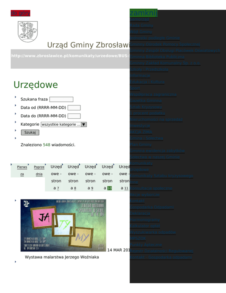 zamknij do góry Samorząd Rada Gminy Wójt Gminy Jednostki podległe Gminie Gminny Ośrodek Pomocy Społecznej Urząd Gminy Zbrosławice Gminny Zespół Obsługi Placówek Oświatowych http://www.zbroslawice.pl/komunikaty/urzedowe/BUS-500-Zbroslawice-21-kwietnia-900-110/ Gminna Biblioteka Publiczna Gminny Zakład Komunalny printpdf/st:10 Sp. z o.o. Szkoły i Przedszkola Informacje Urzędowe Edukacja i Kultura Sport Współpraca zagraniczna Szukana fraza Gazetka Gminna Data od (RRRR-MM-DD) Sztab Kryzysowy 1 procent podatku Data do (RRRR-MM-DD) Nieruchomości na sprzedaż Kategorie wszystkie kategorie ... ▼ Inwestycje AKCJA ZIMA Szukaj Gmina i Sołectwa Plan Gminy Znaleziono 548 wiadomości. Gminna ewidencja zabytków Sołectwa w naszej Gminie Pierws Poprze Urzęd Urzęd Urzęd Urzęd za dnia owe - owe - owe - owe - stron stron stron stron a7 a8 a9 a 10 Komunikaty Urzęd Urzęd Urzęd Następ Ostatni Urzędowe owe owe owe na a Komunikaty Sztabu kryzysowego stron Innestron stron a 11 Konsultacje a 12 a 13 społeczne Akcje wyborcze Kontakt Gospodarka Odpadami Deklaracja Harmonogramy Kalkulator opłat Wyszukiwarka odpadów MPSZOK Punkty Apteczne 14 MAR 2016 Rejestr Działalności Regulowanej Wystawa malarstwa Jerzego Woźniaka Kontakt - Gospodarka odpadami 11 MAR 2016 Misterium Męki Pańskiej w Miedarach 11 MAR 2016 kategoria: Dzień Sołtysa Komunikaty urzędowe Najlepszego! LIZOŃ Mariola (Boniowice) MORAWSKI Wiesław (Czekanów) SUCHOSZEK Wanda (Jasiona) KOLANKOWSKI Andrzej (Jaśkowice) KAPEK Aneta (Kamieniec) GAWRON Maria (Karchowice) KAMIŃSKI Tomasz (Kopienica) TRAUTMANN Bernadeta (Księży Las) SZOŁTYSIK Piotr (Laryszów) KRAŚNIANKA Mirosław (Łubie) KRUSZONA Daniel (Łubki) KUPKA Herbert (Miedary) JANOSZKA Ludwik 09 MAR 2016 Ogłoszenie o trzecim przetargu na sprzedaż działki w Miedarach nr 477/1 kategoria: Komunikaty urzędowe WÓJT GMINY ZBROSŁAWICEogłaszaże w dniu 28 kwietnia 2016 r. o godzinie 1000 w Centrum Usług Publicznychw Zbrosławicach, przy ul. Oświęcimskiej 2a, rozpocznie się trzeci ustny przetarg nieograniczony na sprzedaż prawa własności nieruchomości gruntowej zabudowanej położonej w obrębie Miedary (k.m. 2 Kopa.) określonej następującym numerem działki: działka nr 477/1 o pow. 0,2813 ha; KW nr GL1T/00042811/3Cena wywoławcza 09 MAR 2016 Ogłoszenie o trzecim przetargu na sprzedaż naczepy do przewozu koni kategoria: Komunikaty urzędowe Wójt Gminy Zbrosławiceogłasza trzeci przetarg nieograniczony ofertowy na:„sprzedaż składnika rzeczowego majątku ruchomego" 1. Gmina Zbrosławice z siedzibą w Zbrosławicach przy ul. Oświęcimskiej 2. 2. Miejsce i termin przeprowadzania przetargu: 8 kwietnia 2016r. o godz. 1000 w Centrum Usług Publicznych w Zbrosławicach ul. Oświęcimska 2a. 3. Przetarg na niżej wymieniony składnik majątku ruchomego:Naczepa do przewozu koni 09 MAR 2016 NABÓR WNIOSKÓW O PRZYZNANIE POMOCY NA MODERNIZACJĘ GOSPODARSTW ROLNYCH kategoria: Komunikaty urzędowe Regionalna Fundacja Pomocy Niewidomym informuje, że z dniem 1 marca br. rozpoczęła się rekrutacja dzieci i młodzieży do Specjalnego Ośrodka Szkolno–Wychowawczego: Przedszkola Specjalnego, Szkoły Podstawowej Specjalnej, Gimnazjum Specjalnego w Ziemięcicach przy ul. Mikulczyckiej 120. Do placówki przyjmowane są dzieci i młodzież do 25 roku życia:- niewidome i słabowidzące,- z niepełnosprawnością ruchową, w tym afazją,- z 08 MAR 2016 kategoria: Ogłoszenie Komunikaty urzędowe Wójt Gminy Zbrosławice informuje, że został wywieszony na okres 21 dni, tj. od dnia 04.03.2016 r. do dnia 25.03.2016 r. na tablicy ogłoszeń Urzędu Gminy w Zbrosławicach ul. Oświęcimskiej 2, wykaz nieruchomości przeznaczonych do dzierżawy: działka nr 462/91 o pow. 0,5432 ha (k. m. 2 obręb Zbrosławice), działka nr 92 o pow. 0,1280 ha (k. m. 2 obręb Zbrosławice), działka nr 469/58 o pow. 0,7284 ha (k. m. 2 obręb 08 MAR 2016 Informacja ZGKiM - brak wody w Wieszowie kategoria: Komunikaty urzędowe Zakład Gospodarki Komunalnej i Mieszkaniowej w Zbrosławicach zawiadamia, że w dniu 09.03.2016 w godzinach od 9:00 do 18:00 w Wieszowie przy ulicach Wolności i Górnej wystąpi przerwa w dostawie wody z powodu prac na sieci wodociągowej.W wyniku wykonywanych prac mogą wystąpić zabrudzenia wody spowodowane zaburzeniami przepływów na sieci.Przepraszamy za utrudnienia. 03 MAR 2016 Ogłoszenie kategoria: Komunikaty urzędowe O g ł o s z e n i e Wójt Gminy Zbrosławice informuje, że został wywieszony na okres 21 dni tj. od 1 marca 2016 r. do 22 marca 2016 r. na tablicy ogłoszeń Urzędu Gminy Zbrosławice przy ul. Oświęcimskiej 2, wykaz nieruchomości przeznaczonych do sprzedaży.Wykazem objęto nieruchomość gruntową niezabudowaną położoną w obrębie Kopienica (k.m. 1 dod. 2) określoną nr działek 1083/317 i 1084/317 o pow. 0,1428 ha, zapisaną w 03 MAR 2016 UWAGA ROLNIKU! kategoria: Komunikaty urzędowe Informacja w sprawie terminu składania wniosków o przyznanie płatności bezpośrednich oraz płatności obszarowych w 2016 r. Agencji Restrukturyzacji i Modernizacji Rolnictwa od 15 marca 2016 r. do 15 maja 2016 r. rozpocznie przyjmowanie wniosków o przyznanie płatności bezpośrednich oraz płatności obszarowych za bieżący rok. Wypełnione wnioski można składać osobiście w Biurze Powiatowym ARiMR w Nakle Śląskim przy ul. Pierws Poprze Urzęd Urzęd Urzęd Urzęd Urzęd Urzęd Urzęd Następ Ostatni za dnia owe - owe - owe - owe - owe - owe - owe - na a stron stron stron stron stron stron stron a7 a8 a9 a a 11 a 12 a 13 10