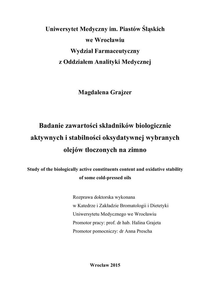Uniwersytet Medyczny im. Piastów Śląskich we Wrocławiu Wydział Farmaceutyczny z Oddziałem Analityki Medycznej Magdalena Grajzer Badanie zawartości składników biologicznie aktywnych i stabilności oksydatywnej wybranych olejów tłoczonych na zimno Study of the biologically active constituents content and oxidative stability of some cold-pressed oils Rozprawa doktorska wykonana w Katedrze i Zakładzie Bromatologii i Dietetyki Uniwersytetu Medycznego we Wrocławiu Promotor pracy: prof. dr hab. Halina Grajeta Promotor pomocniczy: dr Anna Prescha Wrocław 2015 STRESZCZENIE PRACY Na świecie obserwuje się rosnące zainteresowanie konsumentów zdrowym stylem życia, którego elementem jest wzbogacanie diety w produkty zawierające składniki o właściwościach prozdrowotnych. W tym celu m.in. zastępuje się w jadłospisie tłuszcze zwierzęce olejami roślinnymi, które są nie tylko źródłem nienasyconych kwasów tłuszczowych, ale także innych substancji bioaktywnych, w tym fitosteroli i związków wykazujących właściwości przeciwutleniające. Doniesienia dotyczące zawartości bioaktywnych mikroskładników, takich jak fitosterole, tokochromanole, karotenoidy, związki fenolowe w olejach roślinnych są skąpe, a dostępne wyniki analiz są często rozbieżne Celem pracy było oznaczenie zawartości składników bioaktywnych w dostępnych na polskim rynku olejach tłoczonych na zimno z nasion dzikiej róży, orzechów włoskich i lnianki, a także zbadanie ich potencjału przeciwutleniającego i stabilności oksydatywnej. Badano cztery oleje tłoczone na zimno: olej z nasion dzikiej róży dwóch producentów (1 i 2), olej z orzechów włoskich i olej z lnianki. Oleje otrzymano bezpośrednio od producentów w terminie nie dłuższym niż tydzień od zakończenia ich produkcji. Zakres badań obejmował oznaczanie składników biologicznie aktywnych w olejach z dzikiej róży, z lnianki i orzechów włoskich oraz ich stabilność oksydatywną. Oznaczenia składu kwasów tłuszczowych oraz zawartość: fitosteroli i skwalenu, tokoferoli, karetonoidów i polifenoli, wykonano następującymi metodami: chromatografii gazowej GC i GC-‐MS, wysokosprawnej chromatografii cieczowej UPLC i UPLC-‐MS. Badano również ich potencjał przeciwutleniający 2 metodami: DPPH i ORAC. W badaniu stabilności oksydatywnej oceniano postęp procesu starzenie się w olejach w temperaturze pokojowej, po 3 i 6 miesiącach wykorzystując oznaczenia takich liczb jak: kwasowa, nadtlenkowa, anizydynowa, jodową oraz zawartości sprzężonych dienów i trienów. Stabilność oksydatywną badano także wykorzystując technikę różnicowej kalorymetrii skaningowej (DSC). Parametry utleniania wykonane metodą DSC oznaczono zarówno w próbach olejów nieoczyszczonych i oczyszczonych ze składników frakcji nieglicerolowej. Na podstawie uzyskanych wyników stwierdzono, że spośród badanych olejów bogatych w kwas α-linolenowy olej z dzikiej róży może stanowić cenne źródło lipofilowych przeciwutleniaczy w szczególności γ- i δ-tokoferolu, jak i karotenoidów: β-karotenu oraz likopenów, będących związkami o znacznej przyswajalności. Olej z orzechów włoskich zawierał znaczące ilości polifenoli wśród, których po raz pierwszy zidentyfikowano w dużych ilościach wielkocząsteczkowe ellagotaniny hydrolizujące, których występowanie może sugerować szersze spektrum właściwości prozdrowotnych tego oleju, poza wykazanym działaniem normalizującym profil lipidowy. Ocena stabilności oksydatywnej olejów wskazuje, że w czasie ich przechowywania oraz w warunkach izotermicznego starzenia oksydatywnego istotną rolę ochronną odgrywały polifenole, natomiast w warunkach ogrzewania do wysokich temperatur – przeciwutleniacze lipofilne. Słowa kluczowe: olej z dzikiej róży, olej z lnianki, olej z orzechów włoskich, kwasy tłuszczowe, fitosterole, tokoferole, polifenole, DPPH, ORAC, różnicowa kalorymetria skaningowa DSC