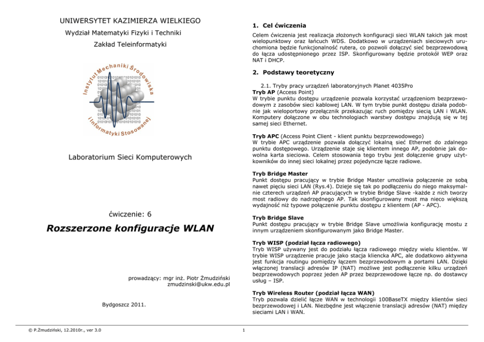 UNIWERSYTET KAZIMIERZA WIELKIEGO 1. Cel ćwiczenia Wydział Matematyki Fizyki i Techniki Celem ćwiczenia jest realizacja złożonych konfiguracji sieci WLAN takich jak most wielopunktowy oraz łańcuch WDS. Dodatkowo w urządzeniach sieciowych uruchomiona będzie funkcjonalność rutera, co pozwoli dołączyć sieć bezprzewodową do łącza udostępnionego przez ISP. Skonfigurowany będzie protokół WEP oraz NAT i DHCP. Zakład Teleinformatyki 2. Podstawy teoretyczny 2.1. Tryby pracy urządzeń laboratoryjnych Planet 4035Pro Tryb AP (Access Point) W trybie punktu dostępu urządzenie pozwala korzystać urządzeniom bezprzewodowym z zasobów sieci kablowej LAN. W tym trybie punkt dostępu działa podobnie jak wieloportowy przełącznik przekazując ruch pomiędzy siecią LAN i WLAN. Komputery dołączone w obu technologiach warstwy dostępu znajdują się w tej samej sieci Ethernet. Tryb APC (Access Point Client - klient punktu bezprzewodowego) W trybie APC urządzenie pozwala dołączyć lokalną sieć Ethernet do zdalnego punktu dostępowego. Urządzenie staje się klientem innego AP, podobnie jak dowolna karta sieciowa. Celem stosowania tego trybu jest dołączenie grupy użytkowników do innej sieci lokalnej przez pojedyncze łącze radiowe. Laboratorium Sieci Komputerowych Tryb Bridge Master Punkt dostępu pracujący w trybie Bridge Master umożliwia połączenie ze sobą nawet pięciu sieci LAN (Rys.4). Dzieje się tak po podłączeniu do niego maksymalnie czterech urządzeń AP pracujących w trybie Bridge Slave -każde z nich tworzy most radiowy do nadrzędnego AP. Tak skonfigurowany most ma nieco większą wydajność niż typowe połączenie punktu dostępu z klientem (AP - APC). ćwiczenie: 6 Tryb Bridge Slave Punkt dostępu pracujący w trybie Bridge Slave umożliwia konfigurację mostu z innym urządzeniem skonfigurowanym jako Bridge Master. Rozszerzone konfiguracje WLAN Tryb WISP (podział łącza radiowego) Tryb WISP używany jest do podziału łącza radiowego między wielu klientów. W trybie WISP urządzenie pracuje jako stacja kliencka APC, ale dodatkowo aktywna jest funkcja routingu pomiędzy łączem bezprzewodowym a portami LAN. Dzięki włączonej translacji adresów IP (NAT) możliwe jest podłączenie kilku urządzeń bezprzewodowych poprzez jeden AP przez bezprzewodowe łącze np. do dostawcy usług – ISP. prowadzący: mgr inż. Piotr Żmudziński [email protected] Tryb Wireless Router (podział łącza WAN) Tryb pozwala dzielić łącze WAN w technologii 100BaseTX między klientów sieci bezprzewodowej i LAN. Niezbędne jest włączenie translacji adresów (NAT) między sieciami LAN i WAN. Bydgoszcz 2011. © P.Żmudziński, 12.2010r., ver 3.0 1 Tryb WDS/Repeater Urządzenia AP pracujące w trybie WDS (Wireless Distribution System) umożliwiają pokrycie zasięgiem sieci bezprzewodowej dużego obszaru. Każda ze stacji bazowych WDS może nawiązywać jednoczesne połączenia z wieloma hostami bezp.zewodowymi a zarazem komunikować się w trybie mostu bezprzewodowego z sześcioma innymi stacjami bazowymi. Stacje bazowe muszą pracować na tym samym kanale i w tym samym standardzie (802.11b lub 802.11g). 2.2. Identyfikacja sieci bezprzewodowych Aby dowolna stacja była członkiem sieci IBSS/ BSS czyli była z nią skojarzona konieczne jest uzyskanie kilku istotnych informacji: typu BSS, BSSID, SSID (nazwy sieci), kanału transmisji. Dostępne są dwa mechanizmy skanowania: pasywny i aktywny. Pasywny mechanizm polega na wykorzystaniu mechanizmu oszczędzania energii, który narzuca na AP wysyłanie co określony interwał czasu rozgłoszenia Beacon w którym można otrzymać potrzebne informacje i podjąć próbę skojarzenia z AP wysyłając Association Request. Skanowanie aktywne polega na wysłaniu ramki Probe Request na MAC adres rozgłoszeniowy (same jedynki). AP ma obowiązek odpowiedzenia ramką Probe Response. Na podstawie odebranych odpowiedzi stacja może wybrać AP o najsilniejszym sygnale i podjąć próbę skojarzenia. Warto nadmienić, że ramka 802.11 4 pola MAC, jednak najczęściej ostatnie pole adresowe jest pomijane i przesyła się jedynie: − MAC adres odbiorcy, − MAC adres nadawcy, − BSSID – MAC adres AP. Rys. 1 Bezpieczeństwo sieci WLAN 2.3.1. Uwierzytelnienie typu open-system W tym trybie AP nie wymaga od stacji sieciowych żadnych informacji na temat tożsamości. Pierwsza ramka jest formalnie żądaniem uwierzytelnienia (Authentication Request) zawierającym pole algorytm uwierzytelnienia (Authentication Algorithm Identification), ustawione na wartość 0. Ramka Authentication Response, odsyłana przez punkt dostępowy, zawiera wynik operacji uwierzytelnienia — Status Code. W praktyce oznacza to akceptację wszystkich klientów. 2.3.2. Uwierzytelnianie typu shared-key Uwierzytelnianie typu shared-key (Rys.6) wykorzystuje klucz współdzielony przez oba urządzenia [1]. W pierwszej ramce pole algorytm uwierzytelniania (Ąuthentication Algorithm) ma wartość 1. Odpowiedź od punktu dostępowego zawiera żądanie uwierzytelnienia oraz pole Challenge Text będące 128-bajtowym, losowo wygenerowanym tekstem. Trzecia ramka zostaje zaszyfrowana za pomocą protokołu WEP. Jeśli po odebraniu przez punkt dostępowy uda mu się odszyfrować tekst zawarty w polu Challenge Text i okaże się on identyczny z poprzednio wysłanym, stacja zostaje uwierzytelniona. Potwierdzeniem jest wysłanie czwartej ramki z polem Status Code zawierającym wynik uwierzytelnienia. 2.3. Aspekt bezpieczeństwa sieci WLAN Karta sieciowa lub interfejs radiowy AP emituje falę EM zgodnie z charakterystyką anteny. Bardzo często jest to charakterystyka dookólna, co sprawia że potencjalni użytkownicy systemu mogą znajdować się na określonym obszarze, który producenci zwykle określają jako 80-100m w pomieszczeniach oraz 300m na wolnej przestrzeni. Bezpieczeństwo sieci WLAN zapewniają dwa mechanizmy: - mechanizm uwierzytelniania czyli kontroli, który 