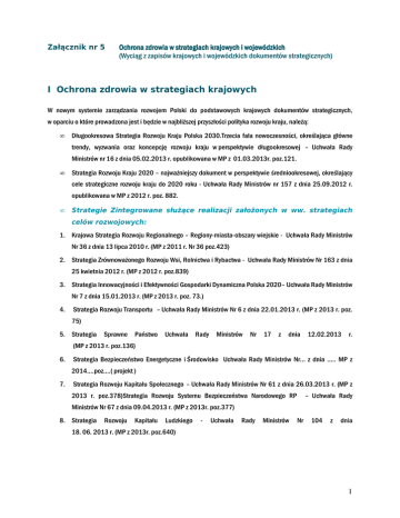 Załącznik nr 5 Ochrona zdrowia w strategiach krajowych i wojewódzkich (Wyciąg z zapisów krajowych i wojewódzkich dokumentów strategicznych) I Ochrona zdrowia w strategiach krajowych W nowym systemie zarządzania rozwojem Polski do podstawowych krajowych dokumentów strategicznych, w oparciu o które prowadzona jest i będzie w najbliższej przyszłości polityka rozwoju kraju, należą: • Długookresowa Strategia Rozwoju Kraju Polska 2030.Trzecia fala nowoczesności, określająca główne trendy, wyzwania oraz koncepcję rozwoju kraju w perspektywie długookresowej – Uchwała Rady Ministrów nr 16 z dnia 05.02.2013 r. opublikowana w MP z 01.03.2013r. poz.121. • Strategia Rozwoju Kraju 2020 – najważniejszy dokument w perspektywie średniookresowej, określający cele strategiczne rozwoju kraju do 2020 roku - Uchwała Rady Ministrów nr 157 z dnia 25.09.2012 r. opublikowana w MP z 2012 r. poz. 882. • Strategie Zintegrowane służące realizacji założonych w ww. strategiach celów rozwojowych: 1. Krajowa Strategia Rozwoju Regionalnego – Regiony-miasta-obszary wiejskie - Uchwała Rady Ministrów Nr 36 z dnia 13 lipca 2010 r. (MP z 2011 r. Nr 36 poz.423) 2. Strategia Zrównoważonego Rozwoju Wsi, Rolnictwa i Rybactwa - Uchwała Rady Ministrów Nr 163 z dnia 25 kwietnia 2012 r. (MP z 2012 r. poz.839) 3. Strategia Innowacyjności i Efektywności Gospodarki Dynamiczna Polska 2020– Uchwała Rady Ministrów Nr 7 z dnia 15.01.2013 r. (MP z 2013 r. poz. 73.) 4. Strategia Rozwoju Transportu – Uchwała Rady Ministrów Nr 6 z dnia 22.01.2013 r. (MP z 2013 r. poz. 75) 5. Strategia Sprawne Państwo Uchwała Rady Ministrów Nr 17 z dnia 12.02.2013 r. (MP z 2013 r. poz.136) 6. Strategia Bezpieczeństwo Energetyczne i Środowisko Uchwała Rady Ministrów Nr… z dnia ….. MP z 2014….poz….( projekt ) 7. Strategia Rozwoju Kapitału Społecznego – Uchwała Rady Ministrów Nr 61 z dnia 26.03.2013 r. (MP z – Uchwała Rady 2013 r. poz.378)Strategia Rozwoju Systemu Bezpieczeństwa Narodowego RP Ministrów Nr 67 z dnia 09.04.2013 r. (MP z 2013r. poz.377) 8. Strategia Rozwoju Kapitału Ludzkiego - Uchwała Rady Ministrów Nr 104 z dnia 18. 06. 2013 r. (MP z 2013r. poz.640) 1 Problemy ochrony zdrowia oraz cele i kierunki interwencji w tym obszarze zostały uwzględnione w Długookresowej Strategii Rozwoju Kraju Polska 2030 - DSRK i w Strategii Rozwoju Kraju 2020 - ŚSRK oraz w strategiach zintegrowanych w szczególności w: Strategii Rozwoju Kapitału Ludzkiego, Strategii Sprawne Państwo, Krajowej Strategii Rozwoju Regionalnego – Regiony – miasta - obszary wiejskie. Strategii Innowacyjności i Efektywności Gospodarki Dynamiczna Polska 2020 Strategii Zrównoważonego Rozwoju Wsi , Rolnictwa i Rybactwa na lata 2012-2020. 1. Długookresowa Strategia Rozwoju Kraju Polska 2030 Celem głównym Długookresowej Strategii Rozwoju Kraju Polska 2030. Trzecia Fala Nowoczesności jest poprawa jakości życia Polaków. W świetle zapisów strategii, zapewnienie efektywnej opieki zdrowotnej jest jednym z kluczowych warunków dla tworzenia optymalnego rozwoju w XXI wieku. W DSRK inwestycje w zdrowie traktowane są jako tzw. wydatki prorozwojowe, dzięki którym możliwe jest dążenie do kompleksowego rozwoju „jakości życia” jako dobrostanu w różnych obszarach bytu, które przejawia się m.in. w długości życia w zdrowiu. Z punktu widzenia długofalowych wyzwań rozwojowych Polski najistotniejsze staje się stworzenie warunków dla poprawy wskaźników dzietności, modernizacja struktury wydatków publicznych, co oznacza wzrost inwestycji publicznych, nakładów na naukę, badania, kulturę oraz zdrowie. zdrowie Długofalowy rozwój Polski, a także istotnie zwiększenie szans na osiągnięcie zakładanych celów zatrudnienia osób w wieku 60+ nie będą możliwe bez znacząco większych nakładów na profilaktykę i promocję prozdrowotnych wzorców stylu życia. Długookresowa Strategia Strategia Rozwoju Kraju prezentuje nowe podejście do działań prozdrowotnych, traktując dobrostan zdrowotny społeczeństwa, jako integralną zmienną charakteryzującą jakość kapitału ludzkiego. Konsekwencją takiego podejścia jest umiejscowienie zagadnień dotyczących dotyczących ochrony zdrowia w celu 6 pn. Rozwój kapitału ludzkiego poprzez wzrost zatrudnienia i stworzenie „workfare state1.”. Dobry stan zdrowia populacji został uznany za istotną przesłankę poprawy jakości życia. Zmniejszenie przedwczesnej umieralności, zachorowalności i niepełnosprawności uwarunkowane jest przyspieszeniem postępów w zwalczaniu szkodliwych dla zdrowia zachowań i warunków, które prowadzą do większej zapadalności na choroby cywilizacyjne (głównie nowotwory, choroby układu oddechowego, układu krążenia, cukrzycę i choroby psychiczne). Zgodnie z zapisami strategii niezbędne jest zintensyfikowanie działań profilaktycznych promujących 1 workfare state -system, w którym podstawowym czynnikiem odpowiedzialnym za indywidualny dobrostan jest zatrudnienie 2 zdrowy styl życia, wdrożenie działań eliminujących różnice w zdrowiu wynikające między innymi z uwarunkowań społecznych oraz poprawa dostępu do wysokiej jakości usług zdrowotnych, tak aby umożliwić szybki i efektywny powrót na rynek pracy. Długookresowa Strategia Rozwoju Kraju definiuje w obszarze zdrowia następujące kierunki interwencji: - Wdrożenie instrumentów podnoszących jakość świadczonych usług zdrowotnych i efektywność systemu opieki zdrowotnej . Powyższe zostanie osiągnięte m.in. poprzez wprowadzenie zmian w zarządzaniu i finansowaniu ochrony zdrowia w obszarach o zasadniczym znaczeniu dla sprostania obecnym i nadchodzącym wyzwaniom cywilizacyjnym, gospodarczym i demograficznym. Wskazany kierunek interwencji realizowany będzie również poprzez wdrażanie systemów stałej poprawy jakości w ochronie zdrowia, poprawę infrastruktury ochrony zdrowia, rozwój bazy dydaktycznej uczelni