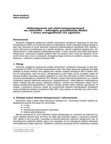 Marek Zmyślony1 Halina Aniołczyk2 Oddziaływanie pól elektromagnetycznych na człowieka – metodyka prowadzenia badań i ocena wiarygodności ich wyników Streszczenie Możliwość wystąpienia negatywnych skutków zdrowotnych wywołanych ekspozycją na pola elektromagnetyczne (PEM) od lat budzi powszechne zaniepokojenie. Środki masowego przekazu podają co jakiś czas informacje na temat obserwacji naukowych potwierdzających szkodliwość PEM. Niestety z reguły informacje te przedstawiane są w sposób niewłaściwy, poprzez uogólnianie pojedynczych, niepotwierdzonych i często błędnych metodologicznie badań. W pracy omówiono typy badań dotyczących biologicznych i zdrowotnych skutków działania PEM oraz kryteria, które muszą być spełnione, by ich wyniki można było uznać za wiarygodne. Szczególną uwagę zwrócono na problemy związane z oceną ekspozycji – zwłaszcza w aspekcie pomiarów PEM. 1. Wstęp Możliwość wystąpienia negatywnych skutków zdrowotnych wywołanych ekspozycją na pola elektromagnetyczne (PEM) od lat budzi zaniepokojenie osób, które takiej ekspozycji podlegają (lub będą podlegać na skutek instalacji coraz większej ilości różnych urządzeń emitujących PEM w pobliżu miejsca ich zamieszkania, nauki lub pracy). Zaniepokojenie to jest między innymi rezultatem pogoni za sensacją środków masowego przekazu podających co jakiś czas informacje na temat obserwacji naukowych potwierdzających szkodliwość PEM. Niestety z reguły informacje przedstawiane są w sposób niewłaściwy, poprzez uogólnianie pojedynczych, niepotwierdzonych i często błędnych metodologicznie badań. Praktyka taka jest wysoce, społecznie szkodliwa i powinna być eliminowana między innymi poprzez przedstawianie społeczeństwu i władzom różnego szczebla wiedzy rzetelnej i sprawdzonej. W związku z powyższym konieczne wydaje się przypomnienie aktualnie obowiązujących (przyjętych) zasad prawidłowej metodyki prowadzenia badań PEM i jego wpływu na człowieka oraz oceny wiarygodności uzyskiwanych wyników. 2. Rodzaje badań efektów biologicznych i zdrowotnych Wyróżniamy cztery rodzaje badań dotyczących biologicznych i zdrowotnych skutków działania jakiegokolwiek czynnika fizycznego czy chemicznego: in vitro, in vivo, laboratoryjne eksponowanych ochotników, badania epidemiologiczne. Badania izolowanych (in vitro) składników układu biologicznego (np. izolowane lub hodowane komórki, składniki komórek takie, jak błony czy DNA) dają możliwość wglądu w mechanizmy działania PEM. Układy in vitro są proste i pozwalają na kontrolę wybranych zmiennych biologicznych oraz na identyfikowanie subtelnych efektów, gdyż w tym przypadku nie ma maskujących skutków odpowiedzi homeostatycznej całego organizmu. Dodatkowo możliwość precyzyjnej kontroli temperatury podczas 1 2 Instytut Medycyny Pracy w Łodzi Instytut Medycyny Pracy w Łodzi 1 ekspozycji preparatów pozwala na rozróżnienie oddziaływań termicznych i nietermicznych PEM. Badania in vitro pozwalają na identyfikowanie efektów testowanych in vivo. Należy z całą mocą podkreślić, że jakiekolwiek wyrokowanie o szkodliwości PEM na podstawie wyników badań in vitro jest nieuprawnione, gdyż jak to stwierdziliśmy wyżej efekty obserwowane na tym poziomie mogą być maskowane lub znoszone przez układ homeostazy całego organizmu. Przypomnijmy, że w organizmie człowieka działają mechanizmy adaptacyjne, kompensacyjne i regeneracyjne, dzięki którym wpływ czynników zewnętrznych w znacznym stopniu (o ile nie całkowicie) jest naturalnie ograniczany. Niekiedy zdarza się nawet, że obserwowane efekty biologiczne są związane z odpowiedzią układów homeostazy. Paradoksalnie świadczą więc o zdrowiu organizmu, a nie o jego chorobie (np. przyspieszenie akcji serca, zmiany krzywej EKG, EEG, zwiększone zużycie materiałów energetycznych) (Szmigielski i wsp., 1992). Jak wspomniano, na podstawie wyników badań in vitro można zaplanować konieczne badania na zwierzętach (in vivo) celem określenia sumarycznej odpowiedzi różnych układów organizmu, utrzymujących homeostazę niezbędną do prawidłowego funkcjonowania. Wnioski na temat efektów biologicznych i zdrowotnych uzyskane na podstawie badań z dużą ostrożnością należy przenosić na człowieka. Należy pamiętać o kilku faktach: rozkład absorbowanej energii dla PEM o danej częstotliwości (który w znacznym stopniu determinuje efekty biologiczne) ze względu na różnice w budowie jest inny dla człowieka i zwierzęcia; przy rozważaniu odpowiedzi termicznych należy uwzględnić ich różnice zależne od gatunku zwierzęcia, a także różnice temperatury zewnętrznej, względnej wilgotności i przepływu powietrza występujące podczas eksperymentów; istnieje możliwość występowania specyficznych dla danego gatunku zwierzęcia mechanizmów wywołujących chorobę (innych niż mechanizmy zachodzące w organizmie człowieka); choroba może zależeć także od płci i wieku zwierzęcia, długości i intensywności ekspozycji. Cennych danych na temat reakcji organizmu ludzkiego na PEM dostarczają badania ochotników eksponowanych w warunkach kontrolowanych. Mogą one jednak dotyczyć ekspozycji krótkotrwałych i efektów z nimi związanych (np. zmiany EKG czy EEG podczas stosowania telefonów komórkowych, wartości progowe ogrzewania i bólu skóry, efektów słuchowych, itp.). W takim, eksperymentalnym układzie nie ma możliwości prowadzenia badań ekspozycji długotrwałych. Przy badaniach epidemiologicznych efektów wywołanych przez PEM szczególnie użyteczne są porównawcze, kliniczne badania ograniczonej liczby osób eksponowanych i osób z grupy kontrolnej (np. osoby używające i nieużywające telefonów komórkowych, pracownicy techniczni stacji elektroenergetycznych i personel administracyjny tych stacji, osoby mieszkające w bezpośredniej bliskości stacji nadawczych tele