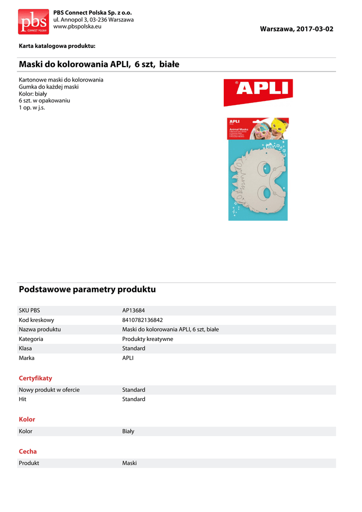 PBS Connect Polska Sp. z o.o. ul. Annopol 3, 03-236 Warszawa www.pbspolska.eu Karta katalogowa produktu: Maski do kolorowania APLI, 6 szt, białe Kartonowe maski do kolorowania Gumka do każdej maski Kolor: biały 6 szt. w opakowaniu 1 op. w j.s. Podstawowe parametry produktu SKU PBS AP13684 Kod kreskowy 8410782136842 Nazwa produktu Maski do kolorowania APLI, 6 szt, białe Kategoria Produkty kreatywne Klasa Standard Marka APLI Certyfikaty Nowy produkt w ofercie Standard Hit Standard Kolor Kolor Biały Cecha Produkt Maski Warszawa, 2017-03-02 PBS Connect Polska Sp. z o.o. ul. Annopol 3, 03-236 Warszawa www.pbspolska.eu Karta katalogowa produktu cd. Maski do kolorowania APLI, 6 szt, białe Podstawowe parametry produktu Typ Kartonowe Rodzaj Do kolorowania Materiał Karton W ofercie od 2015-03 Jednostki logistyczne Opakowanie 1 12 op Opakowanie 2 144 op Warszawa, 2017-03-02