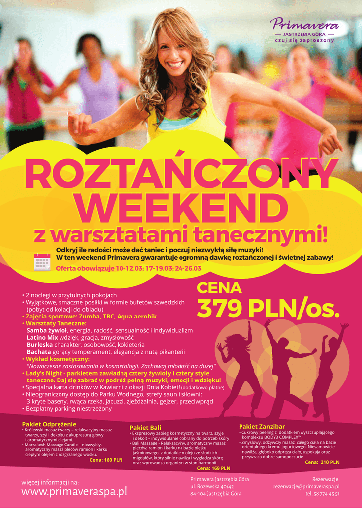 ROZTAŃCZONY WEEKEND z warsztatami tanecznymi! Odkryj ile radości może dać taniec i poczuj niezwykłą siłę muzyki! W ten weekend Primavera gwarantuje ogromną dawkę roztańczonej i świetnej zabawy! Oferta obowiązuje 10-12.03; 17-19.03; 24-26.03 CENA • 2 noclegi w przytulnych pokojach • Wyjątkowe, smaczne posiłki w formie bufetów szwedzkich (pobyt od kolacji do obiadu) • Zajęcia sportowe: Zumba, TBC, Aqua aerobik • Warsztaty Taneczne: Samba żywioł, energia, radość, sensualność i indywidualizm Latino Mix wdzięk, gracja, zmysłowość Burleska charakter, osobowość, kokieteria Bachata gorący temperament, elegancja z nutą pikanterii • Wykład kosmetyczny: "Nowoczesne zastosowania w kosmetologii. Zachowaj młodość na dużej" • Lady’s Night - parkietem zawładną cztery żywioły i cztery style taneczne. Daj się zabrać w podróż pełną muzyki, emocji i wdzięku! • Specjalna karta drinków w Kawiarni z okazji Dnia Kobiet! (dodatkowo płatne) • Nieograniczony dostęp do Parku Wodnego, strefy saun i siłowni: 3 kryte baseny, rwąca rzeka, jacuzzi, zjeżdżalnia, gejzer, przeciwprąd • Bezpłatny parking niestrzeżony 379 PLN/os. Pakiet Odprężenie • Królewski masaż twarzy – relaksacyjny masaż twarzy, szyi i dekoltu z akupresurą głowy i aromatycznymi olejami. • Marrakesh Massage Candle – niezwykły, aromatyczny masaż pleców ramion i karku ciepłym olejem z rozgrzanego wosku. Cena: 160 PLN Pakiet Bali • Ekspresowy zabieg kosmetyczny na twarz, szyje i dekolt – indywidulanie dobrany do potrzeb skóry • Bali Massage - Relaksacyjny, aromatyczny masaż pleców, ramion i karku na bazie olejku jaśminowego z dodatkiem oleju ze słodkich migdałów, który silnie nawilża i wygładza skórę oraz wprowadza organizm w stan harmonii Pakiet Zanzibar • Cukrowy peeling z dodatkiem wyszczuplającego kompleksu BODY3 COMPLEX™. • Zmysłowy, odżywczy masaż całego ciała na bazie orientalnego kremu jogurtowego. Niesamowicie nawilża, głęboko odpręża ciało, uspokaja oraz przywraca dobre samopoczucie Cena: 169 PLN więcej informacji na: www.primaveraspa.pl Primavera Jastrzębia Góra ul. Rozewska 40/42 84-104 Jastrzębia Góra Cena: 210 PLN Rezerwacje: [email protected] tel. 58 774 45 51