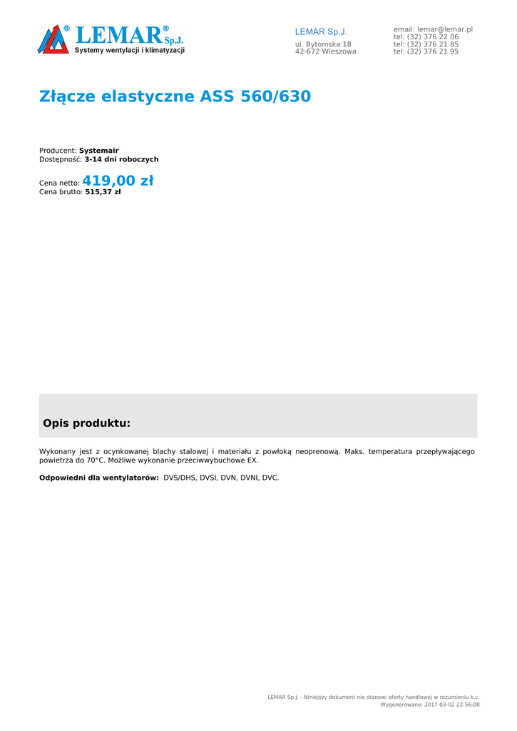 LEMAR Sp.J. ul. Bytomska 18 42-672 Wieszowa email: [email protected] tel: (32) 376 22 06 tel: (32) 376 21 85 tel: (32) 376 21 95 Złącze elastyczne ASS 560/630 Producent: Systemair Dostępność: 3-14 dni roboczych 419,00 zł Cena netto: Cena brutto: 515,37 zł Opis produktu: Wykonany jest z ocynkowanej blachy stalowej i materiału z powłoką neoprenową. Maks. temperatura przepływającego powietrza do 70°C. Możliwe wykonanie przeciwwybuchowe EX. Odpowiedni dla wentylatorów: DVS/DHS, DVSI, DVN, DVNI, DVC. LEMAR Sp.J. - Niniejszy dokument nie stanowi oferty handlowej w rozumieniu k.c. Wygenerowano: 2017-03-02 22:56:08 Powered by TCPDF (www.tcpdf.org)