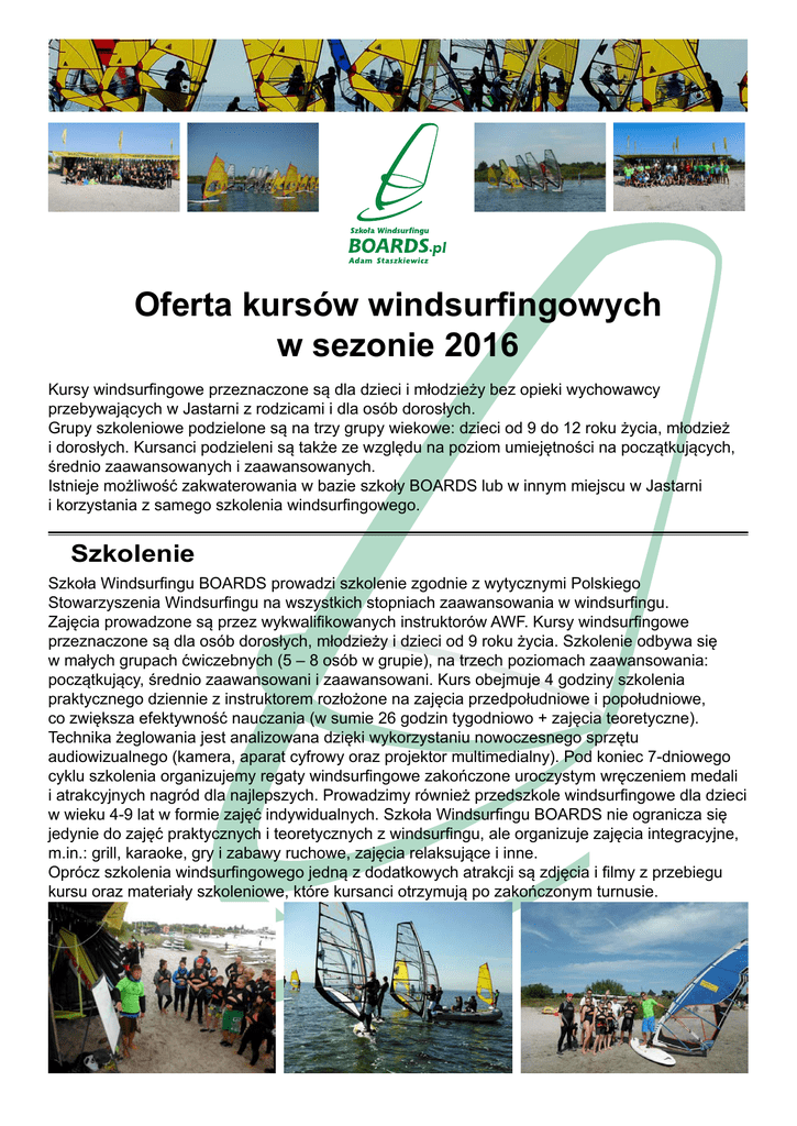 Oferta kursów windsurfingowych w sezonie 2016 Kursy windsurfingowe przeznaczone są dla dzieci i młodzieży bez opieki wychowawcy przebywających w Jastarni z rodzicami i dla osób dorosłych. Grupy szkoleniowe podzielone są na trzy grupy wiekowe: dzieci od 9 do 12 roku życia, młodzież i dorosłych. Kursanci podzieleni są także ze względu na poziom umiejętności na początkujących, średnio zaawansowanych i zaawansowanych. Istnieje możliwość zakwaterowania w bazie szkoły BOARDS lub w innym miejscu w Jastarni i korzystania z samego szkolenia windsurfingowego. Szkolenie Szkoła Windsurfingu BOARDS prowadzi szkolenie zgodnie z wytycznymi Polskiego Stowarzyszenia Windsurfingu na wszystkich stopniach zaawansowania w windsurfingu. Zajęcia prowadzone są przez wykwalifikowanych instruktorów AWF. Kursy windsurfingowe przeznaczone są dla osób dorosłych, młodzieży i dzieci od 9 roku życia. Szkolenie odbywa się w małych grupach ćwiczebnych (5 – 8 osób w grupie), na trzech poziomach zaawansowania: początkujący, średnio zaawansowani i zaawansowani. Kurs obejmuje 4 godziny szkolenia praktycznego dziennie z instruktorem rozłożone na zajęcia przedpołudniowe i popołudniowe, co zwiększa efektywność nauczania (w sumie 26 godzin tygodniowo + zajęcia teoretyczne). Technika żeglowania jest analizowana dzięki wykorzystaniu nowoczesnego sprzętu audiowizualnego (kamera, aparat cyfrowy oraz projektor multimedialny). Pod koniec 7-dniowego cyklu szkolenia organizujemy regaty windsurfingowe zakończone uroczystym wręczeniem medali i atrakcyjnych nagród dla najlepszych. Prowadzimy również przedszkole windsurfingowe dla dzieci w wieku 4-9 lat w formie zajęć indywidualnych. Szkoła Windsurfingu BOARDS nie ogranicza się jedynie do zajęć praktycznych i teoretycznych z windsurfingu, ale organizuje zajęcia integracyjne, m.in.: grill, karaoke, gry i zabawy ruchowe, zajęcia relaksujące i inne. Oprócz szkolenia windsurfingowego jedną z dodatkowych atrakcji są zdjęcia i filmy z przebiegu kursu oraz materiały szkoleniowe, które kursanci otrzymują po zakończonym turnusie. Sprzęt windsurfingowy Szkoła windsurfingu BOARDS posiada 150 desek wypornościowych i ślizgowych w zakresie wyporności od 80 do 240 litrów oraz 150 pędników (żagli dakronowych i monofilmowych) dostosowanych do każdych warunków wietrznych i etapu szkolenia o powierzchni od 1 do 8 m2. Wielkość i typ sprzętu jest dobierany indywidualnie w zależności od umiejętności kursanta i warunków wietrznych. Dysponujemy wszystkimi rozmiarami pianek windsurfingowych, trapezów i kamizelek asekuracyjnych. Ze względów bezpieczeństwa uczestnicy szkolenia windsurfingowego, muszą posiadać obowiązkowe buty do pływania (windsurfingowe, trampki lub tenisówki). Akwen Półwysep Helski należy do najlepszych miejsc w Europie do nauki i doskonalenia windsurfingu. Płycizna Zatoki Puckiej w Jastarni nie przekracza głębokości 100 cm w promieniu około 1 km, co czyni ten akwen najbezpieczniejszym miejscem do uprawiania windsurfingu na Półwyspie Helskim. Ukształtowanie brzegów zapewnia równy, stabilny wiatr idealny do nauki windsurfingu. Dodatkowo piaszczyste dno i plaże, płaska i ciepła woda sprzyjają nauce pływania na desce z żaglem. Bazę Szkoły dzieli jedynie wydma od akwenu szkoleniowego, gdzie odbywają się zajęcia praktyczne, a jednocześnie jest bardzo blisko do Centrum Jastarni. Zakwaterowanie i wyżywienie. Szkoła BOARDS dysponuje pokojami 2, 3, 4 osobowymi z łazienkami w murowanym budynku leżącym na terenie Szkoły Windsurfingu BOARDS w Jastarni przy ul. Polnej 7. Oprócz pokoi z łazienkami posiadamy również niebieski domek drewniany o podwyższonym standardzie (2 sypialnie, aneks kuchenny, łazienka i taras) dla kursantów dorosłych oraz rodzin uczestniczących w szkoleniu BOARDS. Istnieje możliwość wynajęcia przyczep campingowych lub pobytu we własnych namiotach na terenie Szkoły Windsurfingu BOARDS. Oferujemy dla naszych kursantów możliwość skorzystania z pełnego wyżywienie lub tylko z obiadów w restauracji U DANUSI. Terminy i ceny kursów Turnus Termin Cena kursu (1 tydzień) 0 25.05 – 29.05.2016 450 zł 1 29.05 – 04.06.2016 700 zł 2 04.06 – 11.06.2016 750 zł 3 11.06 – 18.06.2016 750 zł 4 18.06 – 25.06.2016 750 zł 5 25.06 – 02.07.2016 800 zł 6 02.07 – 09.07.2016 800 zł 7 09.07 – 16.07.2016 800 zł 8 16.07 – 23.07.2016 800 zł 9 23.07 – 30.07.2016 800 zł 10 30.07 – 06.08.2016 800 zł 11 06.08 – 13.08.2016 800 zł 12 13.08 – 20.08.2016 800 zł 13 20.08 – 27.08.2016 800 zł 14 27.08 – 03.09.2016 750 zł Drugi i kolejne turnusy w sezonie 2016 są tańsze o 50 zł. Cena kursu obejmuje: - szkolenie windsurfingowe, - sprzęt windsurfingowy + kamizelka ratunkowa i trapez, - dodatkowe atrakcje. Dodatkowe opłaty Noclegi na terenie szkoły BOARDS w Jastarni, ul. Polna 7 w pokojach: w domu murowanym w termin pokojach 2 i 3 osobowych 25.05 – 25.06.2016 50 zł 25.06 – 02.07.2016 60 zł 02.07 – 20.08.2016 65 zł 20.08 – 27.08.2016 60 zł 27.08 – 03.09.2016 50 zł Nocleg w niebieskim domku drewnianym - 300 zł za dobę Nocleg w przyczepach campingowych bez pościeli: • w sezonie: 30 zł - osobodzień, • poza sezonem: 25 zł osobodzień. (istnieje możliwość wypożyczenia pościeli za dodatkową opłatą, która wynosi 20 zł za tydzień) Nocleg we własnych namiotach: • 20 zł osobodzień. Opłata miejscowa: zgodnie z uchwałą Rady Miasta Jastarnia pobierana jest opłata miejscowa w wysokości 1,80 zł za każdą dobę pobytu na terenie Miasta Jastarnia. Dla kursantów zamieszkujących na terenie ośrodka szkoły BOARDS parking gratis! Informacje dodatkowe: Tygodniowe turnusy rozpoczynają się od soboty i kończą w sobotę – 7 noclegów. Zakwaterowanie odbywa się w godz. 16-18 w sobotę pierwszego dnia kursu przed kolacją i zajęciami teoretycznymi. Wykwaterowanie odbywa się w godz. 13-14 w sobotę ostat