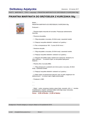 Delikatesy Azjatyckie Utworzono : 02 marzec 2017 PASTY, MARYNATY, TOFU > marynaty > PIKANTNA MARYNATA DO SRZYDEŁEK Z KURCZAKA 50g PIKANTNA MARYNATA DO SRZYDEŁEK Z KURCZAKA 50g Model : PIKANTNA MARYNATA DO SRZYDEŁEK Z KURCZAKA 50g Producent : Pikantna tajska marynata do kurczaka. Propozycje zastosowania marynaty. Pieczone skrzydełka. 1. 700g skrzydełek z kurczaka, 25-30ml wody i zawartość torebki. 2. Połączyć wszystkie składniki i odstawić na 2 godziny.� 3. Piec w temperaturze 190�C przez 20-25 minut.� Smażone skrzydła. 1. 700g skrzydełek z kurczaka, 25-30ml wody i zawartość torebki. 2. Połączyć wszystkie składniki i odstawić na 2 godziny.� 3. Obsypać skrzydełka mąką z tapioki lub w tempurze. Smażymy na oleju roślinnym � na średnim ogniu, aż skrzydełka będą jasno brązowe.� Pikantny filet z kurczaka BBQ. 1. 700g pokrojonych w plasterki (ok.0,5cm) piersi z kurczaka, 25-30ml wody, i zawartość torebki. 2. Połączyć wszystkie składniki i odstawić na 2 godziny.� 3. Nabić mięso na bambusowe patyczki i piec na grillu (węglowym lub elektrycznym) �na dużym ogniu ciągle przewracając. Prodecent: LOBO � � Skład:�cukier, przyprawy (cebula, pieprz biały, czosnek), chili, s�l, skrobia modyfikowana z tapioki, hydrolizat białka roślinnego (soja, kukurydza, maltodekstryna) ekstrakt drożdżowy.� Cena : 4,50 zł Brutto ( 4,50 zł Netto) Dostępność: Produkt dostępny w naszym sklepie od 24 październik 2015 kontakt : - [email protected] Strona 1