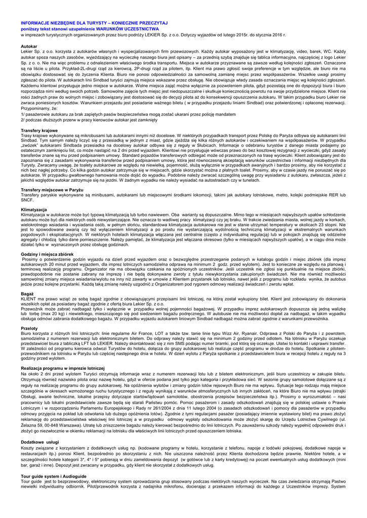 INFORMACJE NIEZBĘDNE DLA TURYSTY – KONIECZNIE PRZECZYTAJ poniższy tekst stanowi uzupełnienie WARUNKÓW UCZESTNICTWA w imprezach turystycznych organizowanych przez biuro podróży LEKIER Sp. z o.o. Dotyczy wyjazdów od lutego 2015r. do stycznia 2016 r. Autokar Lekier Sp. z o.o. korzysta z autokarów własnych i wyspecjalizowanych firm przewozowych. Każdy autokar wyposażony jest w klimatyzację, video, barek, WC. Każdy autokar spoza naszych zasobów, wyjeżdzający na wycieczkę naszego biura jest opisany – za przednią szybą znajduje się tablica informacyjna, najczęściej z logo Lekier Sp. z o. o. Nie ma więc problemu z odnalezieniem właściwego środka transportu. Miejsca w autokarze przyznawane są zawsze według kolejności zgłoszeń. Oznaczone są na liście u pilota. Przykład-2L-drugi rząd za kierowcą. 2P-drugi rząd za pilotem, itp. Klient ma prawo zgłosić swoje preferencje w tym względzie, ale biuro nie ma obowiązku dostosować się do życzenia Klienta. Biuro nie ponosi odpowiedzialności za samowolną zamianę miejsc przez współpasażerów. Wszelkie uwagi prosimy zgłaszać do pilota. W autokarach linii Sindbad turyści zajmują miejsca wskazane przez obsługę. Nie obowiązuje wtedy zasada oznaczania miejsc wg kolejności zgłoszeń. Każdemu klientowi przysługuje jedno miejsce w autokarze. Wolne miejsca zająć można wyłącznie za pozwoleniem pilota, gdyż pozostają one do dyspozycji biura i biuro rozporządza nimi według swoich potrzeb. Samowolne zajęcie tych miejsc jest niedopuszczalne i skutkuje koniecznością powrotu na swoje przydzielone miejsce. Klient nie rości żadnych praw do wolnych miejsc i zobowiązany jest dostosować się do decyzji pilota aż do konsekwencji opuszczenia autokaru. W takim przypadku biuro Lekier nie zwraca poniesionych kosztów. Warunkiem przejazdu jest posiadanie ważnego biletu ( w przypadku przejazdu liniami Sindbad) oraz potwierdzonej i opłaconej rezerwacji. Przypominamy, że: 1/ pasażerowie autokaru za brak zapiętych pasów bezpieczeństwa mogą zostać ukarani przez policję mandatem 2/ podczas dłuższych przerw w pracy kierowców autokar jest zamknięty Transfery krajowe Trasy krajowe wykonywane są mikrobusami lub autokarami innymi niż docelowe. W niektórych przypadkach transport przez Polskę do Paryża odbywa się autokarami linii Sindbad. Tym samym należy liczyć się z przesiadką w jednym z miast, gdzie zjeżdża się kilka różnych autokarów i oczekiwaniem na współpasażerów. W przypadku „zwózek” autokarami Sindbada przesiadka na docelowy autokar odbywa się z reguły w Słubicach. Informacje o odebraniu turystów z danego miasta podajemy po ostatecznym zamknięciu list, co może nastąpić na 2 dni przed wyjazdem. Klientowi nie przysługuje wówczas prawo do bez kosztowej rezygnacji z wycieczki, gdyż zasady transferów znane są mu przed podpisaniem umowy. Standard pojazdów transferowych odbiegać może od przeznaczonych na trasę wycieczki. Klient zobowiązany jest do zapoznania się z zasadami wykonywania transferów przed podpisaniem umowy, która jest równoczesną akceptacją warunków uczestnictwa i informacji niezbędnych dla Turysty. Zwracamy uwagę, że toalety autokarowe ze względu na niewielką, pojemność, służą wyłącznie w przypadkach awaryjnych i bardzo prosimy, aby nie korzystać z nich bez nagłej potrzeby. Co kilka godzin autokar zatrzymuje się w miejscach, gdzie skorzystać można z płatnych toalet. Prosimy, aby w czasie jazdy nie poruszać się po autokarze. W przypadku gwałtownego hamowania może dojść do wypadku. Podobnie należy zwracać szczególną uwagę przy wysiadaniu z autokaru, zwłaszcza, jeżeli z jakichś względów autokar zatrzymuje się na jezdni. W żadnym wypadku nie należy wysiadać na autostradach czy w tunelach. Transfery miejscowe w Paryżu Transfery paryskie wykonywane są minibusami, autokarami lub miejscowymi środkami lokomocji, takimi jak autokary lotniskowe, metro, kolejki podmiejskie RER lub SNCF. Klimatyzacja Klimatyzacja w autokarze może być typową klimatyzacją lub turbo nawiewem. Oba warianty są dopuszczalne. Mimo tego w miesiącach najwyższych upałów schłodzenie autokaru może być dla niektórych osób niewystarczające. Nie oznacza to wadliwej pracy klimatyzacji czy jej braku. W trakcie zwiedzania miasta, wolnej jazdy w korkach, wielokrotnego wsiadania i wysiadania osób, w pełnym słońcu, standardowa klimatyzacja autokarowa nie jest w stanie utrzymać temperatury w okolicach 23 stopni. Nie jest to spowodowane awarią czy też wyłączeniem klimatyzacji a po prostu nie wystarczającą wydolnością techniczną klimatyzacji w ekstremalnych warunkach pogodowych i eksploatacyjnych. W niektórych hotelach klimatyzacja włączana jest centralnie (często z indywidualną regulacją) lub w pokojach znajdują się oddzielne agregaty i chłodzą tylko dane pomieszczenie. Należy pamiętać, że klimatyzacja jest włączana okresowo (tylko w miesiącach najwyższych upałów), a w ciągu dnia może działać tylko w wyznaczonych przez obsługę godzinach. Godziny i miejsca zbiórek Prosimy o potwierdzenie godzin wyjazdu na dzień przed wyjazdem oraz o bezwzględne przestrzeganie podanych w katalogu godzin i miejsc zbiórek (dla imprez autokarowych 20 minut przed wyjazdem, dla imprez lotniczych samodzielna odprawa na minimum 2 godz. przed wylotem). Jest to konieczne ze względu na planową i terminową realizację programu. Organizator nie ma obowiązku czekania na spóźnionych uczestników. Jeśli uczestnik nie zgłosi się punktualnie na miejsce zbiórki, prawdopodobnie nie zostanie zabrany na imprezę i nie będą dokonywane zwroty z tytułu niewykorzystania zakupionych świadczeń. Nie ma również możliwości samowolnej zmiany miejsca wsiadania/wylotu na inny niż zawarty w umowie z Klientem przystanek lub lotnisko, nawet jeśli z programu lub rozkładu wynika, że autobus jedzie przez kolejne przystanki. Każ
