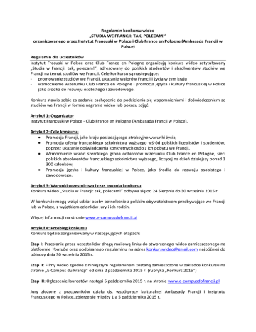 Regulamin konkursu wideo „STUDIA WE FRANCJI: TAK, POLECAM!” organizowanego przez Instytut Francuski w Polsce i Club France en Pologne (Ambasada Francji w Polsce) Regulamin dla uczestników Instytut Fracuski w Polsce oraz Club France en Pologne organizują konkurs wideo zatytułowany „Studia w Francji: tak, polecam!”, adresowany do polskich studentów i absolwentów studiów we Francji na temat studiów we Francji. Cele konkursu są następujące: - promowanie studiów we Francji, ukazanie walorów Francji i życia w tym kraju - wzmocnienie wizerunku Club France en Pologne i promocja języka i kultury francuskiej w Polsce jako środka do rozwoju osobistego i zawodowego. Konkurs stawia sobie za zadanie zachęcenie do podzielenia się wspomnieniami i doświadczeniem ze studiów we Francji w formie nagrania wideo lub pokazu zdjęć. Artykuł 1: Organizator Instytut Francuski w Polsce - Club France en Pologne (Ambasada Francji w Polsce). Artykuł 2: Cele konkursu Promocja Francji, jako kraju posiadającego atrakcyjne warunki życia, Promocja oferty francuskiego szkolnictwa wyższego wśród polskich licealistów i studentów, poprzez ukazanie doświadczenia konkretnych osób z ich pobytu we Francji, Wzmocnienie wśród szerokiego grona odbiorców wizerunku Club France en Pologne, sieci polskich absolwentów francuskiego szkolnictwa wyższego, liczącej na dzień dzisiejszy ponad 1 300 członków, Promocja języka i kultury francuskiej w Polsce, jako środka do rozwoju osobistego i zawodowego. Artykuł 3: Warunki uczestnictwa i czas trwania konkursu Konkurs wideo „Studia w Francji: tak, polecam!” odbywa się od 24 Sierpnia do 30 września 2015 r. W konkursie mogą wziąć udział osoby pełnoletnie z polskim obywatelstwem przebywające we Francji lub w Polsce, z wyjątkiem członków jury i ich rodzin. Więcej informacji na stronie www.e-campusdofrancji.pl Artykuł 4: Przebieg konkursu Konkurs będzie zorganizowany w następujących etapach: Etap I: Przesłanie przez uczestników drogą mailową linku do stworzonego wideo zamieszczonego na platformie Youtube oraz podpisanego regulaminu na adres [email protected] najpóźniej do północy dnia 30 września 2015 r. Etap II: Filmy wideo zgodne z niniejszym regulaminem zostaną zamieszczone w zakładce konkursu na stronie „E-Campus du Francji” od dnia 2 października 2015 r. (rubryka „Konkurs 2015”) Etap III: Ogłoszenie laureatów nastąpi 5 października 2015 r. na stronie www.e-campusdofrancji.pl Jury złożone z pracowników działu ds. współpracy kulturalnej Ambasady Francji i Instytutu Francuskiego w Polsce, zbierze się między 1 a 5 października 2015 r. Jury wskaże zdobywców dwóch pierwszych miejsc w kategoriach film zabawny oraz film kreatywny. Wyłonienie laureatów w kategorii « Nagroda Publiczności » odbędzie się na podstawie liczby oddanych głosów na filmy biorące udział w konkursie, zamieszczone na stronie www.ecampusdofrancji.pl w rubryce « Filmy konkursowe ». Głosowanie będzie możliwe do 22 czerwca 2015 do 10.00. Jury powiadomi zwycięzców konkursu drogą mailową. Artykuł 5: Format filmów, ograniczenia i zamieszczenie filmu w internecie Film będzie w języku polskim, jego czas trwania nie przekroczy jednej minuty i będzie mógł mieć postać pokazu zdjęć, jeśli uczestnik wybierze taką formę. Dopuszczalny sprzęt Uczestnik może użyć do nagrania telefonu komórkowego, kamery lub aparatu fotograficznego. Wybór sprzętu i programów do wykonania filmu zależy wyłącznie od uczestnika. Zamieszcenie filmu w internecie Każdy uczestnik musi zamieścić swoje wideo na platformie Youtube (www.youtube.com), a następnie wysłać link do wideo na adres [email protected] najpóźniej do północy 30 września 2015 r. Filmy przesłane po 30 września 2015 r. nie wezmą udziału w konkursie. Filmy wideo muszą spełniać warunki formatu i wielkości plików określone dla platformy Youtube (patrz zakładka „Niezbędnik” na stronie konkursu w serwisie „E-Campus do Francji”). Na zakończenie filmu lub pokazu zdjęć uczestnik musi zamieścić logotypy partnerów konkursu, które są do pobrania tutaj. Akceptacja regulaminu Potwierdzenie udziału kandydata w konkursie oznacza jego zgodę na warunki niniejszego regulaminu. Kandydat zobowiązuje się do odesłania do organizatora pocztą mialową podpisango przez siebie skanu regulaminu. Ograniczenia techniczne Przewiduje się wyświetlanie filmów na dużym ekranie. W związku z tym uczestnicy proszeni są o zapewnienie odpowiednich parametrów technicznych, by jakość projekcji była jak najlepsza. Prawa autorskie – prawa do obrazu Uczestnictwo w konkursie jest równoznaczne z cesją przez kandydata jego praw autorskich do filmu na rzecz organizatora i partnerów konkursu oraz uprawnienia do używania filmu w celach promocyjnych bez ograniczeń czasowych i bez prawa do jakiegokowiek wynagrodzenia. Są zakazane i będą automatycznie eliminowane z konkursu Treści, sprzeczne z niniejszym regulaminem, z obowiązującym prawem, zasadami życia społecznego, dobrymi obyczajami oraz takie, które naruszają prawa osób trzecich, w tym obraźliwe, wulgarne, zawierające groźby pod adresem osób trzecich, dyskryminujące płeć, rasę, narodowość, język, religię, nawołujące do przemocy, będące apologią zbrodni przeciwko ludzkości, zbrodni wojennych, nazizmu, ludobójstwa lub posiadające charakter pornograficzny, pedofilski lub z udziałem nieletnich, lub zawierające wirusy, lub zainfekowane w jakikolwiek sposób mogący zaszkodzić komputerom i sieci informatycznej związanej z działalnością Instytutu Francuskiego lub będące plagiatem, podróbką, kopią dzieł lub części dzieł osób trzecich. Treści (grafika, tekst, linki) naruszające powyższe zasady będą usuwane a organizator konkursu może ograniczyć użytkownikowi umieszczającemu takie treści dostęp do konkursu. Artykuł 6: Nagrody i kryteria oceny Ostate