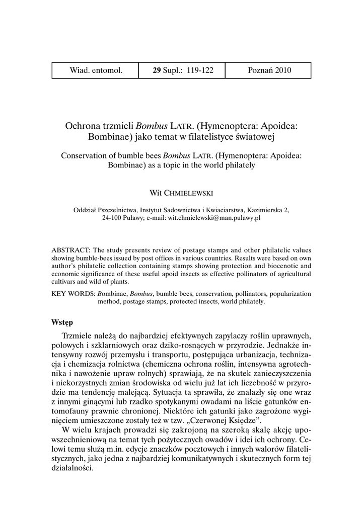 Wiad. entomol. 29 Supl.: 119-122 Poznań 2010 Ochrona trzmieli Bombus LATR. (Hymenoptera: Apoidea: Bombinae) jako temat w filatelistyce światowej Conservation of bumble bees Bombus LATR. (Hymenoptera: Apoidea: Bombinae) as a topic in the world philately Wit CHMIELEWSKI Oddział Pszczelnictwa, Instytut Sadownictwa i Kwiaciarstwa, Kazimierska 2, 24-100 Puławy; e-mail: [email protected] ABSTRACT: The study presents review of postage stamps and other philatelic values showing bumble-bees issued by post offices in various countries. Results were based on own author’s philatelic collection containing stamps showing protection and biocenotic and economic significance of these useful apoid insects as effective pollinators of agricultural cultivars and wild of plants. KEY WORDS: Bombinae, Bombus, bumble bees, conservation, pollinators, popularization method, postage stamps, protected insects, world philately. Wstęp Trzmiele należą do najbardziej efektywnych zapylaczy roślin uprawnych, polowych i szklarniowych oraz dziko-rosnących w przyrodzie. Jednakże intensywny rozwój przemysłu i transportu, postępująca urbanizacja, technizacja i chemizacja rolnictwa (chemiczna ochrona roślin, intensywna agrotechnika i nawożenie upraw rolnych) sprawiają, że na skutek zanieczyszczenia i niekorzystnych zmian środowiska od wielu już lat ich liczebność w przyrodzie ma tendencję malejącą. Sytuacja ta sprawiła, że znalazły się one wraz z innymi ginącymi lub rzadko spotykanymi owadami na liście gatunków entomofauny prawnie chronionej. Niektóre ich gatunki jako zagrożone wyginięciem umieszczone zostały też w tzw. „Czerwonej Księdze”. W wielu krajach prowadzi się zakrojoną na szeroką skalę akcję upowszechnieniową na temat tych pożytecznych owadów i idei ich ochrony. Celowi temu służą m.in. edycje znaczków pocztowych i innych walorów filatelistycznych, jako jedna z najbardziej komunikatywnych i skutecznych form tej działalności. 120 W. CHMIELEWSKI Przegląd dotychczasowych edycji znaczków pocztowych prezentujących trzmiele, ich znaczenie i ochronę w różnych krajach, jako jednej z atrakcyjnych i efektywnych metod popularyzacji wiedzy z tego zakresu i edukacji ekologicznej społeczeństwa na ten temat, jest celem obecnego opracowania. Materiał i metodyka Materiał do pracy stanowiła własna kolekcja tematyczna walorów filatelistycznych, gromadzona przez autora od wielu lat. Złożyło się na nią m.in. kilkadziesiąt znaczków pocztowych pokazujących określone do gatunku i bliżej niezidentyfikowane błonkówki pszczołowate z rodzaju Bombus. Do identyfikacji poszczególnych pozycji posłużyły krajowe i zagraniczne katalogi filatelistyczne oraz opisy i wykazy znaczków w publikacjach przeglądowych dotyczących tematu owadów w filatelistyce (CHMIELEWSKI 1977; DEWOS 1968; FISK i in. 1962; PRUESS 1973; SHAW, STUART CHING 1994; WRIGHT 1967). Wyniki Zebrano łącznie ponad 80 znaczków pocztowych, które ukazały się w ponad 30 krajach. Lista gatunków trzmieli (Bombus LATR.) prezentowanych na wydanych dotychczas znaczkach przez pocztę w różnych krajach przedstawia się następująco (kraj, rok edycji serii): Bombus americanorum FABR. (Vietnam 1986); Bombus anachoreta SKORIKOV (Rosja 2005); Bombus armeniacus RADOSZKOWSKI (Rosja 2005); Bombus bimaculatus CRESSON (Bułgaria 2002); Bombus czerskii SKORIKOV (Rosja 2005); Bombus fragrans (PALLAS) (Rosja 2005); Bombus hortorum (L.) (Węgry 1980); Bombus jonellus (KIRBY) (Rosja 2000); Bombus lucorum (L.) (Białoruś 2004, Czechosłowacja 1961, Finlandia 1954, Islandia 2004, Polska 1961, W. Man 2001); Bombus modestus EVERSMANN (Rosja 2000); Bombus morrisoni CRESSON (USA 2007); Bombus muscorum (L.) (Rosja 2000); Bombus pascuorum (SCOP.) [= B. agrorum (F.)] (Angola 2000, Rosja 2000); Bombus pomorum (PANZ.) (Litwa 1999); Bombus proteus GERSTAECKER (Rosja 2000); Bombus (Megabombus) ruderatus (FABR.) (Gwinea Równikowa 1974, Portugalia – Azory 1984, Rosja 2000); Bombus soroeensis (FABR.) (Rosja 2000); OCHRONA TRZMIELI JAKO TEMAT W FILATELISTYCE ŚWIATOWEJ 121 Bombus sporadicus NYLANDER (Rosja 2000); Bombus subterraneus (L.) (Angola 2000, Rosja 2000); Bombus terrestris (L.) (Azerbajdżan 2006, Belgia 1996, Czechy 1995, Dominikana 2002, Jersey 2008, Jugosławia 1978, Mongolia 1979, Niemcy – Berlin Zachodni 1984, Niger 1977, Norwegia 1997, Sharjah 1972, Szwajcaria 1954, Wielka Brytania 1985); Bombus unicus MORAVITZ (Rosja 2005); Bombus sp. (Antiqua i Barbuda 2005, Brazylia 1979, Finlandia 1993, Gwinea-Bissau 2001, Kolumbia 1967, Korea Płn. 2000, Monako 1988, 1989, Mozambik 1989, Nikaragua 1979, Niemcy – Berlin Zachodni 1985, NRD 1980, 1982; Paragwaj 1974, Rosja 1994, Rosja – Rep. Chuvashia, Rep. Komi 2000, St. Vincent 1976, Szkocja – W. Staffa 1982, Umm-Al-Qiwain 1973). Dyskusja i wnioski Od ukazania się pierwszych znaczków pocztowych związanych tematycznie z trzmielami (Bombus LATR.) minęło już ponad 50 lat. Były to znaczki Szwajcarii i Finlandii (1954), a w kilka lat później znaczki o podobnej tematyce wydano w Polsce i byłej Czechosłowacji (1961). Polski znaczek z trzmielem, B. lucorum (w serii: owady chronione) jest jak dotychczas jedyną pozycją z tym motywem, wydaną w naszym kraju. Później ukazały się edycje w wielu innych krajach na całym świecie. Wydawano je przy różnych okazjach, jak np. „Pro Juventute” (Szwajcaria 1954), „I Exposicion Nacional de Orquideas” (Kolumbia 1967), „Maurice Maeterlinck Prix Nobel De Litterature 1911” (Niger 1977), „Für die Jugend” (Niemcy 1984), „Krasnaja Kniga” (Rosja 1994), „Evropsky Rok Ochrany Přírody” (Czechy 1995), „Šmeli zanesennye v Krasnuju knigu Rossijskoj Federacii” (Rosja 2005), „Insect des Jahres 2005 Bombus lapidarius” (Niemcy 2005), „National Pollinator Week” (USA 2007) i in. Z przedstawionego wykazu wynika, że obok stosunkowo dużej liczby starszych znaczków pokazujących pospolite i od dawna po