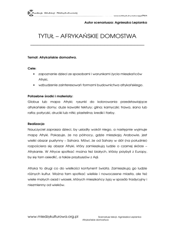 Autor scenariusza: Agnieszka Lepianka TYTUŁ – AFRYKAŃSKIE DOMOSTWA __________________________________ Temat: Afrykańskie domostwa. Cele: • zapoznanie dzieci ze sposobami i warunkami Ŝycia mieszkańców Afryki, • wzbudzenie zainteresowań formami budownictwa afrykańskiego. Potrzebne środki i materiały: Globus lub mapa Afryki; rysunki do kolorowania przedstawiające afrykańskie domy; duŜe kawałki tektury; glina; kamyczki; trawa, siano lub rafia; patyczki, druciki lub nitki; plastelina; kredki i farby. Realizacja Nauczyciel zaprasza dzieci, by usiadły wokół niego, a następnie wyjmuje mapę Afryki. Pokazuje, Ŝe na północy, gdzie mieszkają Arabowie, jest wielki obszar pustynny – Sahara. Mówi, Ŝe od Sahary w dół (na południe) rozpościera się obszar Afryki, który zamieszkują ludzie o czarnej skórze – Afrykanie. W Afryce spotkać moŜna teŜ białych, którzy przybyli z Europy, by się tam osiedlić, a takŜe przybyszów z Azji. Afryka to drugi co do wielkości kontynent świata. Zamieszkują go ludzie róŜnych kultur. MoŜna tam spotkać wielkie i nowoczesne miasta, ale teŜ wiele małych osad i wiosek, których mieszkańcy Ŝyją w sposób tradycyjny i niezmienny od wieków. www.miedzykulturowa.org.pl Scenariusz lekcji: Agnieszka Lepianka Afrykańskie domostwa Nauczyciel pyta, dzieci odpowiadają, a on podsumowuje wypowiedzi: a) Czym mogą się zajmować ludzie w Afryce? W miastach i miasteczkach kwitnie handel i przemysł. Natomiast ludzie mieszkający na terenach wiejskich zajmują się hodowlą bydła, owiec i kóz, uprawiają pola, polują na zwierzęta, zbierają owoce. Zajmują się takŜe rzemiosłem: wyrabiają piękne naczynia gliniane, maski, kolorowe tkaniny o niepowtarzalnych wzorach, a takŜe najrozmaitsze przedmioty z tykwy. Często przedmioty te wykonują, aby sprzedać je później turystom. Poza tym bardzo lubią grać na instrumentach muzycznych, tańczyć i śpiewać. b) Czy jest tam zimno, czy gorąco? W Afryce jest o wiele cieplej niŜ w naszym kraju. Nie ma tam zimy. Jednak w niektórych regionach Afryki zdarza się, Ŝe w dzień jest bardzo gorąco, natomiast w nocy temperatura spada czasem nawet do zera stopni. Tak jest np. na Saharze. c) Czy jest tam mało, czy duŜo wody? W wielu rejonach Afryki bardzo często panuje susza, a duŜy jej obszar zajmują pustynie. Jedynie w lasach równikowych obfite deszcze zapewniają wodę przez cały rok. W Afryce są tylko 2 pory roku – sucha i deszczowa. W porze deszczowej, dzięki intensywnym opadom, oŜywają wyschnięte rzeki, a wraz z nimi odradza się pobliska roślinność. Wtedy zwierzęta mają moŜliwość korzystania z wielu wodopojów. Jednak po tym okresie przychodzi pora sucha, która zmusza ludzi i zwierzęta do częstych wędrówek w poszukiwaniu wody. W Afryce zdarzają się obszary, w których nawet przez kilka lat nie spada ani jedna kropla deszczu. d) W jakich domach mogą mieszkać ludzie w Afryce? Afrykanie mieszkają w róŜnych rodzajach domów. Typ siedziby zaleŜy od: warunków geograficznych, sposobu Ŝycia, dostępnych surowców i tradycji. W tamtejszych warunkach najpopularniejszym surowcem, wykorzystywanym do budowy, jest drewno lub po prostu gałęzie do www.miedzykulturowa.org.pl Scenariusz lekcji: Agnieszka Lepianka Afrykańskie domostwa robienia rusztowań i szkieletów budowli. Muł i glina słuŜą do wyrobu cegieł na ściany i podłogę oraz do wypełniania przestrzeni w rusztowaniu, a takŜe do tynkowania. Trawy i liście są wykorzystywane do krycia dachów i utykania dziur w ścianach. W niektórych typach domów drewniane szkielety pokrywane są po prostu matami i skórami zwierząt. W Afryce dom jest potrzebny do spania, ochrony przed upałem, deszczem i dzikimi zwierzętami. Jednak większość czasu spędza się poza nim. Z tego powodu tamtejsze domy w większości przypadków są małe. Spotkania towarzyskie odbywają się przede wszystkim na zewnątrz, najczęściej wieczorami i w nocy przy ogniskach. W naszym kraju buduje się domy dla ochrony przed zimnem, śniegiem, deszczem i wiatrem. Ze względu na niesprzyjającą pogodę przez większą część roku wygodniej jest nam spotkać się z przyjaciółmi i rodziną pod dachem, w ciepłym zaciszu, dlatego potrzebujemy większych domów. Współcześnie, coraz więcej Afrykanów mieszka w miastach, gdzie Ŝycie wygląda podobnie jak w Europie. Nad afrykańskimi stolicami górują olbrzymie biurowce. Krajobraz urozmaicają budynki banków, hoteli, a takŜe centra handlowe. Ludzie zamoŜni mieszkają w domach jednorodzinnych lub blokach mieszkalnych. Ci biedniejsi w domkach zrobionych z cegieł i przykrytych kawałkiem blachy. Skupiska najbiedniejszych mieszkańców miast określane są mianem – slumsów (jedno z największych w Afryce to Kibera w Nairobi – stolicy Kenii). Po powyŜszym wprowadzeniu nauczyciel wyjmuje rysunki do kolorowania przedstawiające róŜne typy domów afrykańskich. Rozkłada je przed dziećmi. Następnie tłumaczy, Ŝe za chwilę przeczyta krótkie opisy Ŝycia właścicieli domów. Zadaniem dzieci jest odgadnięcie, który dom najbardziej pasuje do opisu trybu Ŝycia właściciela. 1. Koczownicy to ludzie, którzy często zmieniają miejsce pobytu, zatem nie mogą mieć jednego, stałego domu. Koczownicy mogą naleŜeć do ludów zbieracko-łowieckich, bowiem zbieractwo i łowiectwo jest tradycyjną www.miedzykulturowa.org.pl Scenariusz lekcji: Agnieszka Lepianka Afrykańskie domostwa podstawą ich gospodarki. Kobiety zbierają owoce, ale takŜe grzyby, ślimaki, wykopują jadalne bulwy i korzenie itp., a męŜczyźni polują. Do tej grupy naleŜą m.in. Buszmeni zwani teŜ San, zamieszkujący pustynię Kalahari i Namib w Afryce Południowej. Nie mają Ŝadnych środków transportu, więc nie mogą wziąć ze sobą wiele dobytku. Ich domy to tymczasowe szałasy, czyli schronienia z patyków i gałęzi pokryte trawą lub liśćmi. Do celów mieszkalnych mogą im równ