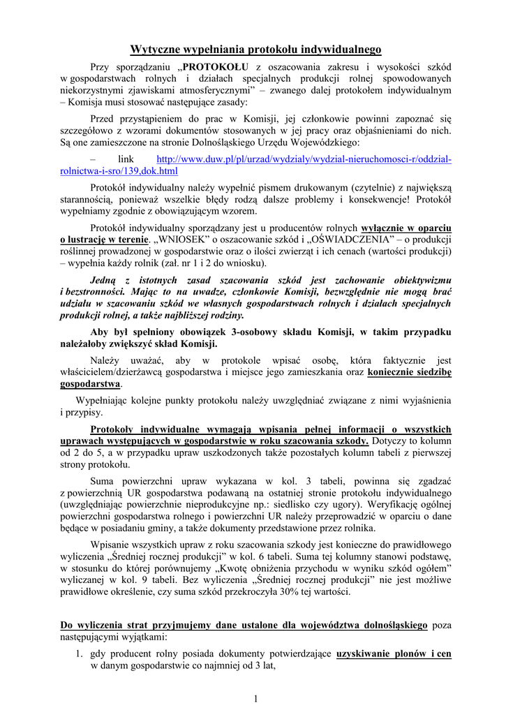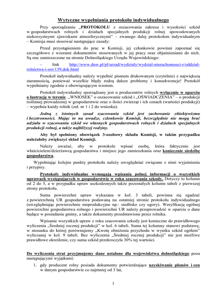 Wytyczne wypełniania protokołu indywidualnego Przy sporządzaniu „PROTOKOŁU z oszacowania zakresu i wysokości szkód w gospodarstwach rolnych i działach specjalnych produkcji rolnej spowodowanych niekorzystnymi zjawiskami atmosferycznymi” – zwanego dalej protokołem indywidualnym – Komisja musi stosować następujące zasady: Przed przystąpieniem do prac w Komisji, jej członkowie powinni zapoznać się szczegółowo z wzorami dokumentów stosowanych w jej pracy oraz objaśnieniami do nich. Są one zamieszczone na stronie Dolnośląskiego Urzędu Wojewódzkiego: – link http://www.duw.pl/pl/urzad/wydzialy/wydzial-nieruchomosci-r/oddzialrolnictwa-i-sro/139,dok.html Protokół indywidualny należy wypełnić pismem drukowanym (czytelnie) z największą starannością, ponieważ wszelkie błędy rodzą dalsze problemy i konsekwencje! Protokół wypełniamy zgodnie z obowiązującym wzorem. Protokół indywidualny sporządzany jest u producentów rolnych wyłącznie w oparciu o lustrację w terenie. „WNIOSEK” o oszacowanie szkód i „OŚWIADCZENIA” – o produkcji roślinnej prowadzonej w gospodarstwie oraz o ilości zwierząt i ich cenach (wartości produkcji) – wypełnia każdy rolnik (zał. nr 1 i 2 do wniosku). Jedną z istotnych zasad szacowania szkód jest zachowanie obiektywizmu i bezstronności. Mając to na uwadze, członkowie Komisji, bezwzględnie nie mogą brać udziału w szacowaniu szkód we własnych gospodarstwach rolnych i działach specjalnych produkcji rolnej, a także najbliższej rodziny. Aby był spełniony obowiązek 3-osobowy składu Komisji, w takim przypadku należałoby zwiększyć skład Komisji. Należy uważać, aby w protokole wpisać osobę, która faktycznie jest właścicielem/dzierżawcą gospodarstwa i miejsce jego zamieszkania oraz koniecznie siedzibę gospodarstwa. Wypełniając kolejne punkty protokołu należy uwzględniać związane z nimi wyjaśnienia i przypisy. Protokoły indywidualne wymagają wpisania pełnej informacji o wszystkich uprawach występujących w gospodarstwie w roku szacowania szkody. Dotyczy to kolumn od 2 do 5, a w przypadku upraw uszkodzonych także pozostałych kolumn tabeli z pierwszej strony protokołu. Suma powierzchni upraw wykazana w kol. 3 tabeli, powinna się zgadzać z powierzchnią UR gospodarstwa podawaną na ostatniej stronie protokołu indywidualnego (uwzględniając powierzchnie nieprodukcyjne np.: siedlisko czy ugory). Weryfikację ogólnej powierzchni gospodarstwa rolnego i powierzchni UR należy przeprowadzić w oparciu o dane będące w posiadaniu gminy, a także dokumenty przedstawione przez rolnika. Wpisanie wszystkich upraw z roku szacowania szkody jest konieczne do prawidłowego wyliczenia „Średniej rocznej produkcji” w kol. 6 tabeli. Suma tej kolumny stanowi podstawę, w stosunku do której porównujemy „Kwotę obniżenia przychodu w wyniku szkód ogółem” wyliczanej w kol. 9 tabeli. Bez wyliczenia „Średniej rocznej produkcji” nie jest możliwe prawidłowe określenie, czy suma szkód przekroczyła 30% tej wartości. Do wyliczenia strat przyjmujemy dane ustalone dla województwa dolnośląskiego poza następującymi wyjątkami: 1. gdy producent rolny posiada dokumenty potwierdzające uzyskiwanie plonów i cen w danym gospodarstwie co najmniej od 3 lat, 1 2. gdy producent rolny zobowiązany jest z mocy prawa do sporządzania sprawozdań o powierzchni zasiewów i zbiorach (R-05 i R-06) wówczas wpisuje własne dane na podstawie dokumentacji źródłowej z 3 lat. Uwaga: – faktury sprzedaży VAT nie potwierdzają uzyskiwanych plonów ! W każdym innym przypadku posługujemy się danymi statystycznymi. Jeśli rolnik nie przedstawi dokumentów potwierdzających średnie plony i ceny nie powinien wypełniać kolumn 4 i 5 w tabeli „Załącznika nr 1”. W kolumnie 6 (cena uzyskana/prognozowana) – rolnik wypełnia dane dotyczące tylko upraw uszkodzonych. Średnią cenę uzyskaną rolnik wpisuje, jeżeli była udokumentowana sprzedaż przed datą szacowania. Cenę prognozowaną wpisuje się z umów kontraktacyjnych, w pozostałych przypadkach stosowana będzie średnia cena prognozowana ustalona dla województwa dolnośląskiego. Producenci rolni prowadzący księgi rachunkowe przedstawiają średnie plony, ceny oraz wartość produkcji swojego gospodarstwa wyliczone na podstawie ww. dokumentów – dotyczących ostatnich trzech lub 3 z pięciu pełnych lat z pominięciem najwyższej i najniższej wartości. Komisja w celu weryfikacji danych ma prawo zażądać do wglądu materiały źródłowe. Dla gospodarstw posiadających dokumentację źródłową z co najmniej 3 ostatnich lat poświadczającą plony, ceny, wartość produkcji roślinnej i zwierzęcej, do wyliczeń średnich z gospodarstwa można posłużyć się tabelą pomocniczą, którą przekaże pracownik DUW/właściwa Komisja Rejonowa. W takim przypadku wypełniona tabela pomocnicza (podpisana przez Prezesa/Dyrektora np. spółki)– po zweryfikowaniu przez Komisję – musi być dołączona do protokołu indywidualnego. Nie można stosować średnich statystycznych i własnych wyliczeń w jednym protokole, z wyjątkiem danych dotyczących upraw i zwierząt nietypowych, rzadko spotykanych, dla których nie są opracowywane dane statystyczne i nie ma ich w opracowaniach DODR lub IERiGŻ. Jeśli w gospodarstwie występuje produkcja zwierzęca, wypełniamy tabelę na stronie drugiej protokołu w zakresie ustalenia wielkości średniej rocznej produkcji towarowej zwierząt (kolumny 2 do 6). W przypadku wystąpienia szkód w zwierzętach, wpisujemy także dane w kolumnach od 7 do 11 tabeli. W tej tabeli wpisujemy dane z „Załącznika nr 2” o ilości zwierząt i ich cenach (wartości produkcji). Zwierzęta lub produkty zwierzęce umieszczamy w oświadczeniach i protokołach pogrupowane wg kategorii np.: żywiec wołowy, cielęta, żywiec wieprzowy, żywiec barani, żywiec koński, żywiec drobiowy, mleko (iloś