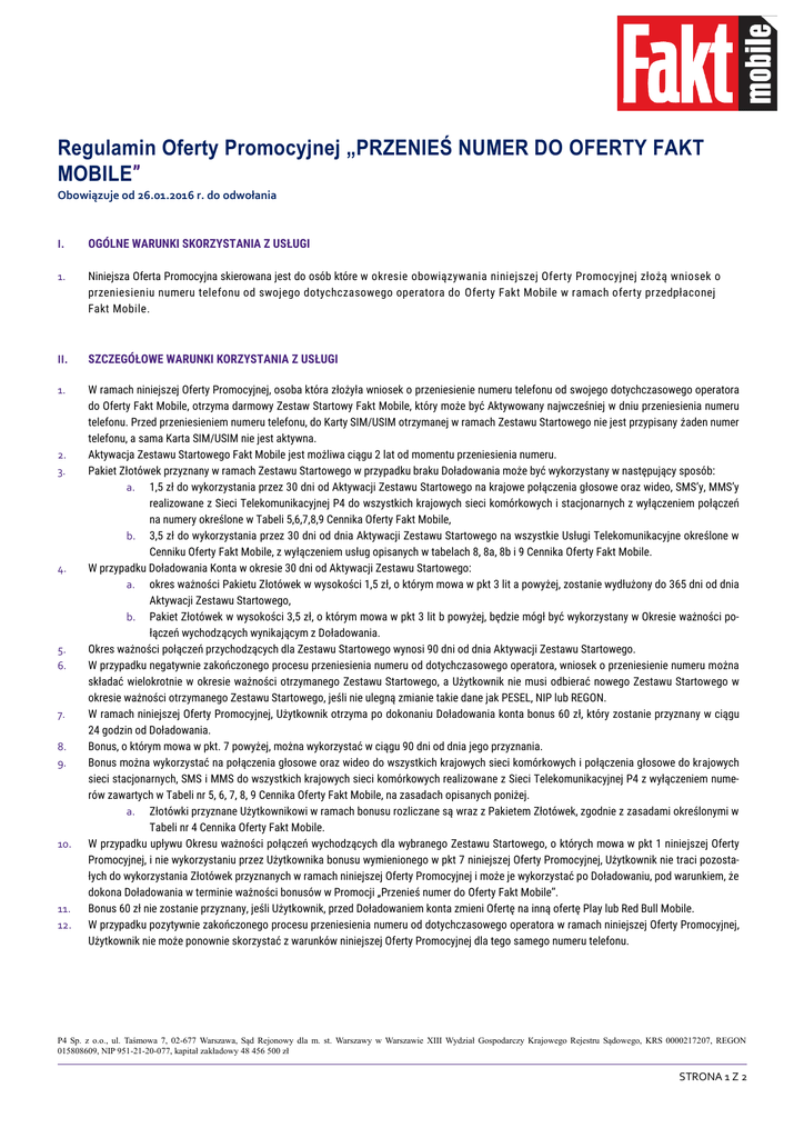 Regulamin Oferty Promocyjnej „PRZENIEŚ NUMER DO OFERTY FAKT MOBILE” Obowiązuje od 26.01.2016 r. do odwołania I. OGÓLNE WARUNKI SKORZYSTANIA Z USŁUGI 1. Niniejsza Oferta Promocyjna skierowana jest do osób które w okresie obowiązywania niniejszej Oferty Promocyjnej złożą wniosek o przeniesieniu numeru telefonu od swojego dotychczasowego operatora do Oferty Fakt Mobile w ramach oferty przedpłaconej Fakt Mobile. II. SZCZEGÓŁOWE WARUNKI KORZYSTANIA Z USŁUGI 1. W ramach niniejszej Oferty Promocyjnej, osoba która złożyła wniosek o przeniesienie numeru telefonu od swojego dotychczasowego operatora do Oferty Fakt Mobile, otrzyma darmowy Zestaw Startowy Fakt Mobile, który może być Aktywowany najwcześniej w dniu przeniesienia numeru telefonu. Przed przeniesieniem numeru telefonu, do Karty SIM/USIM otrzymanej w ramach Zestawu Startowego nie jest przypisany żaden numer telefonu, a sama Karta SIM/USIM nie jest aktywna. Aktywacja Zestawu Startowego Fakt Mobile jest możliwa ciągu 2 lat od momentu przeniesienia numeru. Pakiet Złotówek przyznany w ramach Zestawu Startowego w przypadku braku Doładowania może być wykorzystany w następujący sposób: a. 1,5 zł do wykorzystania przez 30 dni od Aktywacji Zestawu Startowego na krajowe połączenia głosowe oraz wideo, SMS’y, MMS’y realizowane z Sieci Telekomunikacyjnej P4 do wszystkich krajowych sieci komórkowych i stacjonarnych z wyłączeniem połączeń na numery określone w Tabeli 5,6,7,8,9 Cennika Oferty Fakt Mobile, b. 3,5 zł do wykorzystania przez 30 dni od dnia Aktywacji Zestawu Startowego na wszystkie Usługi Telekomunikacyjne określone w Cenniku Oferty Fakt Mobile, z wyłączeniem usług opisanych w tabelach 8, 8a, 8b i 9 Cennika Oferty Fakt Mobile. W przypadku Doładowania Konta w okresie 30 dni od Aktywacji Zestawu Startowego: a. okres ważności Pakietu Złotówek w wysokości 1,5 zł, o którym mowa w pkt 3 lit a powyżej, zostanie wydłużony do 365 dni od dnia Aktywacji Zestawu Startowego, b. Pakiet Złotówek w wysokości 3,5 zł, o którym mowa w pkt 3 lit b powyżej, będzie mógł być wykorzystany w Okresie ważności połączeń wychodzących wynikającym z Doładowania. Okres ważności połączeń przychodzących dla Zestawu Startowego wynosi 90 dni od dnia Aktywacji Zestawu Startowego. W przypadku negatywnie zakończonego procesu przeniesienia numeru od dotychczasowego operatora, wniosek o przeniesienie numeru można składać wielokrotnie w okresie ważności otrzymanego Zestawu Startowego, a Użytkownik nie musi odbierać nowego Zestawu Startowego w okresie ważności otrzymanego Zestawu Startowego, jeśli nie ulegną zmianie takie dane jak PESEL, NIP lub REGON. W ramach niniejszej Oferty Promocyjnej, Użytkownik otrzyma po dokonaniu Doładowania konta bonus 60 zł, który zostanie przyznany w ciągu 24 godzin od Doładowania. Bonus, o którym mowa w pkt. 7 powyżej, można wykorzystać w ciągu 90 dni od dnia jego przyznania. Bonus można wykorzystać na połączenia głosowe oraz wideo do wszystkich krajowych sieci komórkowych i połączenia głosowe do krajowych sieci stacjonarnych, SMS i MMS do wszystkich krajowych sieci komórkowych realizowane z Sieci Telekomunikacyjnej P4 z wyłączeniem numerów zawartych w Tabeli nr 5, 6, 7, 8, 9 Cennika Oferty Fakt Mobile, na zasadach opisanych poniżej. a. Złotówki przyznane Użytkownikowi w ramach bonusu rozliczane są wraz z Pakietem Złotówek, zgodnie z zasadami określonymi w Tabeli nr 4 Cennika Oferty Fakt Mobile. W przypadku upływu Okresu ważności połączeń wychodzących dla wybranego Zestawu Startowego, o których mowa w pkt 1 niniejszej Oferty Promocyjnej, i nie wykorzystaniu przez Użytkownika bonusu wymienionego w pkt 7 niniejszej Oferty Promocyjnej, Użytkownik nie traci pozostałych do wykorzystania Złotówek przyznanych w ramach niniejszej Oferty Promocyjnej i może je wykorzystać po Doładowaniu, pod warunkiem, że dokona Doładowania w terminie ważności bonusów w Promocji „Przenieś numer do Oferty Fakt Mobile”. Bonus 60 zł nie zostanie przyznany, jeśli Użytkownik, przed Doładowaniem konta zmieni Ofertę na inną ofertę Play lub Red Bull Mobile. W przypadku pozytywnie zakończonego procesu przeniesienia numeru od dotychczasowego operatora w ramach niniejszej Oferty Promocyjnej, Użytkownik nie może ponownie skorzystać z warunków niniejszej Oferty Promocyjnej dla tego samego numeru telefonu. 2. 3. 4. 5. 6. 7. 8. 9. 10. 11. 12. P4 Sp. z o.o., ul. Taśmowa 7, 02-677 Warszawa, Sąd Rejonowy dla m. st. Warszawy w Warszawie XIII Wydział Gospodarczy Krajowego Rejestru Sądowego, KRS 0000217207, REGON 015808609, NIP 951-21-20-077, kapitał zakładowy 48 456 500 zł STRONA 1 Z 2 POSTANOWIENIA KOŃCOWE 13. Niniejsza Oferta Promocyjna nie wyklucza się z pozostałymi Ofertami Promocyjnymi w Ofercie Fakt Mobile, chyba, że inne Oferty Promocyjne stanowią inaczej. W ramach niniejszej usługi Użytkownik zobowiązuje się: a) nie kierować bez zgody Operatora do Sieci Telekomunikacyjnej lub sieci innych przedsiębiorców telekomunikacyjnych, za po-mocą jakichkolwiek urządzeń telekomunikacyjnych, przy użyciu Karty SIM/USIM otrzymanej przez Użytkownika ruchu pochodzącego z innych sieci telekomunikacyjnych; b) nie stosować bez zgody Operatora urządzeń umożliwiających dostęp do Sieci Telekomunikacyjnej lub realizowanie połączeń za pomocą urządzeń końcowych przeznaczonych do przyłączenia do sieci stacjonarnej lub działających na podobnej zasadzie, w których wykorzystywane będą karty SIM/USIM działające w Sieci Telekomunikacyjnej; c) nie generować sztucznego ruchu nie służącego wymianie informacji; d) nie używać Karty SIM/USIM w rozwiązaniach telemetrycznych e) nie używać Karty SIM/USIM do ruchu generowanego maszynowo, w szczególności ruchu typu „maszyna do maszyny” lub „maszyna do użytkownika” f) nie używać Karty SIM/USIM do generowania ruchu, który ma charakter ataku Deni