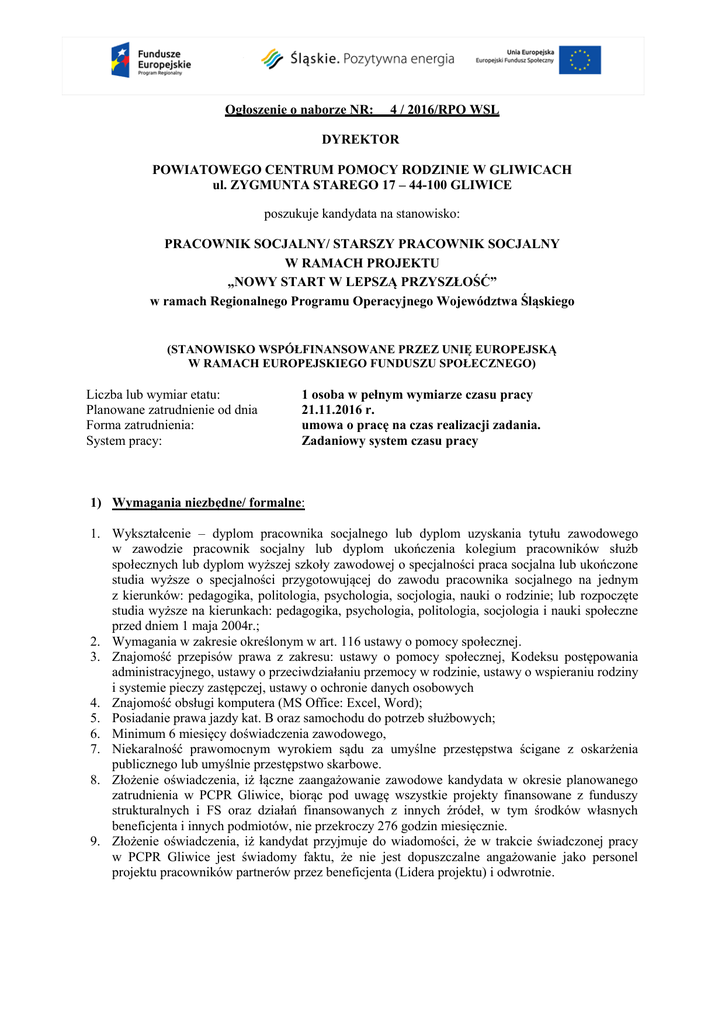 Ogłoszenie o naborze NR: 4 / 2016/RPO WSL DYREKTOR POWIATOWEGO CENTRUM POMOCY RODZINIE W GLIWICACH ul. ZYGMUNTA STAREGO 17 – 44-100 GLIWICE poszukuje kandydata na stanowisko: PRACOWNIK SOCJALNY/ STARSZY PRACOWNIK SOCJALNY W RAMACH PROJEKTU „NOWY START W LEPSZĄ PRZYSZŁOŚĆ” w ramach Regionalnego Programu Operacyjnego Województwa Śląskiego (STANOWISKO WSPÓŁFINANSOWANE PRZEZ UNIĘ EUROPEJSKĄ W RAMACH EUROPEJSKIEGO FUNDUSZU SPOŁECZNEGO) Liczba lub wymiar etatu: Planowane zatrudnienie od dnia Forma zatrudnienia: System pracy: 1 osoba w pełnym wymiarze czasu pracy 21.11.2016 r. umowa o pracę na czas realizacji zadania. Zadaniowy system czasu pracy 1) Wymagania niezbędne/ formalne: 1. Wykształcenie – dyplom pracownika socjalnego lub dyplom uzyskania tytułu zawodowego w zawodzie pracownik socjalny lub dyplom ukończenia kolegium pracowników służb społecznych lub dyplom wyższej szkoły zawodowej o specjalności praca socjalna lub ukończone studia wyższe o specjalności przygotowującej do zawodu pracownika socjalnego na jednym z kierunków: pedagogika, politologia, psychologia, socjologia, nauki o rodzinie; lub rozpoczęte studia wyższe na kierunkach: pedagogika, psychologia, politologia, socjologia i nauki społeczne przed dniem 1 maja 2004r.; 2. Wymagania w zakresie określonym w art. 116 ustawy o pomocy społecznej. 3. Znajomość przepisów prawa z zakresu: ustawy o pomocy społecznej, Kodeksu postępowania administracyjnego, ustawy o przeciwdziałaniu przemocy w rodzinie, ustawy o wspieraniu rodziny i systemie pieczy zastępczej, ustawy o ochronie danych osobowych 4. Znajomość obsługi komputera (MS Office: Excel, Word); 5. Posiadanie prawa jazdy kat. B oraz samochodu do potrzeb służbowych; 6. Minimum 6 miesięcy doświadczenia zawodowego, 7. Niekaralność prawomocnym wyrokiem sądu za umyślne przestępstwa ścigane z oskarżenia publicznego lub umyślnie przestępstwo skarbowe. 8. Złożenie oświadczenia, iż łączne zaangażowanie zawodowe kandydata w okresie planowanego zatrudnienia w PCPR Gliwice, biorąc pod uwagę wszystkie projekty finansowane z funduszy strukturalnych i FS oraz działań finansowanych z innych źródeł, w tym środków własnych beneficjenta i innych podmiotów, nie przekroczy 276 godzin miesięcznie. 9. Złożenie oświadczenia, iż kandydat przyjmuje do wiadomości, że w trakcie świadczonej pracy w PCPR Gliwice jest świadomy faktu, że nie jest dopuszczalne angażowanie jako personel projektu pracowników partnerów przez beneficjenta (Lidera projektu) i odwrotnie. 2) Wymagania dodatkowe: 1. Doświadczenie zawodowe w pracy w terenie z klientami instytucji pomocy społecznej lub sektora organizacji pozarządowych, 2. Doświadczenie w zakresie realizacji projektów współfinansowanych przez Unię Europejską, 3. Umiejętność pracy w zespole oraz dobrej organizacji pracy, 4. Umiejętność pracy pod presją czasu w tym radzenie sobie w sytuacjach stresujących i kryzysowych, 5. Umiejętność nawiązywania kontaktu i prowadzenia aktywnej i efektywnej współpracy z klientami zagrożonymi wykluczeniem społecznym, 6. Stan zdrowia pozwalający na zatrudnienie na stanowisku pracownika socjalnego uczestnika w projekcie. 3) Cechy pożądane kandydata: 1. 2. 3. 4. 5. umiejętność dobrej organizacji pracy, umiejętność pracy pod presją czasu, komunikatywność i obowiązkowość, Doświadczenie zawodzie jako pracownik socjalny, Kursy lub Podyplomowe studia specjalizacyjne. 4) Szczegółowy zakres obowiązków 1. Sporządzanie i realizacja umów z uczestnikiem projektu wraz z załącznikami w tym: Indywidualnych Programów Usamodzielniania/Programów Integracji Społecznej i Zawodowej Osób Niepełnosprawnych, wywiadów środowiskowych, kontraktów Socjalnych z uczestnikami zgodnie z wytycznymi RPO WSL. 2. Wypracowanie wraz z uczestnikiem wskaźników produktu i rezultatu, w tym w szczególności w zakresie efektywności zatrudnieniowej i podniesienia przez uczestników kwalifikacji zawodowych. 3. Współudział w pracach całego zespołu projektowego na rzecz uczestników projektu. 4. Sporządzanie i raportowanie okresowych ocen pracy w środowisku. 5. Wspieranie i motywowanie uczestników do aktywnego udziału w zajęciach. 6. Sprawowanie opieki nad uczestnikiem przez cały okres jego uczestnictwa w projekcie. 7. Monitorowanie realizacji przygotowanych programów z uczestnikami. 8. Tworzenie niezbędnych zestawień, analiz i raportów. 9. Prowadzenie ścisłej współpracy z instytucjami, firmami oraz organizacjami pozarządowymi realizującymi usługi szkoleniowo – doradcze na rzecz beneficjentów projektu. 10. Udział w spotkaniach zespołu projektowego. 11. Porządkowanie i utrzymywanie w czystości własnego stanowiska pracy, przed każdorazowym zakończeniem pracy w danym dniu. 12. Wykonywanie innych czynności merytorycznie związanych z realizacją przyporządkowanego zakresu obowiązków, zleconych przez bezpośredniego przełożonego. Zakres uprawnień 1. Żądania od bezpośredniego przełożonego ścisłego określenia czynności na zajmowanym stanowisku oraz pouczenia o załatwieniu powierzonych mu czynności i spraw. 2. Składania wyjaśnień w sprawach, za które ponosi pracownik odpowiedzialność. 3. Zwracania uwagi współpracownikom w razie nieprawidłowego użytkowania wszelkich urządzeń i materiałów. Zakres odpowiedzialności Pracownik na zajmowanym stanowisku będzie odpowiedzialny za nienaganne wykonywanie powierzonych obowiązków, a zwłaszcza za: 1. Przestrzeganie obowiązujących przepisów i instrukcji w tym w szczególności dyscypliny finansów publicznych. 2. Terminowe i właściwe pod względem rzeczowym i formalnym wykonywanie obowiązków służbowych. 3. Przestrzeganie postanowień Regulaminu Pracy. 4. Przestrzeganie przepisów BHP i przepisów przeciwpożarowych. 5. Zabezpieczenie mienia społecznego oraz tajemnicy służbowej i państwowej. 6. Przestrzeganie ustalonego porządku i 