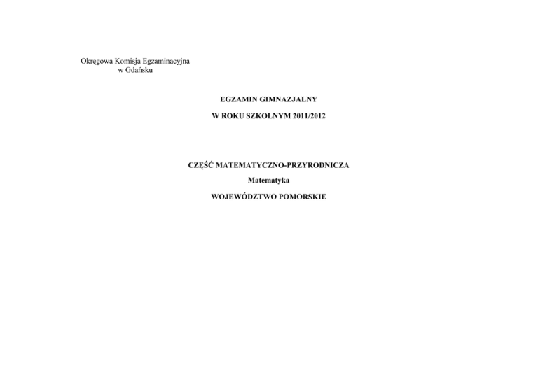 Okręgowa Komisja Egzaminacyjna w Gdańsku EGZAMIN GIMNAZJALNY W ROKU SZKOLNYM 2011/2012 CZĘŚĆ MATEMATYCZNO-PRZYRODNICZA Matematyka WOJEWÓDZTWO POMORSKIE Osiągnięcia gimnazjalistów z zakresu matematyki w województwie pomorskim KWIECIEŃ 2012 Procent punktów uzyskanych za poszczególne umiejętności Wymagania szczegółowe Wynik średni w procentach Wymagania ogólne Nr zadania (z podstawy programowej) (z podstawy programowej) Uczeń 1. I. Wykorzystanie informacji. i tworzenie 9. Statystyka opisowa i wprowadzenie rachunku prawdopodobieństwa. II. Wykorzystywanie i interpretowanie reprezentacji. do 69 1) interpretuje dane przedstawione za pomocą tabel, diagramów słupkowych i kołowych, wykresów. 4) wyznacza średnią arytmetyczną i medianę zestawu danych. 2. II. Wykorzystywanie 2. Liczby wymierne (dodatnie i niedodatnie). i interpretowanie reprezentacji. 1) interpretuje liczby wymierne na osi liczbowej. Oblicza odległość między dwiema liczbami na osi liczbowej. Strona 2 z 8 44 3. III. Modelowanie matematyczne. 1. Liczby wymierne dodatnie. 55 7) stosuje obliczenia na liczbach wymiernych do rozwiązywania problemów w kontekście praktycznym, w tym zamiany jednostek (prędkości, gęstości itp.). 7. Równania. 4. 5. 6. 7) za pomocą równań lub układów równań opisuje i rozwiązuje zadania osadzone w kontekście praktycznym. 28 3. Potęgi. II. Wykorzystywanie i interpretowanie reprezentacji. 1) oblicza potęgi liczb wymiernych o wykładnikach naturalnych. 2) zapisuje w postaci jednej potęgi: iloczyny i ilorazy potęg o takich samych podstawach, iloczyny i ilorazy potęg o takich samych wykładnikach oraz potęgę potęgi (przy wykładnikach naturalnych). II. Wykorzystywanie 2. Liczby wymierne (dodatnie i niedodatnie). i interpretowanie reprezentacji. 3) dodaje, odejmuje, mnoŜy i dzieli liczby wymierne. I. Wykorzystanie informacji. i tworzenie 8. Wykresy funkcji. 4) odczytuje i interpretuje informacje przedstawione za pomocą wykresu funkcji (w tym wykresów opisujących zjawiska występujące w przyrodzie, gospodarce, Ŝyciu codziennym). Strona 3 z 8 64 87 7. II. Wykorzystywanie 5. Procenty. 56 i interpretowanie reprezentacji. 4) stosuje obliczenia procentowe do rozwiązywania problemów w kontekście praktycznym, np. oblicza ceny po podwyŜce lub obniŜce o dany procent [...]. 8. II. Wykorzystywanie i interpretowanie 5. Procenty. 70 reprezentacji. 1) przedstawia część pewnej wielkości jako procent III. Modelowanie matematyczne. lub promil tej wielkości i odwrotnie. 9. II. Wykorzystywanie i interpretowanie 1. Liczby wymierne dodatnie. 59 reprezentacji. 7) stosuje obliczenia na liczbach wymiernych do rozwiązywania problemów w kontekście III. Modelowanie matematyczne. praktycznym [...]. 5. Działania na ułamkach zwykłych i dziesiętnych. 5) oblicza ułamek danej liczby naturalnej. (SP) 10. II. Wykorzystywanie i interpretowanie reprezentacji 9. Statystyka opisowa i wprowadzenie rachunku prawdopodobieństwa. do 58 5) analizuje proste doświadczenia losowe (np. rzut kostką, rzut monetą, wyciąganie losu) i określa prawdopodobieństwo najprostszych zdarzeń w tych doświadczeniach (prawdopodobieństwo wypadnięcia orła w rzucie monetą, dwójki lub szóstki w rzucie kostką itp.). Strona 4 z 8 4. Ułamki zwykłe i dziesiętne. 11. I. Wykorzystanie informacji. i 12) porównuje ułamki (zwykłe i dziesiętne). (SP) tworzenie 8. Wykresy funkcji. 82 2) odczytuje współrzędne danych punktów; II. Wykorzystywanie i interpretowanie reprezentacji. 12. I. Wykorzystanie informacji. i tworzenie 6. WyraŜenia algebraiczne. III. Modelowanie matematyczne. 46 1) opisuje za pomocą wyraŜeń algebraicznych związki między róŜnymi wielkościami V Rozumowanie i argumentacja. 13. I. Wykorzystanie informacji. i tworzenie 6. WyraŜenia algebraiczne. III. Modelowanie matematyczne. 39 1) opisuje za pomocą wyraŜeń algebraicznych związki między róŜnymi wielkościami. 8. Wykresy funkcji. 14. IV. UŜycie i tworzenie strategii. 4) odczytuje i interpretuje informacje przedstawione za pomocą wykresu funkcji [...]. 1. Liczby wymierne dodatnie. 24 7) stosuje obliczenia na liczbach wymiernych do rozwiązywania problemów w kontekście praktycznym, w tym zamiany jednostek (prędkości, gęstości itp.). Strona 5 z 8 7. Równania. 15. 16. II. Wykorzystywanie 7) za pomocą równań lub układów równań opisuje i rozwiązuje zadania osadzone w kontekście praktycznym. 47 10. Figury płaskie. i interpretowanie reprezentacji 16) rozpoznaje pary figur symetrycznych względem prostej i względem punktu. Rysuje pary figur symetrycznych. III. Modelowanie matematyczne. 10. Figury płaskie. 45 21) konstruuje okrąg opisany na trójkącie oraz okrąg wpisany w trójkąt. 17. V. Rozumowanie i argumentacja. 10. Figury płaskie. 73 15) korzysta z własności trójkątów prostokątnych podobnych. 9. Wielokąty, koła, okręgi. 3) stosuje twierdzenie o sumie kątów trójkąta. 18. II. Wykorzystywanie 10. Figury płaskie. i interpretowanie reprezentacji 6) oblicza pole koła, pierścienia kołowego, wycinka kołowego. 9) oblicza pola i obwody trójkątów i czworokątów. III. Modelowanie matematyczne. Strona 6 z 8 53 19. 20. 21. 22. IV. UŜycie i tworzenie strategii. 50 11. Bryły. 2) oblicza pole powierzchni i objętość graniastosłupa prostego, ostrosłupa, walca, stoŜka, kuli (takŜe w zadaniach osadzonych w kontekście praktycznym). 51 II. Wykorzystywanie i interpretowanie 11. Bryły. reprezentacji. 2) oblicza pole powierzchni i objętość graniastosłupa prostego, ostrosłupa, walca, stoŜka, kuli (takŜe w zadaniach osadzonych w kontekście praktycznym). 36 I. Wykorzystanie i tworzenie 7. Równania. informacji. 7) za pomocą równań lub układów równań opisuje i rozwiązuje zadania osadzone w kontekście IV. UŜycie i tworzenie strategii. praktycznym. V. Rozumowanie i argumentacja. V. Rozumowanie i argumentacja. 17 8. Kąty. (SP) 1) rozpoznaje kąty wierzchołkowe i przyległe