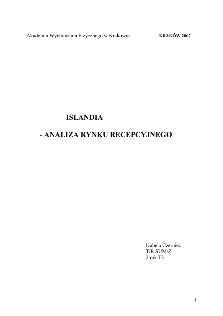 Akademia Wychowania Fizycznego w Krakowie KRAKÓW 2007 ISLANDIA - ANALIZA RYNKU RECEPCYJNEGO Izabela Czerniec TiR SUM/Z 2 rok T3 1 SPIS TREŚCI A. WPROWADZENIE……………………………………………………………………..3 1. Informacje ogólne……………………………………………………………………3 1.1. Polityka………………………………………………………………………...4 1.2. Geografia…………………………………………………………………….....5 1.3. Ludność………………………………………………………………………..11 1.4. Gospodarka…………………………………………………………………....11 1.5. Komunikacja i transport……………………………………………………….11 B. WARUNKI ROZWOJU TURYSTYKI………………………………………………...12 1. Przyrodnicze………………………………………………………………………...12 2. Geoturystyczne……………………………………………………………………...17 3. Kulturowe…………………………………………………………………………...17 C. ANALIZA RYNKU RECEPCYJNEGO……………………………………………….23 1. Przemysł turystyczny………………………………………………………………..23 2. Rynek recepcji turystycznej…………………………………………………………26 2.1. Liczba odwiedzających………………………………………………………..26 2.2. Środki transportu uŜywane przez turystów……………………………………28 2.3. Struktura odwiedzających……………………………………………………..29 2.4. Cele przyjazdów……………………………………………………………….31 3. Baza noclegowa……………………………………………………………………..32 3.1. Hotele………………………………………………………………………….32 3.2. Inne obiekty zakwaterowania………………………………………………….36 4. BranŜa turystyczna…………………………………………………………………..38 4.1. Usługi lotnicze…………………………………………………………………38 4.2. WypoŜyczalnie samochodów…………………………………………………..39 5. Fotografie Islandia…………………………………………………………………...40 6. Bibliografia…………………………………………………………………………..43 2 A. WPROWADZENIE 1. INFORMACJE OGÓLNE Mapa nr 1 – połoŜenie Islandii na mapie Świata1 Mapa nr 2 – Islandia2 Państwo Islandia połoŜone jest na wyspie o tej samej nazwie w Północnej Europie na Oceanie Atlantyckim. Jest jednym z krajów nordyckich (razem z Danią, Norwegią, Szwecją i Finlandią). Administracyjnie kraj podzielony jest na 233 regiony oraz 14 niezaleŜnych miast. Ponadto wyróŜnia się 104 gminy, które zajmują się oświatą, transportem i zagospodarowaniem przestrzeni. 1 www.wikipedia.org www.state.gov 3 www.wikipedia.org 2 3 Mapa nr 3 – Islandia - podział polityczny.4 1.1. POLITYKA5 OFICJALNA NAZWA: Republika Islandii NAZWA W JĘZYKU LOKALNYM: Lydveldid Island STOLICA: Reykiawik USTRÓJ: republika konstytucyjna JĘZYK: islandzki – oficjalny, ponadto w uŜyciu języki skandynawskie, 6 WALUTA: korona islandzka (ISK) (100 ISK=3,90 PLN) RELIGIA: chrześcijaństwo – wyznanie ewangelicko-luterańskie angielski Islandia jest członkiem min. NATO od 1949 roku, ONZ, EFTA OD 1970 roku, nie jest natomiast członkiem Unii Europejskiej min. z obawy przez przepisy dotyczące ograniczenia wielkości połowu ryb (główna gałąź gospodarki Islandii). Islandia nie posiada równieŜ regularnego wojska, w Keflaviku stacjonowali Ŝołnierze amerykańscy (do 2007 roku). HISTORIA Islandia naleŜy do najpóźniej zasiedlonych obszarów Europy. Pierwsi osadnicy pojawili się w roku 8747. Byli to norwescy wikingowie oraz celtyccy (szkoccy i iryjscy) osadnicy. W roku 930 osadnicy załoŜyli pierwszy w świecie parlament zwanym Althingiem. Islandia zjednoczyła się z Norwegią w 1262 roku. Oba kraje w 1380 roku znalazły się pod panowaniem duńskim. Pewną autonomię kraj uzyskał w roku 1874. W 1918 odzyskała niepodległość, z królem duńskim jako tytularną głową państwa. W czasie II wojny światowej kraj okupowali alianci. Islandia uzyskała niepodległość 17 czerwca 1944 roku. 4 www.wikipedia.org „Przewodnik po Świecie” Przeglą Reader’s Digest 2001 6 www.xe.com 7 www.islandia.org.pl 5 4 Islandia jako pierwsza na świecie w 1980 roku wybrała kobietę na urząd prezydenta, była to pani Vigdís Finnbogadóttir. FLAGA Flaga Islandii ma postać prostokąta z dwoma nałoŜonymi na siebie krzyŜami. Niebieski i biały to tradycyjne kolory Islandii. Kolor niebieski ma związek z górami, a biały z pokrywającym je śniegiem. Czerwień nawiązuje do ognia, wydobywającego się z wnętrza wielu czynnych na wyspie wulkanów. Dodanie czerwonego krzyŜa podkreśla związki Islandii z Norwegią, skąd przybyli pierwsi średniowieczni osadnicy i z którą Islandczycy najbardziej czują się związani kulturowo. HERB Tłem tarczy jest flaga islandzka. Tarcza oparta jest na płycie bazaltu. Podtrzymują ją legendarne duchy opiekuńcze kraju: smok (lub gryf), orzeł, byk i olbrzym. HYMN „Lofsöngur“, czyli hymn dla uczczenia milenium Islandii powstał w 18748 r. z okazji tysiąclecia historii osadnictwa na wyspie. 1.2. GEOGRAFIA 1.2.1. Informacje ogólne Islandia leŜy na Oceanie Atlantyckim tuŜ pod kołem podbiegunowym północnym. Od Północy oblewa ją Morze Grenlandzkie. W Północno-Zachodniej i Zachodniej części wyspy zatoki: Huna, Breidha i Faxa. NajbliŜszy „sąsiad” Grenlandia oddzielona jest Cieśniną Duńską