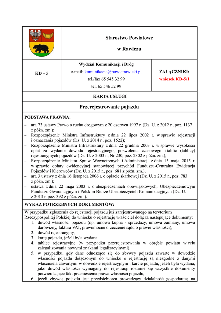 Starostwo Powiatowe w Rawiczu Wydział Komunikacji i Dróg KD – 5 e-mail: [email protected] ZAŁĄCZNIKI: tel./fax 65 545 32 99 wniosek KD-5/1 tel. 65 546 52 99 KARTA USŁUGI Przerejestrowanie pojazdu PODSTAWA PRAWNA: art. 73 ustawy Prawo o ruchu drogowym z 20 czerwca 1997 r. (Dz. U. z 2012 r., poz. 1137 z późn. zm.); Rozporządzenie Ministra Infrastruktury z dnia 22 lipca 2002 r. w sprawie rejestracji i oznaczania pojazdów (Dz. U. z 2014 r., poz. 1522); Rozporządzenie Ministra Infrastruktury z dnia 22 grudnia 2003 r. w sprawie wysokości opłat za wydanie dowodu rejestracyjnego, pozwolenia czasowego i tablic (tablicy) rejestracyjnych pojazdów (Dz. U. z 2003 r., Nr 230, poz. 2302 z późn. zm.); Rozporządzenie Ministra Spraw Wewnętrznych i Administracji z dnia 15 maja 2015 r. w sprawie opłaty ewidencyjnej stanowiącej przychód Funduszu-Centralna Ewidencja Pojazdów i Kierowców (Dz. U. z 2015 r., poz. 681 z późn. zm.); art. 3 ustawy z dnia 16 listopada 2006 r. o opłacie skarbowej (Dz. U. z 2015 r., poz. 783 z późn. zm.); ustawa z dnia 22 maja 2003 r. o ubezpieczeniach obowiązkowych, Ubezpieczeniowym Funduszu Gwarancyjnym i Polskim Biurze Ubezpieczycieli Komunikacyjnych (Dz. U. z 2013 r. poz. 392 z późn. zm.). WYKAZ POTRZEBNYCH DOKUMENTÓW: W przypadku zgłoszenia do rejestracji pojazdu już zarejestrowanego na terytorium Rzeczypospolitej Polskiej do wniosku o rejestrację właściciel dołącza następujące dokumenty: 1. dowód własności pojazdu (np. umowa kupna - sprzedaży, umowa zamiany, umowa darowizny, faktura VAT, prawomocne orzeczenie sądu o prawie własności), 2. dowód rejestracyjny, 3. kartę pojazdu, jeżeli była wydana, 4. tablice rejestracyjne (w przypadku przerejestrowania w obrębie powiatu w celu zalegalizowania nowymi znakami legalizacyjnymi), 5. w przypadku, gdy dane odnoszące się do zbywcy pojazdu zawarte w dowodzie własności pojazdu dołączonym do wniosku o rejestrację są niezgodne z danymi właściciela zawartymi w dowodzie rejestracyjnym i karcie pojazdu, jeżeli była wydana, jako dowód własności wymagany do rejestracji rozumie się wszystkie dokumenty potwierdzające fakt przeniesienia prawa własności pojazdu, 6. jeżeli zbywcą pojazdu jest przedsiębiorca prowadzący działalność gospodarczą na terytorium Rzeczypospolitej Polskiej w zakresie obrotu pojazdami, jako dowód własności potwierdzający nabycie prawa własności przez tego zbywcę dopuszcza się uwierzytelnioną notarialnie kopię tego dowodu, 7. w przypadku zagubienia dowodu rejestracyjnego lub karty pojazdu przed ponownym zarejestrowaniem pojazdu, właściciel pojazdu dołącza do wniosku o rejestrację zaświadczenie wystawione przez organ rejestrujący właściwy ze względu na miejsce ostatniej rejestracji, potwierdzające dane zawarte w zagubionym dokumencie, 8. dowód tożsamości, 9. opłata ubezpieczenia OC – do okazania, 10. pełnomocnictwo w przypadku działania przez przedstawiciela dla osoby załatwiającej sprawę (za wyjątkiem reprezentowania osoby prawnej przez swoje uprawnione organy lub prokurenta). WYSOKOŚĆ OPŁAT: 1. opłata ewidencyjna za wydanie: a) dowodu rejestracyjnego: 0,50 zł, b) pozwolenia czasowego: 0,50 zł, c) zalegalizowanych tablic (tablicy) rejestracyjnych: 0,50 zł, d) nalepki kontrolnej na szybę : 0,50 zł ponadto: 2. dowód rejestracyjny: 54,00 zł, 3. pozwolenie czasowe: 13,50 zł, 4. znaki legalizacyjne: 12,50 zł, 5. tablice rej. samochodowe 80,00 zł 6. nalepka kontrolna na szybę: 18,50 zł 7. pełnomocnictwo 17,00 zł (zwolnione z opłaty skarbowej jest pełnomocnictwo udzielone małżonkowi, wstępnemu, zstępnemu, rodzeństwu lub gdy mocodawcą jest podmiot zwolniony z opłaty skarbowej). DOKŁADNE OKREŚLENIE MIEJSCA WYKONANIA USŁUGI: Starostwo Powiatowe w Rawiczu Wydział Komunikacji i Dróg Rawicz, Wały J. Dąbrowskiego 2, pokój nr 9 (parter) tel./fax 65 545 32 99, 65 546 52 99 Godziny urzędowania Wydziału: poniedziałek: 8.00-16.00, wtorek- piątek: 7.00-15.00 e-mail: [email protected] OKREŚLENIE CZASU REALIZACJI: Niezwłocznie po przedłożeniu wymaganych dokumentów. Odbiór stałego dowodu rejestracyjnego w ciągu 14 dni od złożenia wniosku o przerejestrowanie. W przypadku wyrażenia zgody i podania numeru telefonu komórkowego można otrzymać bezpłatny sms informującego o możliwości odbioru dowodu rejestracyjnego. INFORMACJA O TRYBIE ODWOŁAWCZYM: Od decyzji administracyjnej wydanej przez Starostę Rawickiego przysługuje odwołanie do Samorządowego Kolegium Odwoławczego w Lesznie w terminie 14 dni od dnia doręczenia decyzji za pośrednictwem Starosty. UWAGI: -