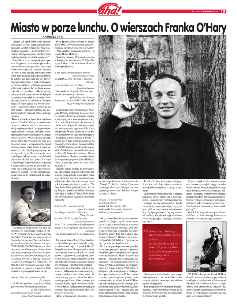 nr 230 - SIERPIEŃ 2016 19 Miasto w porze lunchu. O wierszach Franka O’Hary ANDRZEJ JAR „Zmarł 25 lipca 1966 roku, niecały miesiąc po swoich czterdziestych urodzinach. Został potrącony przez samochód na plaży – nieszczęśliwy wypadek, którego niejasne okoliczności nadal ogłuszają swoim bezsensem.”1 Zwróciłem na to uwagę dopiero potem. Najpierw, na samym początku, postawiłem sobie pytanie, dlaczego właściwie czytam wiersze Franka O’Hary. Może zresztą nie postawiłem sobie tego pytania, tylko pomyślałem, że gdyby tak przyszło mi do głowy napisać kilka słów o tych wierszach, to byłoby dobrze, gdybym postawił sobie takie pytanie, bo szukając na nie odpowiedzi, miałbym całkiem niezły początek takiego tekstu. Gdybym wcześniej zauważył to, że mija właśnie pięćdziesiąt lat od dnia, w którym Frank O’Hara zginął we freaky accident – uderzony przez taksówkę na Fire Island – prawdopodobnie nie potrzebowałbym stawiać sobie takiego pytania. Rzecz jednak w tym, że czytałem wiersze Franka O’Hary w moim ulubionym parku na ławce – bo zawsze, kiedy wybieram się do mojego ulubionego parku i wrzucam do torby z emblematem Native Education College (Your Journey Home) kilka puszek piwa, lubię też wrzucić do niej coś do poczytania – i przechodzili przed moimi oczami różni ludzie i, mówiąc szczerze, nie mógłbym przysiąc, że to czytanie było dla mnie cały czas ważniejsze od patrzenia na tych ludzi i łykania ukradkiem piwa, i z tego wszystkiego dopiero potem, w jednej z takich chwil, kiedy to czytanie stawało się ważniejsze od tego wszystkiego co wokół – wtedy dopiero zauważyłem, że to pięćdziesiąt lat właśnie mija. Wcześniej zwróciłem uwagę na spójnik i w wierszach Franka O’Hary. W wierszu The Day Lady Died na przykład: I walk up the muggy street beginning to sun/ and have a hamburger and a malted and buy/ an ugly NEW WORLD WRITING to see what the poets/ in Ghana are doing these days (idę po parnej ulicy zaczyna prażyć słońce/ i zjadam hamburger i piję koktajl mleczny i kupuję/ szpetnie wydanych PISARZY TRZECIEGO ŚWIATA/ żeby zobaczyć co tam/ ostatnio słychać u poetów w Ghanie2). I tak do końca z tym spójnikiem i, aż po: i pot już leje się ze mnie i myślę [o tym jak w 5 SPOT oparłem się o drzwi kibla gdy ona nad klawiaturą szeptała [Mal Waldronowi piosenkę i wszystkim i mnie [na chwilę zamarł oddech Five Spot Café to otwarty w latach 1956-1962 nowojorski klub jazzowy, miejsce spotkań pisarzy i artystów – Mal Wadron to pianista jazzowy – a ona to Billie Holiday. Świetny wiersz. Wspaniała elegia, w której pora lunchu (Jest 12:20 w Nowym Jorku…) dudni żalem, albo żal dudni porą lunchu: a dla Mike’a wchodzę po prostu [do monopolowego na PARK LANE i proszę o butelkę [Stregi i wracam skąd przyszedłem [na 6-tą Avenue i do kiosku w Ziegfield Theatre i od niechcenia proszę o karton [Gauloise’ów i karton Picayune’ów, i o NEW YORK POST [z jej twarzą na wierzchu Znakomita znawczyni poezji Marjorie Perloff, analizując tę elegię wers po wersie, dostrzega związek między występującym w nim profanum a życiem wielkiej śpiewaczki jazzowej, „która w końcu padła ofiarą narkomanii, nękana przez agentów FBI i naloty policji. W tym sensie jej świat jest światem parnych ulic, hamburgerów i koktajlów, drzwi kibla i 5 SPOT”3. Zaś to co w tym wierszu pojawia się pomiędzy parną ulicą i drzwiami kibla w 5 SPOT i odnosi się do sztuki wysokiej – Verlaine’a, Bonnarda, Hezjoda w tłum. Richmonda Lattimore, Brendana Behana, Geneta – to odwołanie do wspaniałego głosu Billie Holiday, który „wynosi ją ponad to, czym była za życia”4. Bardzo ładnie zostało to powiedziane, ale trochę inaczej odbieram ten wiersz, może przede wszystkim przez jego pierwszą zwrotkę (to odwracanie kolejności obrazów wiersza ma związek z jego oryginalnym tytułem, The Day Lady Died, jeśli wiedzieć, że Lady Day to przydomek Billie Holiday), mówiącą o piątku, 17 lipca 1959, który ma być takim zwyczajnym pewnym piątkiem: Jest 12:20 w Nowym Jorku [pewien piątek trzy dni po rocznicy zburzenia [Bastylii, aha jest rok 1959 i wychodzę żeby [znaleźć pucybuta bo o 7:15 wysiadam w Easthampton z tego o 4:19 a potem idę prosto na [kolację i nie znam ludzi którzy mi dadzą jeść Elegia na śmierć Lady Day, bardziej od straszliwego życia artystki, przywodzi mi na myśl „Upadek Ikara” Bruegla: życie w Nowym Jorku toczy się w porze lunchu tak jak co dzień, trzeba wyglansować buty przed umówioną kolacją, która odbędzie się tak jak była planowania, wcześniej trzeba coś przekąsić – hamburgera i koktajl… Wszystko jest normalne, jak być powinno. I tylko artysta, twórca artystycznego przekazu, wie co się stało; odczuwa wagę tego, co się stało. Widzi spadającego Ikara. Albo pamięta ten wieczór, kiedy oparł się o drzwi kibla w Five Spot i oddech mu zamarł gdy ona nad klawiaturą szeptała Mal Waldronowi/ piosenkę… Albo, wracając do spójnika i, to je- sienne uspokojenie w zakończeniu „Muzyki”: Ale już żadnych fontann i żadnego deszczu,/ i sklepy otwarte będą do późna w noc. Także to wszystko naraz w Steps: oh god it’s wonderful to get out of bed and drink too much coffee and smoke too many cigarettes and love you so much Albo, z innej beczki, ta zabawna niejasność w „Eseju o stylu”: moja siostra jest w ciąży i/ pojechała na weekend na wieś nic jej nie/ mówiąc. „Nie mówiąc o czym? Że wyjeżdża na wieś? Że jest w ciąży? Lub też o jakiejś trzeciej rewelacji?”5 Do tego ta współrzędność dwóch faktów – bycia w ciąży i bycia w weekend na wsi. Ale – wracając do postawionego sobie na samym początku pytania – przecież nie tylko z powodu spójników czytam wiersze Franka O’Hary. I nawet nie dlatego – chociaż ma to znaczenie zasadnicze – że pośród ustawionych 