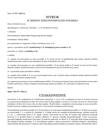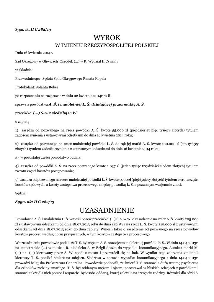 Sygn. akt II C 282/13 WYROK W IMIENIU RZECZYPOSPOLITEJ POLSKIEJ Dnia 16 kwietnia 2014r. Sąd Okręgowy w Gliwicach Ośrodek (...) w R. Wydział II Cywilny w składzie: Przewodniczący: Sędzia Sądu Okręgowego Renata Kopala Protokolant: Jolanta Bober po rozpoznaniu na rozprawie w dniu 02 kwietnia 2014r. w R. sprawy z powództwa A. Ś. i małoletniej Ł. Ś. działającej przez matkę A. Ś. przeciwko (...) S.A. z siedzibą w W. o zapłatę 1) zasądza od pozwanego na rzecz powódki A. Ś. kwotę 55.000 zł (pięćdziesiąt pięć tysięcy złotych) tytułem zadośćuczynienia z ustawowymi odsetkami do dnia 16 kwietnia 2014 roku; 2) zasądza od pozwanego na rzecz małoletniej powódki Ł. Ś. do rąk jej matki A. Ś. kwotę 100.000 zł (sto tysięcy złotych) tytułem zadośćuczynienia z ustawowymi odsetkami do dnia 16 kwietnia 2014 roku; 3) w pozostałej części powództwo oddala; 4) zasądza od powódki A. Ś. na rzecz pozwanego kwotę 1.037 zł (jeden tysiąc trzydzieści siedem złotych) tytułem zwrotu części kosztów postępowania; 5) zasądza od pozwanego na rzecz małoletniej powódki Ł. Ś. kwotę 5000 zł (pięć tysięcy złotych) tytułem zwrotu części kosztów sądowych, a koszty zastępstwa procesowego między powódką Ł. Ś. a pozwanym wzajemnie znosi. Sędzia: Sygn. akt II C 282/13 UZASADNIENIE Powodowie A. Ś. i małoletnia Ł. Ś. wnieśli pozew przeciwko (...) S.A. w W. o zasądzenie na rzecz A. Ś. kwoty 205.000 zł z ustawowymi odsetkami od dnia 18.07.2013 roku do dnia zapłaty i na rzecz Ł. Ś. kwoty 210.000 zł z ustawowymi odsetkami od dnia 18.07.2013 roku do dnia zapłaty. Wnieśli także o zasądzenie od pozwanego na rzecz powodów kosztów procesu według norm przypisanych, w tym kosztów zastępstwa procesowego. W uzasadnieniu powodowie podali, że T. Ś. był mężem A. Ś. oraz ojcem małoletniej powódki Ł. Ś.. W dniu 14.04.2013r. na autostradzie (...) w mieście R. niedaleko A. w Belgii doszło do wypadku komunikacyjnego. Autokar marki M. (...) nr (...) kierowany przez S. W. spadł z mostu i przewrócił się na bok. W wyniku tego zdarzenia zmiennik kierowcy T. Ś. poniósł śmierć na miejscu. Śledztwo w sprawie wypadku komunikacyjnego z dnia 14.04.2013r. prowadzi belgijska Prokuratura Generalna. Powodowie podnosili, że śmierć T. Ś. stanowiła dużą traumę psychiczną dla członków rodziny zmarłego. T. Ś. był oddanym mężem i ojcem, pozostawał w bliskich relacjach z powódkami, stanowił także dla nich pomoc i wsparcie. Był osobą oddaną, której zależało na szczęściu rodziny. Również dla córki Ł. Ś. zmarły stanowił wzór do naśladowania, był oddanym rodzicem, miał nawet imię córki wytatuowane na ramieniu. Z małoletnią zmarły pozostawał w serdecznych stosunkach. Niespodziewana śmierć T. Ś. stanowiła dla powódek wielką tragedię, A. Ś. korzystała z pomocy poradni psychiatrycznej, wymaga dalszego leczenia farmakologicznego i wsparcia psychoterapeutycznego. Po śmierci ojca małoletnia Ł. Ś. wykazuje płaczliwość, zamknięcie w sobie, poczucie zagrożenia, brak radości, rezygnację z aktywności, zainteresowań, problemy z rozstaniem z babcią i matką, postawę lękową, brak zaangażowania w zajęcia, niechęć do zabawy. Powodowie wskazali, że pozwany wypłacił tytułem zadośćuczynienia A. Ś. kwotę 45.000 zł, zaś Ł. Ś. kwotę 40.000 zł. Pozwany (...) S.A. w W. wniósł o oddalenie powództwa, a także o zasądzenie od powodów na jego rzecz kosztów postępowania, w tym kosztów zastępstwa procesowego, według norm przepisanych. W uzasadnieniu pozwany wskazał, że właściciel pojazdu, którego ruchem został spowodowany wypadek komunikacyjny z dnia 14.04.2013r. zawarł z pozwanym umowę ubezpieczenia OC, a pozwany przyjął na siebie odpowiedzialność gwarancyjną w ramach której wypłacił tytułem zadośćuczynienia A. Ś. kwotę 45.000 zł i Ł. Ś. kwotę 40.000 zł. Pozwany nie negował bólu i cierpienia odczuwanego przez powódki po stracie członka rodziny, jednakże w jego ocenie żądane zadośćuczynienie jest rażąco wygórowane i odstaje od przeciętnego poziomu życia społeczeństwa. Pozwany podnosił, że nieuzasadnione jest żądanie odsetek od dnia 18.07.2013 roku, gdyż należą się one wierzycielowi od chwili gdy dłużnik opóźnia się ze spełnieniem wymaganego świadczenia, a w sprawach o zadośćuczynienie rozmiar krzywdy ustala de facto Sąd dopiero w wyroku. Sąd ustalił następujący stan faktyczny: T. Ś. był zatrudniony w przedsiębiorstwie Usługi (...) w J. jako kierowca. W dniu 14.04.2013 roku po przerwie w podróży trwającej co najmniej 9 godzin tj. około godz. 21-22 autobus marki M. o nr rej. (...) prowadzony przez T. Ś. rozpoczął podróż z B. na trasie: M.-H. i B. nastąpiło zatrzymanie, podczas którego dokonano zmiany kierowców. Po zakończeniu postoju pracę kierowcy objął S. W., który prowadził pojazd do miejsca wypadku w miejscowości R. przed A. na terenie Belgii. Na autostradzie (...) w mieście R. niedaleko A. w Belgii autokar marki M. (...) nr (...) kierowany przez S. W. spadł z mostu i przewrócił się na bok. W wyniku tego zdarzenia zmiennik kierowcy T. Ś., który w tym czasie odpoczywał w kabinie sypialnej, poniósł śmierć na miejscu. W wyniku wypadku śmierć poniosło także trzech pasażerów i kierowca prowadzący autokar S. W.. Śledztwo w sprawie wypadku komunikacyjnego z dnia 14.04.2013r. prowadzi belgijska Prokuratura Generalna. Pozwany (...) S.A. w W. przyznał decyzją z dnia 18.07.2013 roku tytułem zadośćuczynienia A. Ś. kwotę 50.000 zł i Ł. Ś. kwotę 40.000 zł, a w pozostałym zakresie oddalił roszczenia jako zbyt wygórowane. Tą samą decyzją pozwany przyznał tytułem odszkodowania A. Ś. kwotę 50.000 zł i Ł. Ś. kwotę 60.000 zł. T. Ś. był mężem A. Ś. oraz ojcem małoletniej powódki Ł. Ś.. Małżonkowie zamieszkiwali u rodziców A. Ś., mieli plany na przyszłość, zam