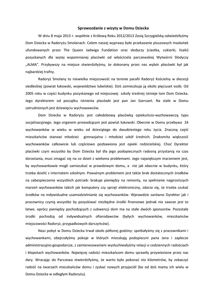 Sprawozdanie z wizyty w Domu Dziecka W dniu 8 maja 2013 r. wspólnie z Królową Roku 2012/2013 Zosią Szczygielską odwiedziłyśmy Dom Dziecka w Radoryżu Smolanach. Celem naszej wyprawy było przekazanie pluszowych maskotek ufundowanych przez The Queen Jadwiga Fundation oraz słodyczy (ciastka, cukierki, lizaki) pozyskanych dla wyżej wspomnianej placówki od właściciela parczewskiej Wytwórni Słodyczy „ALMA”. Przybywszy na miejsce stwierdziłyśmy, że dokonany przez nas wybór placówki był jak najbardziej trafny. Radoryż Smolany to niewielka miejscowość na terenie parafii Radoryż Kościelny w diecezji siedleckiej (powiat łukowski, województwo lubelskie). Dziś zamieszkuje ją około pięciuset osób. Od 2005 roku w części budynku pozyskanego od miejscowej szkoły średniej istnieje tam Dom Dziecka. Jego dyrektorem od początku istnienia placówki jest pan Jan Szerszeń. Na stałe w Domu zatrudnionych jest dziewięciu wychowawców. Dom Dziecka w Radoryżu jest całodobową placówką opiekuńczo-wychowawczą typu socjalizacyjnego. Jego organem prowadzącym jest powiat łukowski. Obecnie w Domu przebywa 24 wychowanków w wieku w wieku od dziesiątego do dwudziestego roku życia. Znaczną część mieszkańców stanowi młodzież gimnazjalna i młodzież szkół średnich. Znakomita większość wychowanków całkowicie lub częściowo pozbawiona jest opieki rodzicielskiej. Choć Dyrektor placówki czyni wszystko by Dom Dziecka był dla jego podopiecznych radosną przystanią na czas dorastania, musi zmagać się na co dzień z wieloma problemami. Jego największym marzeniem jest, by wychowankowie mogli zamieszkać w prawdziwym domu, a nie jak obecnie w budynku, który trzeba dzielić z internatem szkolnym. Poważnym problemem jest także brak dostatecznych środków na zabezpieczenia wszystkich potrzeb: brakuje pieniędzy na remonty, na spełnianie najprostszych marzeń wychowanków takich jak komputery czy sprzęt elektroniczny, zdarza się, że trzeba szukać środków na indywidualne usamodzielnianie się wychowanków. Wprawdzie zarówno Dyrektor jak i pracownicy czynią wszystko by pozyskiwać niezbędne środki finansowe jednak nie zawsze jest to łatwe. oprócz pieniędzy pochodzących z subwencji dom ma na stałe dwóch sponsorów. Pozostałe środki pochodzą od indywidualnych ofiarodawców (byłych wychowanków, mieszkańców miejscowości Radoryż, przypadkowych darczyńców). Nasz pobyt w Domu Dziecka trwał około półtorej godziny: spotkałyśmy się z pracownikami i wychowankami, obejrzałyśmy pokoje w których mieszkają podopieczni pana Jana i zaplecze administracyjno-gospodarcze, z zainteresowaniem wysłuchiwałyśmy relacji o codziennych radościach i kłopotach wychowanków. Najwięcej radości mieszkańcom domu sprawiły przywiezione przez nas dary. Wracając do Parczewa stwierdziłyśmy, że warto było pokonać sto kilometrów, by zobaczyć radość na twarzach mieszkańców domu i zyskać nowych przyjaciół (bo od dziś mamy ich wielu w Domu Dziecka w odległym Radoryżu). Wyrażamy wdzięczność pracownikom The Queen Jadwiga Fundation za ufundowanie ofiarowanych przez nas maskotek. Dzięki pomocy Państwa mogliśmy przynajmniej na kilka chwil zmienić szarą rzeczywistość domu w który odwiedziłyśmy Królowa Roku 2012/2013: Zosia Szczygielska Opiekun Królowej: Joanna Borowicz