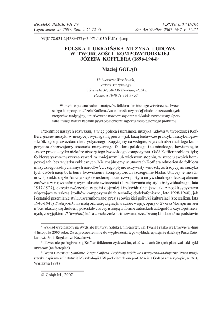 ВІСНИК ЛЬВІВ. УН-ТУ Серія мист-во. 2007. Вип. 7. С. 72-71 VISNYK LVIV UNIV. Ser. Art Studies. 2007. № 7. Р. 72-71 УДК 78.031.2(438+477)+7.071.1.036 Й.Коффлер POLSKA I UKRAIŃSKA MUZYKA LUDOWA W TWÓRCZOŚCI KOMPOZYTORSKIEJ JÓZEFA KOFFLERA (1896-1944)∗ Maciej GOLĄB Uniwersytet Wrocławski, Zakład Muzykologii ul. Szewska 36, 50-139 Wrocław, Polska, Phone: 8 1048 71 344 57 57 W artykule podano badania motywów folkłoru ukraińskiego w twórczości lwowskiego kompozytora Józefa Kofflera. Autor określa trzy podejścia do aranżowania tych motywów: tradycyjny, umiarkowano nowoczesny oraz radykalnie nowoczesny. Specialna uwaga należy badaniu psychologicznemu aspektu aksiologicznego problemu. Przedmiot naszych rozważań, a więc polska i ukraińska muzyka ludowa w twórczości Kofflera (casus muzyki w muzyce), wymaga najpierw – jak każą badawcze praktyki muzykologów – krótkiego sprawozdania heurystycznego. Zapytajmy na wstępie, w jakich utworach tego kompozytora obserwujemy obecność muzycznego folkloru polskiego i ukraińskiego, bowiem są to –rzecz prosta – tylko niektóre utwory tego lwowskiego kompozytora. Otóż Koffier problematykę folklorystyczno-muzyczną zawarł, w mniejszym lub większym stopniu, w sześciu swoich kompozycjach, bez wyjątku cyklicznych. Nie znajdujemy w utworach Kofflera odniesień do folkloru muzycznego żadnych innych narodów1, z czego płynie oczywisty wniosek, że tradycyjna muzyka tych dwóch nacji była temu lwowskiemu kompozytorowi szczególnie bliska. Utwory te nie stanowią punktu ciężkości w jakiejś określonej fazie rozwoju stylu indywidualnego, lecz są obecne zarówno w najwcześniejszym okresie twórczości (kształtowania się stylu indywidualnego, lata 1917-1927), okresie twórczości w pełni dojrzałej i indywidualnej (związki z neoklasycyzmem włączające w zakres środków kompozytorskich technikę dodekafoniczną, lata 1928-1940), jak i ostatniej przemianie stylu, uwarunkowanej presją sowieckiej polityki kulturalnej (socrealizm, lata 1940-1941). Suita polska na małą orkiestrę zaginęła w czasie wojny, opusy 6, 27 oraz Чотири дитячі п’єси ukazały się drukiem, pozostałe utwory istnieją w formie autorskich autografów czystopiśmiennych, z wyjątkiem II Symfonii, która została zrekonstruowana przez Iwonę Lindstedt2 na podstawie Wykład wygłoszony na Wydziale Kultury i Sztuki Uniwersytetu im. Iwana Franko we Lwowie w dniu 4 listopada 2005 roku. Za zaproszenie mnie do wygłoszenia tego wykładu uprzejmie dziękuję Panu Dziekanowi, Prof. Bogdanowi Kozakowi. 1 Nawet nie posługiwał się Koffier folklorem żydowskim, choć w latach 20-tych planował taki cykl utworów (na fortepian). 2 Iwona Lindstedt: Symfonie Józefa Kofflera. Problemy źródłowe i muzyczno-analityczne. Praca magisterska napisana w Instytucie Muzykologii UW pod kierunkiem prof. Macieja Gołąba (maszynopis, ss. 263, Warszawa 1994) ∗ © Goląb M., 2007 Polska i ukraińska muzyka ludowa w twórczości kompozytorskiej Józefa Kofflera... 73 głosów orkiestrowych, bowiem jej partytura zaginęła. Bardziej szczegółowe podstawowe dane o omawianych na dzisiejszym wykładzie utworach Kofflera zawiera poniższa (Tabela 1)� Druga wstępna kwestia, jaką zamierzam teraz krótko przedyskutować, to teoretyczny (metodologiczny) punkt widzenia na zajmującą nas problematykę. Jak wiadomo, można ją przedstawiać na wiele sposobów. Na pierwszy plan wysuwa się tradycyjne poszukiwanie genezy (proweniencji) opracowywanego przez kompozytora materiału pieśniowego. Taki punkt widzenia bliski jest zwłaszcza etnomuzykologom, w związku z właściwymi im kompetencjami, tj. znajomością problematyki muzyki ludowej. Problematykę tę jako niespecjalista poruszać będę okazjonalnie, na tyle, na ile pozwoli mi ona wyodrębnić analizowany materiał i dokonać jego ogólnego opisu. Zdaję sobie sprawę, że w miarę jak twórczość Kofflera będzie lepiej przyswajana i poznawana, etnomuzykolodzy wskażą lepiej niż historyk muzyki na źródła inspiracji folklorem w twórczości tego kompozytora. Jako historyka muzyki szczególnie interesować mnie będzie natomiast owa paleta technik muzycznych, za pomocą których Koffler opracowuje melodie ludowe. Owe sposoby opracowywania (innymi słowy: muzyczne aranżacje) będą stanowić właściwy przedmiot naszych rozważań. Kryteriów dla systematyzowania tych aranżacji dostarcza nam historia muzyki XX wieku, w obrębie której – zwłaszcza w nurcie folkloryzmu począwszy od lat 20-tych –kształtowały się różne muzyczne strategie implantowania muzyki ludowej na grunt form muzyki artystycznej. Ta jedna z najbardziej żywotnych tendencji w historii muzyki XX wieku pozwoli nam określić różne rodzaje opracowań folkloru. Z takiego podłoża porównawczego możemy wyodrębnić trzy typy aranżacji folklorystycznych, obecne także w twórczości autora Uwertury radosnej, tj. (1) opracowania tradycyjne, (2) opracowania umiarkowanie nowoczesne oraz (3) opracowania radykalnie nowoczesne3. (Tabela 2) 1. Opracowania tradycyjne Wyrastają u Kofflera z bogatej XIX-wiecznej tradycji harmonizowania melodii ludowych, zapoczątkowanych w Polsce na większą skalę przez Oskara Kolberga, który w 1842 roku wydał w Poznaniu z własnym akompaniamentem Pieśni ludu polskiego. Był to, jak wiadomo, genre pierwotnego, XIX-wiecznego folkloryzmu, efekt swoistego zainteresowania się mieszczaństwa kulturą ludową, przemieszanej z estetyką rodzącego się romantyzmu. To nie był jeszcze świat wysublimowanej stylizacji tańców ludowych, jak w twórczości Chopina, lecz próba wprowadzenia do mniej elitarnego, szerszego obiegu społecznego pieśni ludowej, owej legitymacji odrębności narodowej. Pewna część analizowanego dziś dorobku folklorystyczno-muzycznego Kofflera wyrasta z tej właśnie czasowo najodleglejszej tradycji. Skrywa ona jak gdyby 