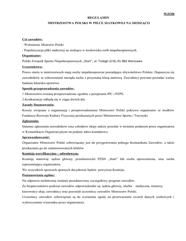WZÓR REGULAMIN MISTRZOSTWA POLSKI W PIŁCE SIATKOWEJ NA SIEDZĄCO Cel zawodów: - Wyłonienie Mistrzów Polski - Popularyzacja piłki siatkowej na siedząco w środowisku osób niepełnosprawnych. Organizator: Polski Związek Sportu Niepełnosprawnych „Start”, ul. Trylogii 2/16, 01-982 Warszawa Uczestnictwo: Prawo startu w mistrzostwach mają osoby niepełnosprawne posiadające obywatelstwo Polskie. Dopuszcza się zawodników ze schorzeniami narządu ruchu z przyznaną klasą startową. Zawodnicy powinni posiadać ważne badania lekarsko-sportowe. Sposób przeprowadzenia zawodów: 1.Mistrzostwa zostaną przeprowadzone zgodnie z przepisami IPC i PZPS. 2.Konkurencje odbędą się w ciągu dwóch dni. Zasady finansowania: Koszty związane z organizacją i przeprowadzeniem Mistrzostw Polski pokrywa organizator ze środków Funduszu Rozwoju Kultury Fizycznej przekazanych przez Ministerstwo Sportu i Turystyki. Zgłoszenia: Imienne zgłoszenia zawodników oraz członków ekipy należy przesłać w terminie podanym przez organizatora w Komunikacie Organizacyjnym na podany adres kontaktowy. Sprawozdawczość: Organizator Mistrzostw Polski zobowiązany jest do przygotowania pełnego Komunikatu Zawodów, a także przekazania go do zainteresowanych klubów Komisja weryfikacyjno – odwoławcza: Komisję stanowią: sędzia główny, przedstawiciel PZSN „Start” lub osoba upoważniona, oraz osoba reprezentująca organizatora. We wszystkich sprawach spornych decydować będzie powyższa Komisja. Postanowienia ogólne: Na odprawie technicznej zostanie przedstawiony szczegółowy program zawodów. Za bezpieczeństwo podczas zawodów odpowiedzialni są: sędzia główny, służba medyczna, trenerzy, kierownicy ekip, zawodnicy oraz pozostali uczestnicy zawodów Mistrzostw Polski. Uczestnicy zawodów zobowiązani są do wyrażenia zgody na przetwarzanie swoich danych osobowych i wykorzystanie wizerunku przez organizatora.