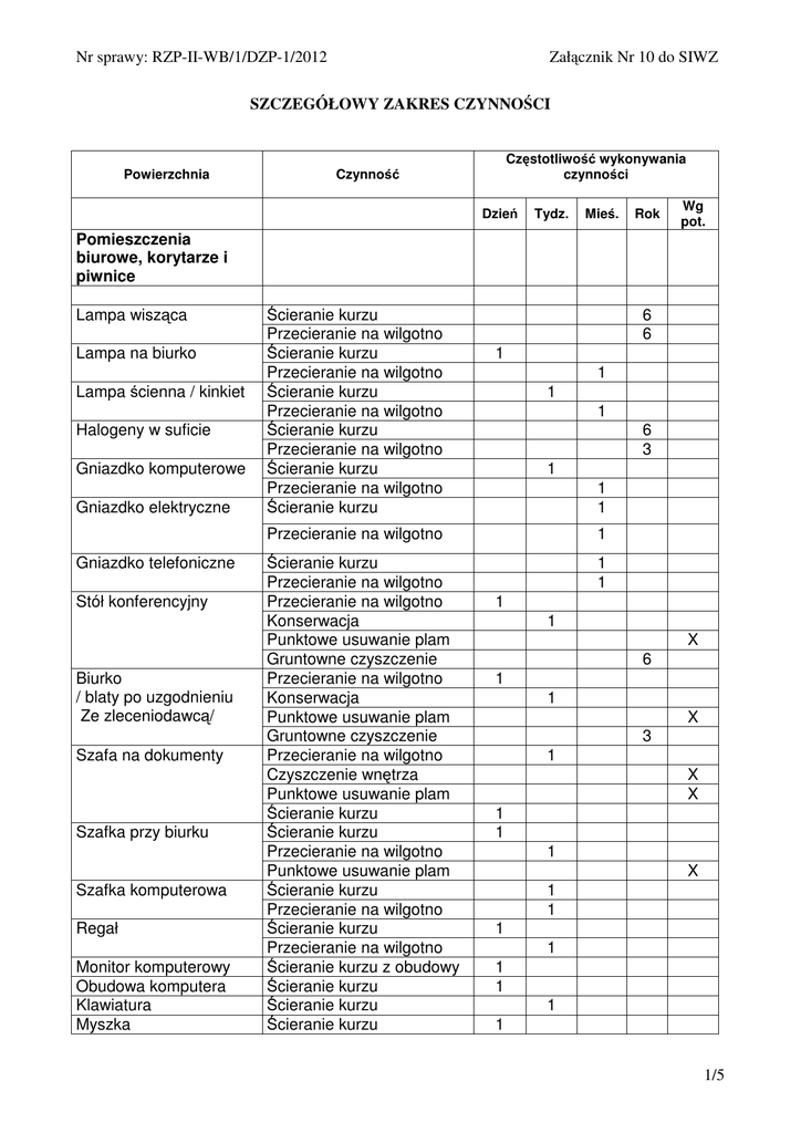 Nr sprawy: RZP-II-WB/1/DZP-1/2012 Zał cznik Nr 10 do SIWZ SZCZEGÓŁOWY ZAKRES CZYNNO CI Powierzchnia Cz stotliwo wykonywania czynno ci Czynno Dzie Tydz. Mie . Rok Pomieszczenia biurowe, korytarze i piwnice Lampa wisz ca Lampa na biurko Lampa cienna / kinkiet Halogeny w suficie Gniazdko komputerowe Gniazdko elektryczne Gniazdko telefoniczne Stół konferencyjny Biurko / blaty po uzgodnieniu Ze zleceniodawc / Szafa na dokumenty Szafka przy biurku Szafka komputerowa Regał Monitor komputerowy Obudowa komputera Klawiatura Myszka cieranie kurzu Przecieranie na wilgotno cieranie kurzu Przecieranie na wilgotno cieranie kurzu Przecieranie na wilgotno cieranie kurzu Przecieranie na wilgotno cieranie kurzu Przecieranie na wilgotno cieranie kurzu 6 6 1 1 1 1 1 1 cieranie kurzu Przecieranie na wilgotno Przecieranie na wilgotno Konserwacja Punktowe usuwanie plam Gruntowne czyszczenie Przecieranie na wilgotno Konserwacja Punktowe usuwanie plam Gruntowne czyszczenie Przecieranie na wilgotno Czyszczenie wn trza Punktowe usuwanie plam cieranie kurzu cieranie kurzu Przecieranie na wilgotno Punktowe usuwanie plam cieranie kurzu Przecieranie na wilgotno cieranie kurzu Przecieranie na wilgotno cieranie kurzu z obudowy cieranie kurzu cieranie kurzu cieranie kurzu 1 1 1 1 6 1 1 1 1 1 1 1 1 6 3 1 1 Przecieranie na wilgotno 1 Wg pot. 1 1 1 3 X X X X X 1 1 1/5 Nr sprawy: RZP-II-WB/1/DZP-1/2012 Powierzchnia Zał cznik Nr 10 do SIWZ Cz stotliwo wykonywania czynno ci Czynno Dzie Podkładka pod mysz Telefon Wł cznik wiatła Wywietrznik w suficie Znak ewakuacyjny wisz cy Rury i wentylacje Drzwiczki skrzynek elektrycznych Kaloryfer Parapet Wieszak na ubrania Kosz na miecie Krzesła tapicerowane Krzesła obrotowe Krzesła w salach konferencyjnych Stoły w salach konferencyjnych Obraz cienny Przeszklenia Wykładzina tekstylna Okna w pom. nr 11, 20 i sekretariaty na I p. Okna pozostałe Drzwi cieranie kurzu cieranie kurzu cieranie kurzu Przecieranie na wilgotno cieranie kurzu Przecieranie na wilgotno cieranie kurzu Przecieranie na wilgotno Punktowe usuwanie plam cieranie kurzu Przecieranie na wilgotno cieranie kurzu Przecieranie na wilgotno cieranie kurzu Przecieranie na wilgotno cieranie kurzu Przecieranie na wilgotno Opró nianie Wymiana worka Mycie i dezynfekcja cieranie kurzu Usuwanie plam z tapicerki Gruntowne czyszczenie cieranie kurzu Usuwanie plam z tapicerki Gruntowne czyszczenie cieranie kurzu Usuwanie plam z tapicerki Gruntowne czyszczenie cieranie kurzu Punktowe usuwanie plam cieranie kurzu Przecieranie na wilgotno cieranie kurzu Przecieranie na wilgotno Punktowe usuwanie plam Odkurzanie Punktowe usuwanie plam Mycie okien 1 1 1 1 1 1 1 1 1 1 6 6 3 1 1 1 x 2 1 2 1 2 1 1 x x x x 1 1 x x 1 1 x 1 1 1 Wg pot. x 1 Mycie okien Mycie drzwi Tydz. Mie . Rok 4 x x 3 x x 2/5 Nr sprawy: RZP-II-WB/1/DZP-1/2012 Powierzchnia Zał cznik Nr 10 do SIWZ Czynno Cz stotliwo wykonywania czynno ci Dzie Drzwi Posadzki: parkiet, lastriko i marmur Tydz. Mie . Punktowe usuwanie plam Rok Wg pot. x Przecieranie klamki 1 Mycie 1 Czyszczenie 1 Toalety i kuchnie Pisuar Mycie 1 Muszla wc z uzupełnieniem kostek zapachowych do WC Przecieranie przycisku spłuczki Dezynfekcja 1 Mycie 1 Czyszczenie szczotki WC 1 Mycie 1 Dezynfekcja 1 Suszarka Mycie 1 Pojemnik na mydło i papier 1 Lustro Mycie Uzupełnianie mydła i papieru Mycie Drzwi drewniane Punktowe usuwanie plam Umywalka, zlew, bateria Posadzka 1 1 x Mycie drzwi 1 Przecieranie klamki 1 Mycie r czne/maszynowe 1 Dezynfekcja 1 Czyszczenie Kosz na miecie x 1 Opró nianie 1 Wymiana worka 1 Mycie i dezynfekcja Wentylator wyci gowy Przecieranie na wilgotno x 1 3/5 Nr sprawy: RZP-II-WB/1/DZP-1/2012 Powierzchnia Trawniki Zakres czynno ci Koszenie Podlewanie* Wygrabienie zanieczyszcze Nawo enie Kwiaty – ró e utrzymanie Drzewa, krzewy ywopłot Teren wokół budynku wraz z parkingiem i 4 wyznaczonymi kopertami przy ul. Canaletta Donice Odtworzenie cz ci zniszczonych Jesienne grabienie li ci Podlewanie* Ci cia piel gnacyjne Usuwanie przekwitłych kwiatostanów Ci cia piel gnacyjne** W patio wewn trznym Na zewn trz budynku Ci cie formuj ce Zał cznik Nr 10 do SIWZ Cz stotliwo wykonywania czynno ci Dzie Tydz. Mie . 1 Rok 1 Wg pot. x 1 2 1 1 2 x 1 2 1 1+1*** 2 Zbieranie mieci 1 Zamiatanie 1 Usuwanie zabrudze punktowych Od nie anie x x Posypywanie sol lub piaskiem Skuwanie lodu x Wywóz niegu x Obsadzanie ro linami Usuwanie przekwitłych kwiatostanów x 3 1 4/5 Nr sprawy: RZP-II-WB/1/DZP-1/2012 Zał cznik Nr 10 do SIWZ Podlewanie* Powierzchnia Zjazd do gara u Rynny i rury spustowe Schody do budynku 1 Cz stotliwo wykonywania czynno ci Zakres czynno ci Utrzymanie czysto ci, od nie anie, posypywanie sol , piaskiem, skuwanie lodu, wywóz niegu Czyszczenie kratki odpływowej Czyszczenie Dzie Czyszczenie w kratkach rewizyjnych Od strony ul. Senatorskiej, od strony ul. Canaletta, w patio (razem 5 szt.) - czyszczenie Od nie anie Impregnacja powierzchni 1 Tydz. Mie . Rok Wg pot. x 1 1 x 1 x 1 x 2 * w zale no ci od warunków atmosferycznych. ** przez ci cia piel gnacyjne drzew i krzewów, Zamawiaj cy rozumie ci cia w razie potrzeby, zapewniaj ce bezpiecze stwo tj. usuwanie z koron drzew i krzewów gał zi suchych, słabych, zasłaniaj cych widoczno , utrudniaj cych poruszanie si na jezdni, chodniku lub parkingu oraz usuni cie gał zi złamanych lub rozłamanych w sytuacjach nieprzewidzianych, np. burza, wichura. *** drugie ci cie w przypadku usuwania uszkodze spowodowanych warunkami atmosferycznymi. 5/5
