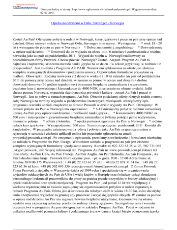 Dane pochodzą ze strony: http://www.ogloszenia.wirtualnaskandynawia.pl/. Wygenerowano dnia: 02-03-2017. Opieka nad dziećmi w Oslo, Stavanger - Norwegia Zostań Au Pair! Oferujemy pobyty u rodzin w Norwegii, kursy językowe i prace au pair przy opiece nad dziećmi. Ofery róznych rodzin w Norwegii Oslo, Stavanger inne rejony. Wymagania: * wiek 18 - 29 lat ( wymagane do pobytu au pair w Norwegii) * Dobra znajomość j. angielskiego * Doświadczenie w opiece nad dziećmi * Gotowość do do wyjazdu na okres min. 6 miesiecy i zamieszkania z rodziną norweską jako au pair od października 2011 Wyjazd do rodzin w Norwegii realizowany za pośrednictwem firmy Prowork. Chcesz poznać Norwegię? Zostań Au pair. Program Au Pair to najtańsza i najbardziej skuteczna metoda nauki języka na co dzień – w szkole językowej, w rodzinie i z przyjaciółmi! Jest to oferta z Programu AU PAIR. Warunkiem aplikowania na oferte jest złożenie kompletu wymaganych dokumentów i podpisania umowy. Odpowiednie formularze przysyłane są mailem. Obowiązki: Rodziny norweska z 2 dzieci w wieku 6 i 10 lat zatrudni Au pair od października 2011 do pomocy przy opiece nad dziećmi. w zamian za pomoc w opiece nad dziecmi+ drobne obowiazki domowe (30 godzin tygodniowo ) otrzymasz bezplatne zamieszkanie i wyzywienie, bezplatny kurs j. norweskiego i kieszonkowe do 4000 NOK miesiecznie na własne wydatki. Jeślii chcesz poznac Norwegię, wspaniała skandynawska przyrode i kulturę - zostań Au Pair i pracuj w Norwegii. Jest to pobyt w ramach programu Au Pair. Obecnie posiadamy oferty róznych rodzin z terenu całej Norwegii na terminy wyjazdu w październiku i nastepnych miesiącach. szczególowy opis programu i warunki udziału znajdziesz na stronie Prowork w dziale wyjazdy Au Pair. Oferujemy: W ramach pobytu Au Pair w Norwegii ma zapewnione: * 6-12 miesięczny pobyt w rodzinie norweskiej i pracę Au Pair przy opiece nad dziećmi i możliwość nauki języka . * Kieszonkowe 4000 NOK/ ok. 500 euro / miesięcznie + gwarantowane bezpłatne zamieszkanie (własny pokój) i pełne wyżywienie, internet w pokoju * odbiór z lotniska * opieka partnerskiego biura Au Pair w Norwegii * rodzina opłaca kurs językowy Wynagrodzenie: 500 euro Termin rozpoczęcia: październik 2011 Kontakt dla kandydatów: W przypadku zainteresowania ofertą i pobytem jako Au Pair za granicą prosimy o rejestrację w serwisie i złożenie aplikacji online lub przesłanie zgłoszenia na email: [email protected] . Po otrzymaniu zgłoszenia, prześlemy potwierdzenie i formularze niezbędne do udziału w Programie Au Pair. Uwaga: Warunkiem udziału w programie au pair jest złożenie kompletu wymaganych formularzy i podpisanie umowy. Kontakt: tel 022 323 63 35 w. 23, 502 731 065 , skype: prowork_info Więcej informacji dot. Programu Au Pair na www.prowork.com.pl Zobacz też inne oferty: Au Pair USA, Au Pair Francja, Au Pair Anglia, Au Pair Holandia, Au pair Hiszpania , Au Pair Islandia i inne kraje Prowork Biuro czynne: pon. – pt. w godz. 9.00 - 17.00 Adres biura: ul. Smolna 38/8 00-375 Warszawa tel.: + 48 (0) 22 323 63 35 tel.: + 48 (0) 22 828 31 34 fax.: +48 (0) 22 323 63 36 tel kom: +48 (0) 502 095 536 recepcja e-mail: [email protected] O firmie Prowork Firma Prowork z siedzibą w Warszawie działa od 1999 roku i specjalizuje się w organizowaniu wyjazdów edukacyjnych Au Pair do USA i wielu krajów w Europie oraz świadczy usługi doradztwa personalnego i rekrutacji pracowników do pracy za granicą przede wszystkim w branzy edukacyjnej i opieki nad dziećmi oraz opieki medycznej. Program Au Pair – od ponad 12 lat we współpracy z wieloma organizacjami na świecie zajmujemy się organizowaniem pobytów u rodzin zagranicą w ramach Programu Au Pair. Oferta jest skierowana dla młodych osób w wieku 18-30 lat, które chciałyby tanio i bezpiecznie wyjechać za granicę aby pracować i uczyć się języków obcych. W zamian za pomoc w opiece nad dziećmi Au Pair ma zagwarantowane bezpłatne utrzymanie, kieszonkowe na własne wydatki oraz zazwyczaj opłacony przelot do rodziny i kursy językowe. Szczególowy opis i warunki uczestnictwa w programie Au pair dostępny jest w zakładce Program Au Pair. Pobyt w rodzinie to unikalna możliowość poznania kultury i codziennego życia w danym kraju i biegłe opanowanie języka Dane pochodzą ze strony: http://www.ogloszenia.wirtualnaskandynawia.pl/. Wygenerowano dnia: 02-03-2017. obcego. Za naszym pośrednictem wyjechało juz ponad 3000 osób na pobyty Au pair u rodzin w USA, Wielkiej Brytanii, Francji, Niemczech, Szwajcarii, Norwegii i innych krajach Doradztwo personalne – oferujemy profesjonalne usługi rekrutacji pracowników dla pracodawców w kraju i za granicą. ► praca za granicą - regularnie współpracujemy za pracodawcami za granicą, przede wszystkim w Wielkiej Brytanii i Norwegii. Większośc projektów jest realizowana dla pracodawców z branży: edukacja i opieka and dziećmi, opieka medyczna oraz branża techniczna. ► praca w kraju - Specjalizujemy się w rekrutacji pracowników dla firm i rodzin w Polsce w następujących branżach Edukacja i opieka nad dziećmi - rekrutacja nauczycieli do szkół i przedzkoli oraz personel do prywatnej opieki nad dziećmi: nianie, guwernantki, opiekunki do dzieci. Specjalizujemy się rekrutacji niań i guwernantek z wyższym wykształceniem i znających biegle języki obce. Opieka medyczna - opiekunowie i pielęgniarki do pracy w szpitalach i ośrodkach medycznych oraz do prywatnej opieki w domu. Zapewniamy przyjazną profesjonalną obsługę w j. polskim i angielskim zarówno dla kandydatów jak i pracodawców. Nasi konsultanci służą pomocą na kazym etapie rekrutacji. Dane: Miejscowość: Stavanger Region: Norwegia