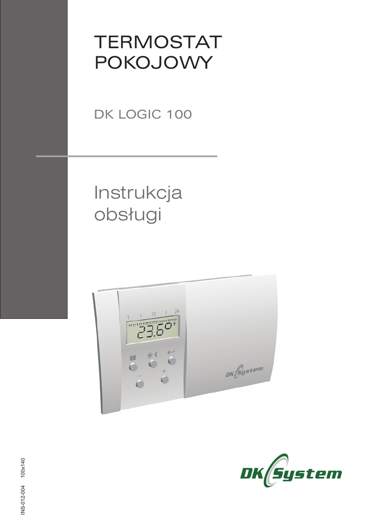 TERMOSTAT POKOJOWY DK LOGIC 100 INS-012-004 100x140 Instrukcja obs³ugi Termostat pokojowy DK LOGIC 100 Spis treści 1. Opis termostatu.................................................................................... 3 2. Opis elementów wyświetlacza............................................................. 3 3. Opis przycisków.................................................................................... 4 4. Montaż termostatu................................................................................ 4 5. Funkcje termostatu............................................................................... 5 6. Pierwsze uruchomienie........................................................................ 6 7. Tryb PROG - programowanie do pracy automatycznej..................... 6 7.1 Program Pr.1 i Pr. 2............................................................................ 7 7.2 Program Pr. 3 - ustawienia indywidualne........................................... 7 7.3 Przykład - programowanie pracy automatycznej............................... 9 8. Krótkotrwała zmiana temperatury w trybie automatycznym............ 11 9. Tryb MANU - praca ręczna................................................................... 12 10. Funkcja TEST........................................................................................ 12 11. Funkcja ochrony przed zamrożeniem................................................ 12 12. Tryb CLO - nastawianie aktualnej godziny i dnia.............................. 13 13. Tryb PAr1 - parametr widoczny na ekranie głównym....................... 13 14. Tryb PAr2 - wersja programu i RESET............................................... 13 15. Ustawienie domyślnej temperatury dziennej i nocnej...................... 14 16. Funkcja OFF.......................................................................................... 15 17. Wymiana baterii................................................................................... 15 18. Usterki................................................................................................... 15 19. Dane techniczne................................................................................... 16 20. Tabela programów............................................................................... 17 21. Informacja o recyklingu....................................................................... 19 2 Termostat pokojowy DK LOGIC 100 1. Opis termostatu Termostat pokojowy DK LOGIC 100 przeznaczony jest do automatycznej regulacji temperatury w pomieszczeniu, poprzez włączanie i wyłączanie kotła. Termostat posiada wyjście przekaźnikowe, które daje sygnał włącz / wyłącz po przekroczeniu wartości ustawionej temperatury. Urządzenie posiada następujące funkcje: q możliwość ustawienia różnych programów na każdy dzień tygodnia q dwa programy fabryczne q dwie temperatury do wyboru - dzienna i nocna q sześć okresów grzewczych w ciągu doby q łatwy i intuicyjny sposób programowania q możliwość krótkotrwałych zmian temperatury ogrzewania q łatwy montaż q ochrona przed zamrożeniem q regulacja ogrzewania co 0,5 °C q wielofunkcyjny wyświetlacz q podtrzymywanie w pamięci wszystkich ustawień, nawet w sytuacji długotrwałego braku baterii 2. Opis elementów wyświetlacza 1 2 3 AUTO MANU PROG P T 8 7 6 5 4 1. 2. 3. 4. 5. 6. 7. 8. Migający punkt wskazujący bieżącą godzinę Wskazanie aktualnie używanej funkcji AUTO, MANU, PROG Symbol pracy w trybie ochrony przeciw zamarzaniu Wyświetlana temperatura lub czas Symbol pracującego kotła Symbol utrzymywania temperatury obniżonej (nocnej) Symbol utrzymywania temperatury komfortowej (dziennej) Graficzne przedstawienie ustawionego programu Rys. 1 Elementy wyświetlacza 3 Termostat pokojowy DK LOGIC 100 3. Opis przycisków 1 2 3 4 1. Menu 2. Ustawienie temperatur (komfortowej / obniżonej), praca w trybie ręcznym, praca w trybie ochrony przeciw zamarzaniu 3. Zatwierdzenie; dodatkowo w trybie AUTO po każdym kolejnym naciśnięciu wyświetlana jest ustawiona temperatura, aktualna godzina oraz dzień tygodnia. 4. Zmiana funkcji lub nastawianych wartości. Rys. 2 Opis przycisków 4. Montaż termostatu Termostat DK LOGIC 100 należy umieścić w miejscu nie narażonym na działanie innych źródeł ciepła (grzejnik, kominek, etc), mających wpływ na dokładność odczytu temperatury w pomieszczeniu. Urządzenie składa się z dwóch części: przedniej - mikroprocesora oraz tylnej - łącznika. 1. Oddzielić przednią część termostatu od części tylnej. 2. Tylną część zamontować bezpośrednio na ścianie. 3. Zdjąć osłonę kostki łącznikowej i zamontować w niej przewód (2 x 0,75 mm2) łączący termostat z kotłem. 4. Wewnątrz przedniej części umieścić dwie baterie alkaiczne 2 x 1,5 V, typ AA / LR6. 5. Złożyć ze sobą część przednią i tylną - termostat gotowy jest do programowania. 4 Termostat pokojowy DK LOGIC 100 4. Montaż termostatu (ciąg dalszy). Kocioł lub sterownik kotła DK LOGIC 100 Termostat pokojowy 2 1 Rys. 3 Schemat podłączenia termostatu DK LOGIC 100 do kotła lub sterownika kotła ! Uwaga: Po podłączeniu termostatu do sterownika kotła należy w sterowniku włączyć opcję “obsługa termostatu pokojowego”. 5. Funkcje termostatu AUTO Tryb automatyczny - termostat pracuje według nastawionego programu zgodnie z nastawionymi temperaturami trybu dziennego i nocnego. MANU Tryb manualny - umożliwia zmianę temperatury grzania bez konieczności ingerowania w ustawiony program. CLO AUTO MANU Tryb ustawiania godziny i dnia. PROG Tryb programowania zakresów czasowych dla temperatury dziennej i nocnej. PROG PAr1 Tryb ustawiania parametru widocznego na stałe (godzina lub temperatura). 5 Termostat pokojowy DK LOGIC 100 5. Funkcje termostatu (ciąg dalszy) PAr2 Numer programu i RESET. OFF Wyłączenie pracy termostatu. 6. Pierwsze uruchomienie 1. Po zainstalowaniu baterii, na wyświetlaczu