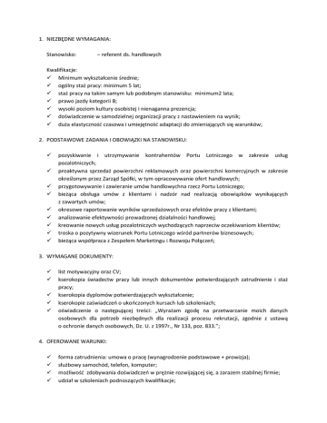 1. NIEZBĘDNE WYMAGANIA: Stanowisko: – referent ds. handlowych Kwalifikacje:  Minimum wykształcenie średnie;  ogólny staż pracy: minimum 5 lat;  staż pracy na takim samym lub podobnym stanowisku: minimum2 lata;  prawo jazdy kategorii B;  wysoki poziom kultury osobistej i nienaganna prezencja;  doświadczenie w samodzielnej organizacji pracy z nastawieniem na wynik;  duża elastyczność czasowa i umiejętność adaptacji do zmieniających się warunków; 2. PODSTAWOWE ZADANIA I OBOWIĄZKI NA STANOWISKU:          pozyskiwanie i utrzymywanie kontrahentów Portu Lotniczego w zakresie usług pozalotniczych; proaktywna sprzedaż powierzchni reklamowych oraz powierzchni komercyjnych w zakresie określonym przez Zarząd Spółki, w tym opracowywanie ofert handlowych; przygotowywanie i zawieranie umów handlowychna rzecz Portu Lotniczego; bieżąca obsługa umów z klientami i nadzór nad realizacją obowiązków wynikających z zawartych umów; okresowe raportowanie wyników sprzedażowych oraz efektów pracy z klientami; analizowanie efektywności prowadzonej działalności handlowej; kreowanie nowych usług pozalotniczych wychodzących naprzeciw oczekiwaniom klientów; troska o pozytywny wizerunek Portu Lotniczego wśród partnerów biznesowych; bieżąca współpraca z Zespołem Marketingu i Rozwoju Połączeń; 3. WYMAGANE DOKUMENTY:      list motywacyjny oraz CV; kserokopia świadectw pracy lub innych dokumentów potwierdzających zatrudnienie i staż pracy; kserokopia dyplomów potwierdzających wykształcenie; kserokopie zaświadczeń o ukończonych kursach lub szkoleniach; oświadczenie o następującej treści: „Wyrażam zgodę na przetwarzanie moich danych osobowych dla potrzeb niezbędnych dla realizacji procesu rekrutacji, zgodnie z ustawą o ochronie danych osobowych, Dz. U. z 1997r., Nr 133, poz. 833.”; 4. OFEROWANE WARUNKI:     forma zatrudnienia: umowa o pracę (wynagrodzenie podstawowe + prowizja); służbowy samochód, telefon, komputer; możliwość zdobywania doświadczeń w prężnie rozwijającej się, a zarazem stabilnej firmie; udział w szkoleniach podnoszących kwalifikacje; Osoby zainteresowane prosimy o składanie ofert osobiście, korespondencyjnie na adres: Port Lotniczy „Rzeszów – Jasionka” Sp. z o.o. 36-002 Jasionka lub mailem: [email protected] dopiskiem „Oferta pracy na stanowisko referenta ds. handlowych z dn.13 lutego 2017r.”. w terminie do dnia 17.02.2017 r. Decyduje data wpływu oferty do sekretariatu Spółki. W przypadku dostarczenia danych osobowych innych niż wymagane w ogłoszeniu lub nie załączenia oświadczenia o wyrażeniu zgody na przetwarzanie tych danych osobowych, zostaną one komisyjnie zniszczone. Osoby ubiegające się o zatrudnienie mają prawo dostępu do tych danych i prawo do ich poprawiania, zgodnie z ustawą o ochronie danych osobowych. Osoby spełniające wymagania formalne określone w ogłoszeniu zostaną powiadomione telefonicznie o terminie i miejscu kolejnego etapu rekrutacji. Osoby, które nie spełniają wymagań formalnych nie będą informowane.