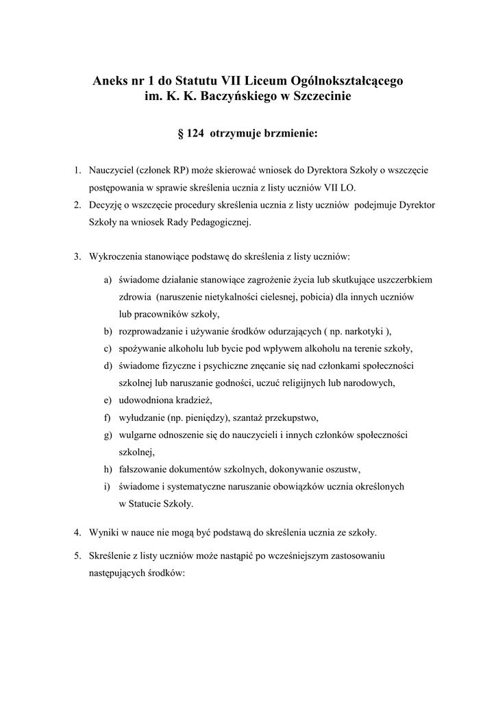 Aneks nr 1 do Statutu VII Liceum Ogólnokształcącego im. K. K. Baczyńskiego w Szczecinie § 124 otrzymuje brzmienie: 1. Nauczyciel (członek RP) moŜe skierować wniosek do Dyrektora Szkoły o wszczęcie postępowania w sprawie skreślenia ucznia z listy uczniów VII LO. 2. Decyzję o wszczęcie procedury skreślenia ucznia z listy uczniów podejmuje Dyrektor Szkoły na wniosek Rady Pedagogicznej. 3. Wykroczenia stanowiące podstawę do skreślenia z listy uczniów: a) świadome działanie stanowiące zagroŜenie Ŝycia lub skutkujące uszczerbkiem zdrowia (naruszenie nietykalności cielesnej, pobicia) dla innych uczniów lub pracowników szkoły, b) rozprowadzanie i uŜywanie środków odurzających ( np. narkotyki ), c) spoŜywanie alkoholu lub bycie pod wpływem alkoholu na terenie szkoły, d) świadome fizyczne i psychiczne znęcanie się nad członkami społeczności szkolnej lub naruszanie godności, uczuć religijnych lub narodowych, e) udowodniona kradzieŜ, f) wyłudzanie (np. pieniędzy), szantaŜ przekupstwo, g) wulgarne odnoszenie się do nauczycieli i innych członków społeczności szkolnej, h) fałszowanie dokumentów szkolnych, dokonywanie oszustw, i) świadome i systematyczne naruszanie obowiązków ucznia określonych w Statucie Szkoły. 4. Wyniki w nauce nie mogą być podstawą do skreślenia ucznia ze szkoły. 5. Skreślenie z listy uczniów moŜe nastąpić po wcześniejszym zastosowaniu następujących środków: a) powiadomienie rodziców ucznia niepełnoletniego o zaistniałym zdarzeniu i wszczęciu procedury postępowania w sprawie skreślenia z listy uczniów oraz ucznia pełnoletniego o wszczęciu procedury skreślenia z listy uczniów, b) zasięgnięciu opinii Samorządu Uczniowskiego. 6. Rada Pedagogiczna moŜe podjąć uchwałę o skreśleniu z listy uczniów, nadając decyzji rygor natychmiastowej wykonalności gdy: a) postępowanie ucznia zagraŜa bezpieczeństwu uczniów i pracowników szkoły, b) ma to na celu ochronę innych uczniów przed przemocą i agresją ze strony ucznia, c) postępowanie ucznia moŜe prowadzić do uzaleŜnień, demoralizacji oraz innych przejawów patologii społecznej wśród uczniów szkoły, d) uczeń otrzymał w cyklu szkolnym ( 3 lata ) dwie końcoworoczne oceny naganne zachowania. 7. Skreślenie ucznia z listy uczniów VII LO moŜe nastąpić takŜe, gdy: a) uczeń opuścił bez usprawiedliwienia 70 godzin w danym roku szkolnym. § 125 otrzymuje brzmienie 9 1. Podstawą wszczęcia postępowania przy skreśleniu z listy uczniów szkoły jest stwierdzenie, Ŝe uczeń popełnił wykroczenie stanowiące podstawę do skreślenia. 2. Jeśli zdarzenie jest karane z mocy prawa (KPK), Dyrektor niezwłocznie powiadamia organa ścigania. 3. Dyrektor szkoły, po stwierdzeniu popełnienia przez ucznia wykroczenia, stanowiącego podstawę do jego skreślenia, zwołuje posiedzenie Rady Pedagogicznej. 4. Na Radzie Pedagogicznej musi być sformułowany wniosek o wszczęcie postępowania administracyjnego w sprawie skreślenia ucznia z listy uczniów VII LO. Wniosek moŜe sformułować dyrektor szkoły, wychowawca klasy lub inny nauczyciel szkoły. 5. Konkretna sprawa musi być dogłębnie przedyskutowana podczas posiedzenia RP; muszą być rozpatrzone argumenty za i przeciw skreśleniu ucznia. Cała dyskusja winna być odnotowana w protokole, łącznie z wynikami głosowania. Jeśli większość opowiada się za wszczęciem postępowania, wówczas RP podejmuje uchwałę. 6. Dyrektor wszczyna postępowanie po podjęciu przez radę uchwały. Postępowanie zaczyna się od ustalenia, kto jest stroną we wszczętym postępowaniu i pisemnego zawiadomienia strony o wszczęciu postępowania. Stroną jest pełnoletni uczeń lub rodzice (opiekunowie) ucznia niepełnoletniego. 7. Od chwili zawiadomienia o wszczęciu postępowania, strona bierze czynny udział w kolejnych etapach postępowania (strona ma prawo do składania wyjaśnień). 8. Uczeń ma prawo wskazać swoich rzeczników obrony. Rzecznikiem ucznia moŜe być wychowawca klasy lub pedagog (psycholog) szkolny lub inna wskazana przez niego osoba ( moŜe być spoza szkoły). 9. Dyrektor szkoły ma obowiązek zwrócić się o opinię na temat wszczętego postępowania wobec ucznia do Samorządu Uczniowskiego. Samorząd Uczniowski składa opinię Dyrektorowi Szkoły na piśmie, w terminie 7 dni od otrzymania pisma w sprawie wydania opinii. Opinia włączana jest do akt sprawy. 10. Brak opinii Samorządu Uczniowskiego nie wstrzymuje wykonania uchwały Rady Pedagogicznej. 11. Wychowawca ma obowiązek przedstawić Radzie Pedagogicznej pełną analizę postępowania ucznia jako członka społeczności szkolnej. Informuje o podjętych środkach wychowawczych i dyscyplinujących, rozmowach ostrzegawczych, pomocy psychologiczno-pedagogicznej i zastosowanych określonych regulaminem karach. Podczas przedstawiania analizy, wychowawca zobowiązany jest zachować obiektywność. 12. Po zebraniu wszystkich materiałów dowodowych i informacji w trakcie postępowania, dyrektor szkoły zwołuje kolejną RP, na której członkowie rady zostają z nimi zapoznani (w tym z opinią rzeczników obrony ucznia), a następnie w trakcie głosowania podejmują uchwałę w sprawie skreślenia ucznia z listy uczniów VII LO. 13. Wykonanie uchwały Rada Pedagogiczna powierza Dyrektorowi Szkoły. 14. JeŜeli uczeń nie jest pełnoletni, decyzję o skreśleniu ucznia otrzymują rodzice lub jego prawny opiekun. 15. W przypadku pełnoletniości ucznia, decyzję otrzymuje uczeń, a do rodziców lub prawnego opiekuna kierowane jest pisemne powiadomienie. 16. Decyzja powinna zawierać: - oznaczenie organu administracji państwowej, - datę wydania, - oznaczenie strony lub stron, - powołanie podstawy prawnej, - rozstrzygnięcie, - uzasadnienie faktyczne ( wskazanie faktów uznanych za udowodnione, przedstawienie dowodów) i prawne (wyjaśnienie podstawy prawnej decyzji z przytoczeniem przepisów prawa) art. 107 § 3 Kpa, - po