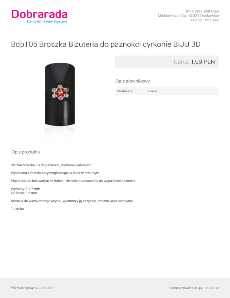 INFOBIS Rafał Głąb Mickiewicza 42a, 43-331 Dankowice +48 601 662 442 Bdp105 Broszka Biżuteria do paznokci cyrkonie BIJU 3D Cena: 1,99 PLN Opis słownikowy Producent i-nails Opis produktu Śliczna broszka 3D do paznokci, zdobiona cyrkoniami. Wykonana z metalu antyalergicznego, w kolorze srebrnym. Płaski spód o łukowatym kształcie - idealnie dopasowany do wypukłości paznokci. Wymiary: 7 x 7 mm. Grubość: 2.2 mm. Broszka do wielokrotnego użytku, wystarczy ją oczyścić i można użyć ponownie. 1 sztuka. Plik wygenerowano: 02-03-2017 Oprogramowanie sklepu: AptusShop INFOBIS Rafał Głąb Mickiewicza 42a, 43-331 Dankowice +48 601 662 442 Galeria Plik wygenerowano: 02-03-2017 Powered by TCPDF (www.tcpdf.org) Oprogramowanie sklepu: AptusShop