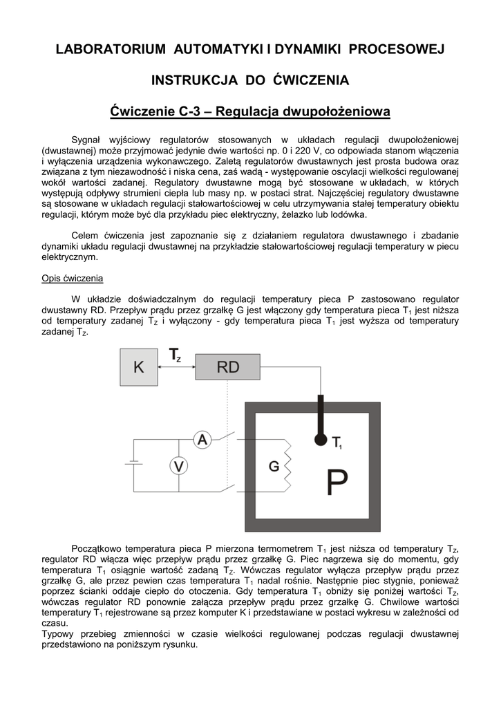 LABORATORIUM AUTOMATYKI I DYNAMIKI PROCESOWEJ INSTRUKCJA DO ĆWICZENIA Ćwiczenie C-3 – Regulacja dwupołożeniowa Sygnał wyjściowy regulatorów stosowanych w układach regulacji dwupołożeniowej (dwustawnej) może przyjmować jedynie dwie wartości np. 0 i 220 V, co odpowiada stanom włączenia i wyłączenia urządzenia wykonawczego. Zaletą regulatorów dwustawnych jest prosta budowa oraz związana z tym niezawodność i niska cena, zaś wadą - występowanie oscylacji wielkości regulowanej wokół wartości zadanej. Regulatory dwustawne mogą być stosowane w układach, w których występują odpływy strumieni ciepła lub masy np. w postaci strat. Najczęściej regulatory dwustawne są stosowane w układach regulacji stałowartościowej w celu utrzymywania stałej temperatury obiektu regulacji, którym może być dla przykładu piec elektryczny, żelazko lub lodówka. Celem ćwiczenia jest zapoznanie się z działaniem regulatora dwustawnego i zbadanie dynamiki układu regulacji dwustawnej na przykładzie stałowartościowej regulacji temperatury w piecu elektrycznym. Opis ćwiczenia W układzie doświadczalnym do regulacji temperatury pieca P zastosowano regulator dwustawny RD. Przepływ prądu przez grzałkę G jest włączony gdy temperatura pieca T1 jest niższa od temperatury zadanej TZ i wyłączony - gdy temperatura pieca T1 jest wyższa od temperatury zadanej TZ. Początkowo temperatura pieca P mierzona termometrem T1 jest niższa od temperatury TZ, regulator RD włącza więc przepływ prądu przez grzałkę G. Piec nagrzewa się do momentu, gdy temperatura T1 osiągnie wartość zadaną TZ. Wówczas regulator wyłącza przepływ prądu przez grzałkę G, ale przez pewien czas temperatura T1 nadal rośnie. Następnie piec stygnie, ponieważ poprzez ścianki oddaje ciepło do otoczenia. Gdy temperatura T1 obniży się poniżej wartości TZ, wówczas regulator RD ponownie załącza przepływ prądu przez grzałkę G. Chwilowe wartości temperatury T1 rejestrowane są przez komputer K i przedstawiane w postaci wykresu w zależności od czasu. Typowy przebieg zmienności w czasie wielkości regulowanej podczas regulacji dwustawnej przedstawiono na poniższym rysunku. Podczas wykonywania ćwiczenia należy notować zmiany natężenia prądu elektrycznego płynącego przez grzałkę oraz obserwować zmiany temperatury w piecu w czasie w procesie regulacji stałowartościowej temperatury. Po wykonaniu ćwiczenia w sprawozdaniu należy: narysować zmienność w czasie temperatury pieca T1 i natężenia prądu elektrycznego A przepływającego przez grzałkę, wyznaczyć średnią temperaturę pieca całkową dla przedziału czasowego, w którym praca układu była cykliczna, na podstawie wykresu przebiegu zmienności w czasie wielkości regulowanej wyznaczyć czas opóźnienia układu oraz stałą czasowa obiektu regulacji, przeprowadzić dyskusję dotyczącą obserwowanych przebiegów regulacji oraz wpływu wielkości obiektu regulacji. Zakres wiedzy wymaganej do zaliczenia kolokwium końcowego: 1. Regulacja automatyczna i struktury układów regulacji. 2. Regulatory dwu- i trójstawne, zasada ich działania. 3. Własności statyczne i dynamiczne układów sterowania i regulacji. 4. Własności dynamiczne obiektów regulacji. Literatura zalecana: 1. Chorowski B., Werszko M., "Mechaniczne urządzenia automatyki", WNT 1990. 2. Kostro J., "Elementy, urządzenia i układy automatyki", WSiP 1983 2015